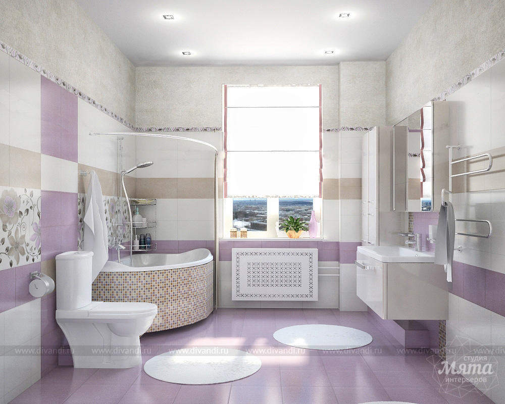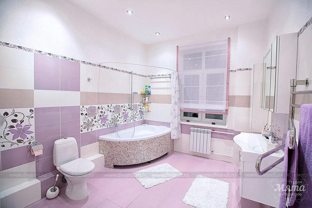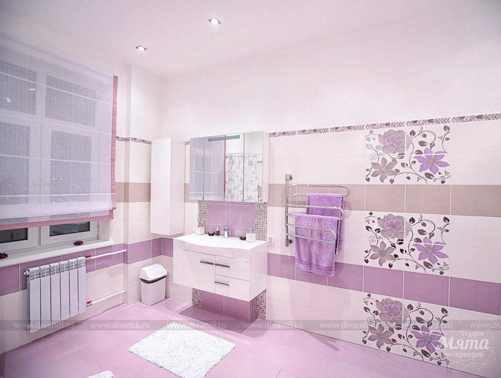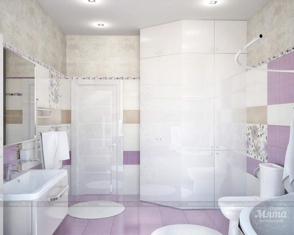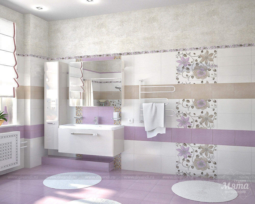 - светлые пастельные тона,преобладание сиреневого цвета в сочетании с бежевым и белым