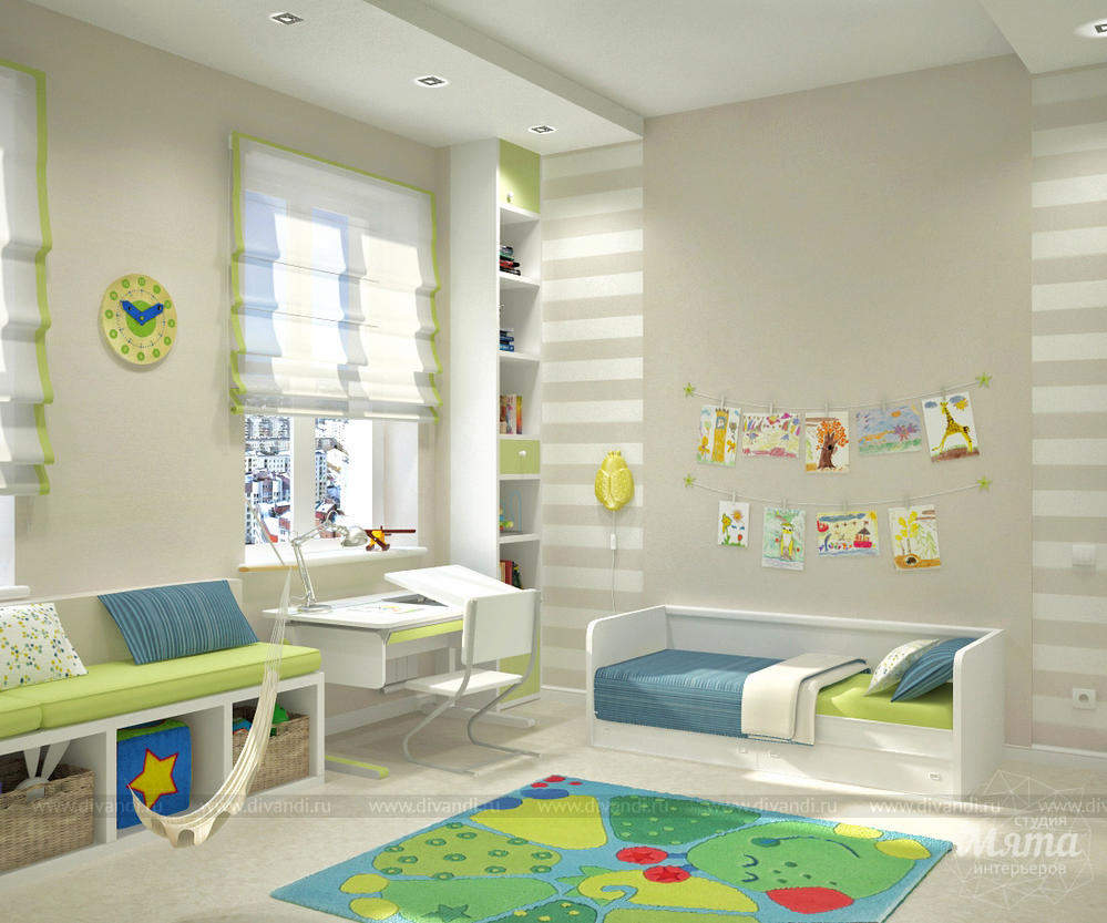 2) в детской комнате разместить вместительный стеллаж во всю стену