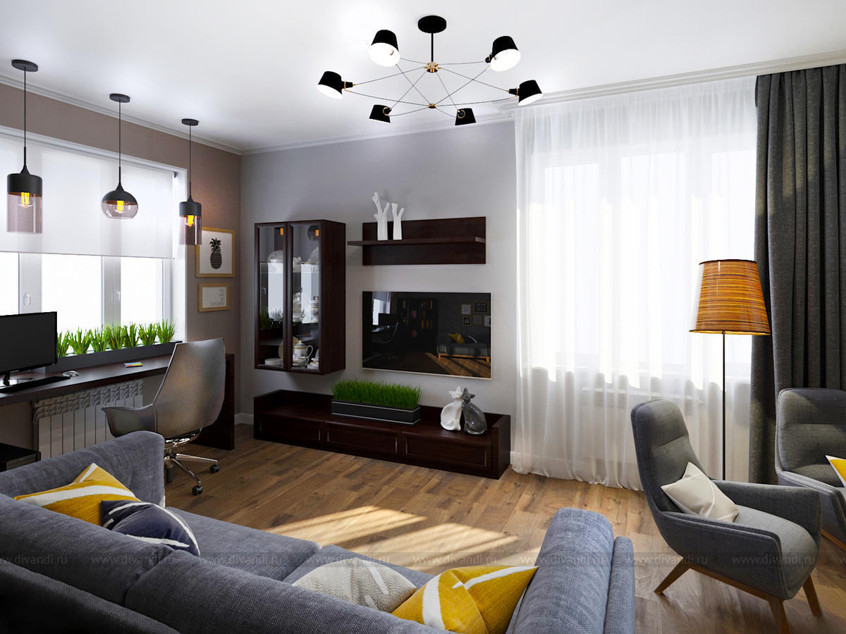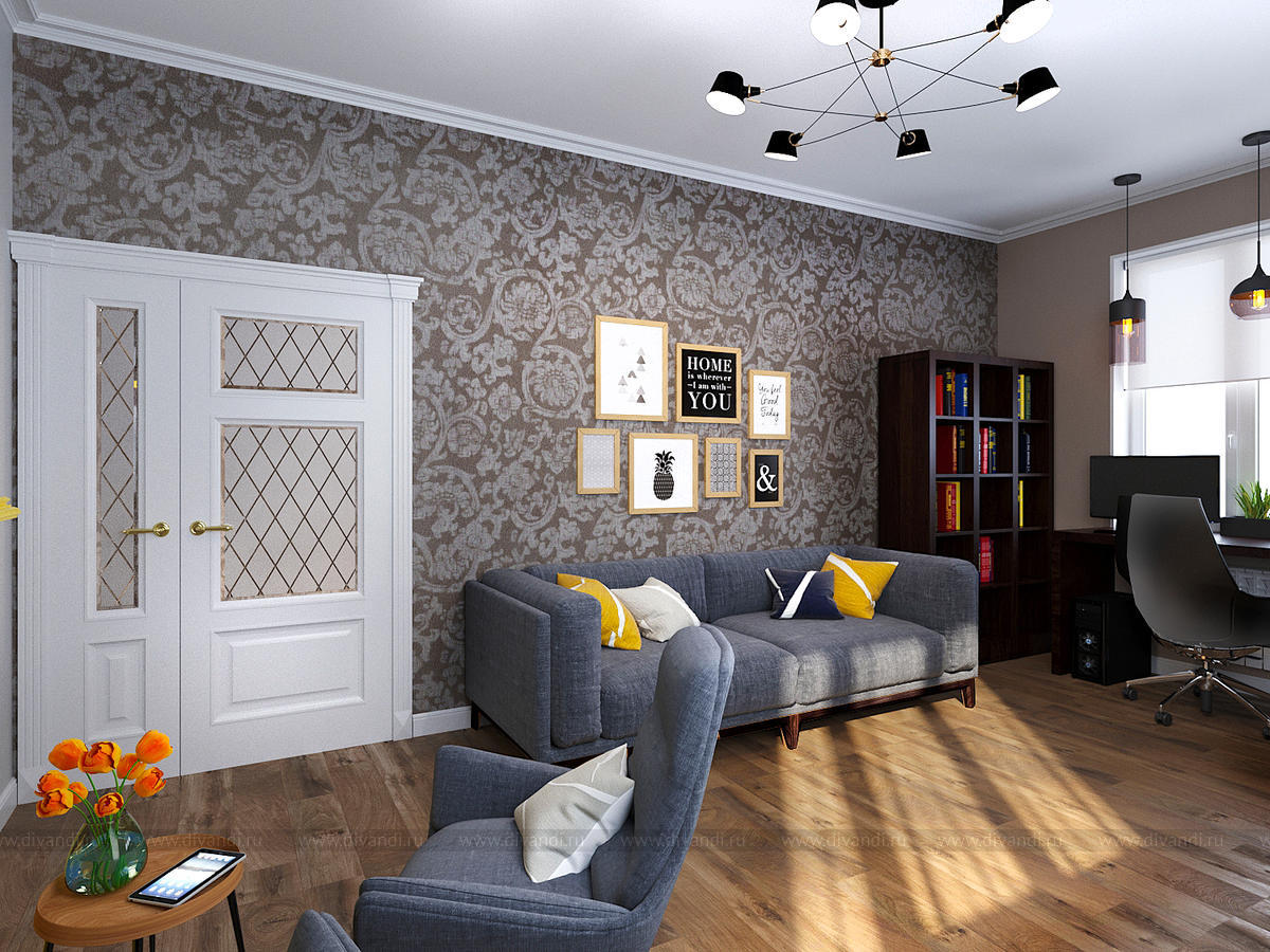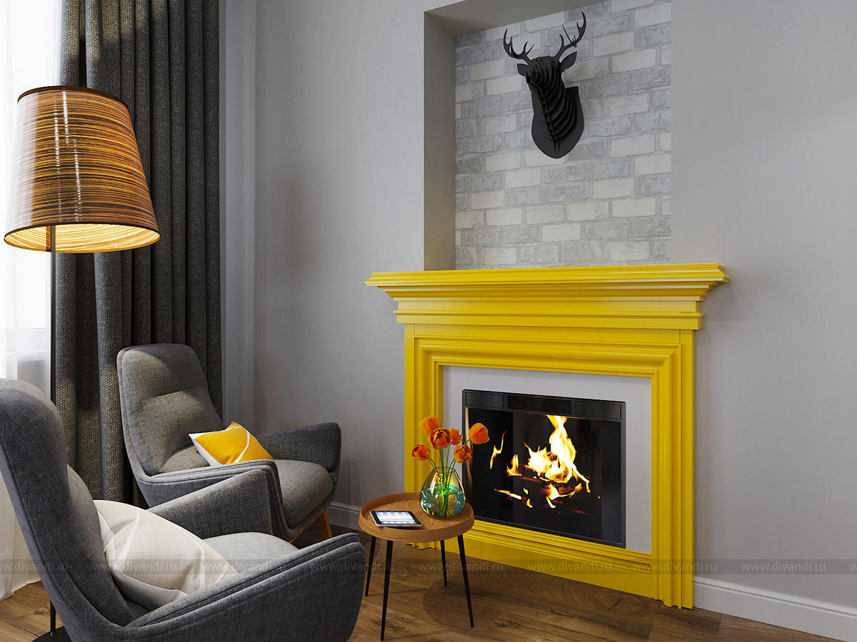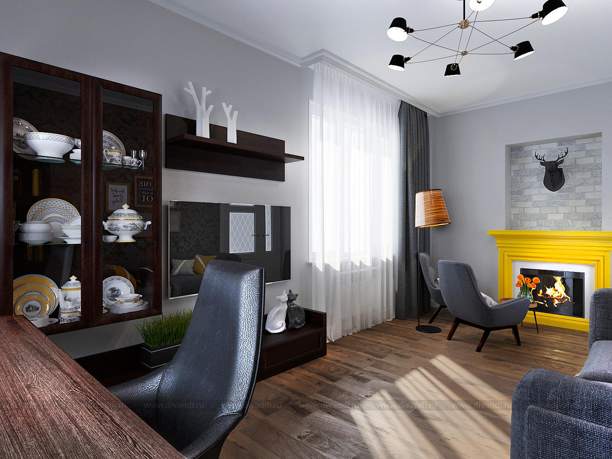 Разрабатывали комнату - гостиную для семьи из 4 человек.Пожелания хозяев квартиры - скандинавский стиль с элементами классики, камин, большой рабочий стол.
