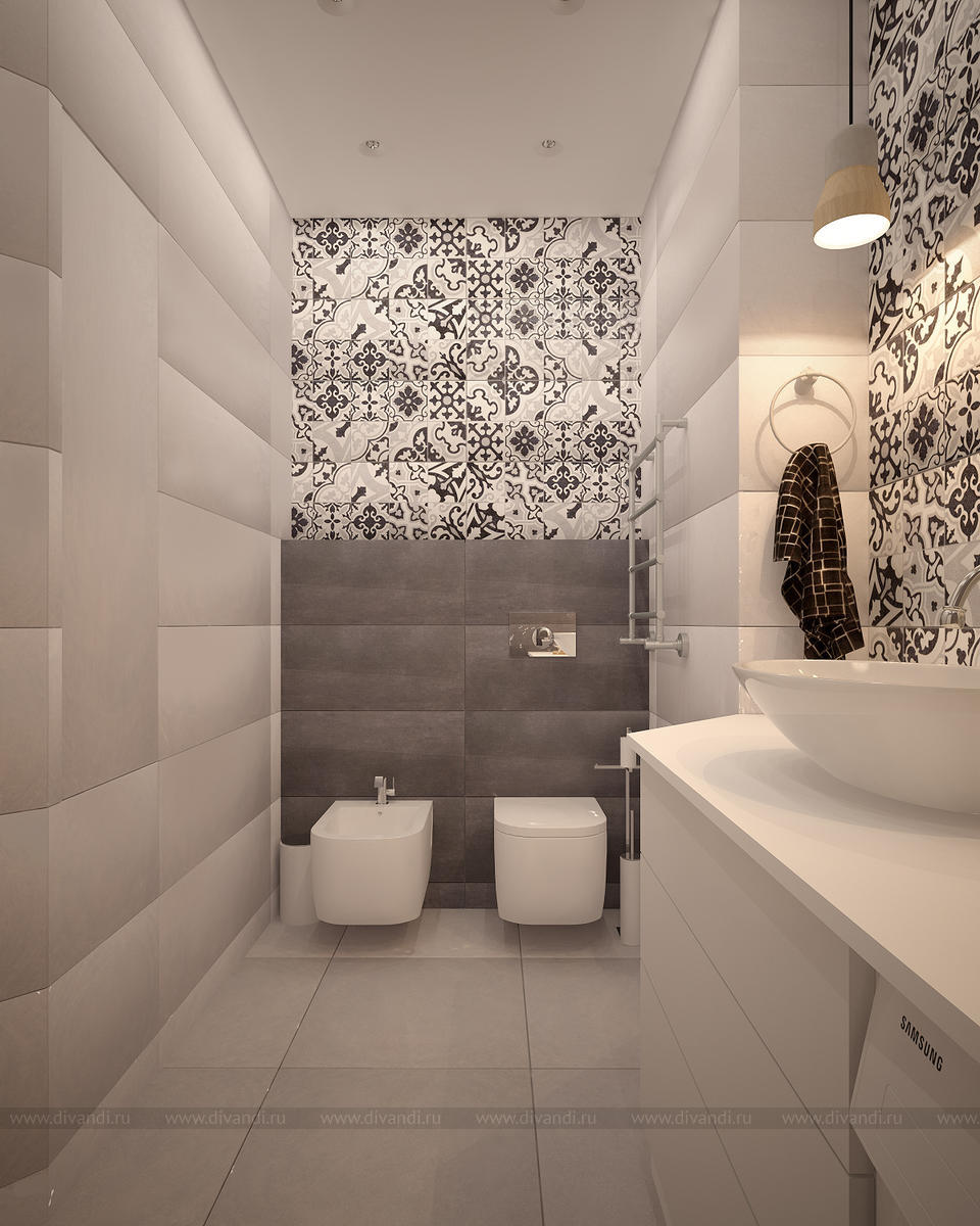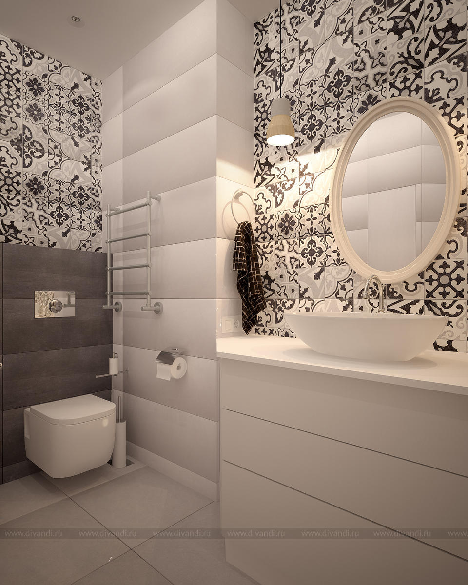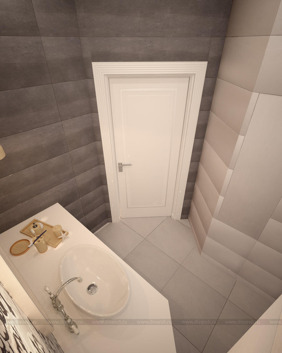 Голубоватый оттенок, использованный в холле, один из наиболее сбалансированных и гармоничных. Именно по этой причине один их самых подходящих тонов для жилых помещений. Ванна выполненна в монохромных тонах, но и с нетипичным декором.