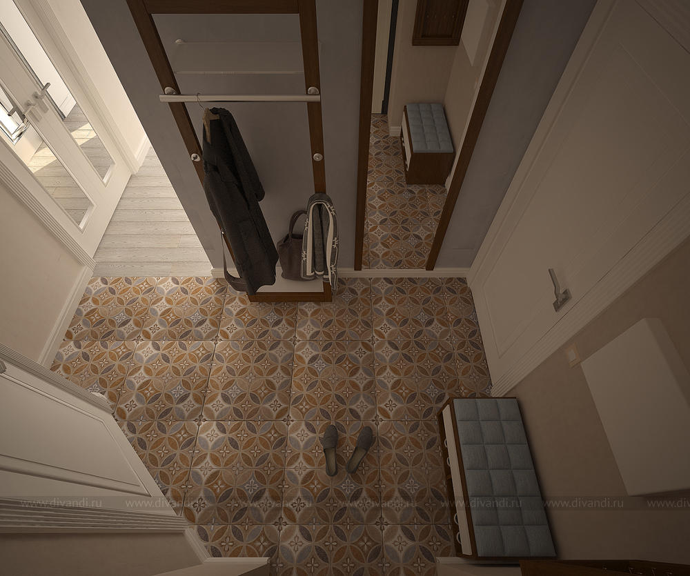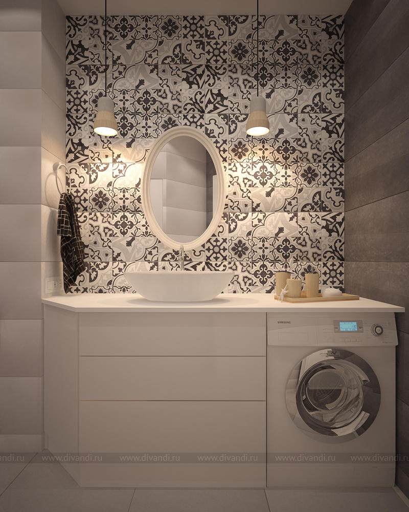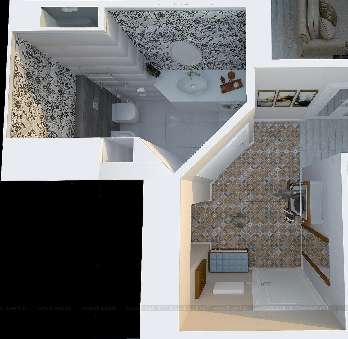 Голубоватый оттенок, использованный в холле, один из наиболее сбалансированных и гармоничных. Именно по этой причине один их самых подходящих тонов для жилых помещений. Ванна выполненна в монохромных тонах, но и с нетипичным декором.