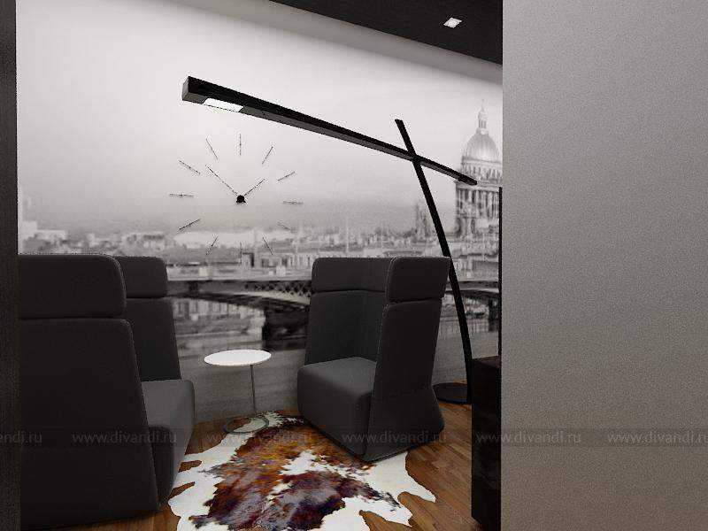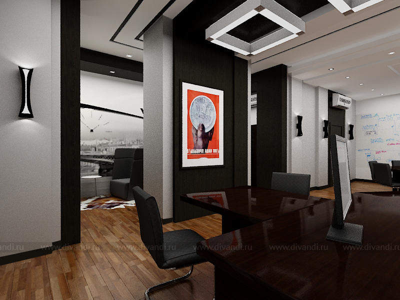 Большое светлое пространство, где сочетаются разные стили. Здесь старый паркет соседствует с ултрасовременными светильниками Карима Рашида. А старинные облигации уживаются с маркерной стеной. А черно-белые фотообои существуют рядом с модными высокими креслами Basket. У секретаря комната ожила за счет позитивного желтого цвета. А в комнате отдыха преобладает успокаивающий синий.