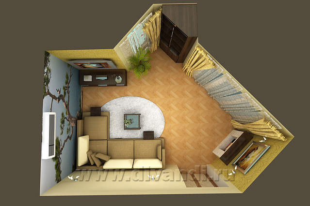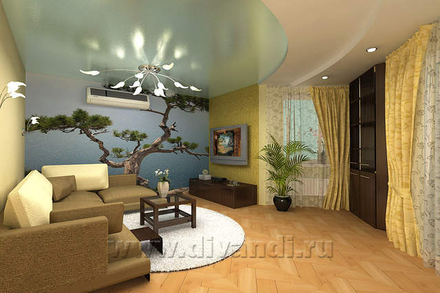 Задача дизайнера - зрительно расширить небольшое пространство, создать иллюзию слияния природы с городской жизнью.