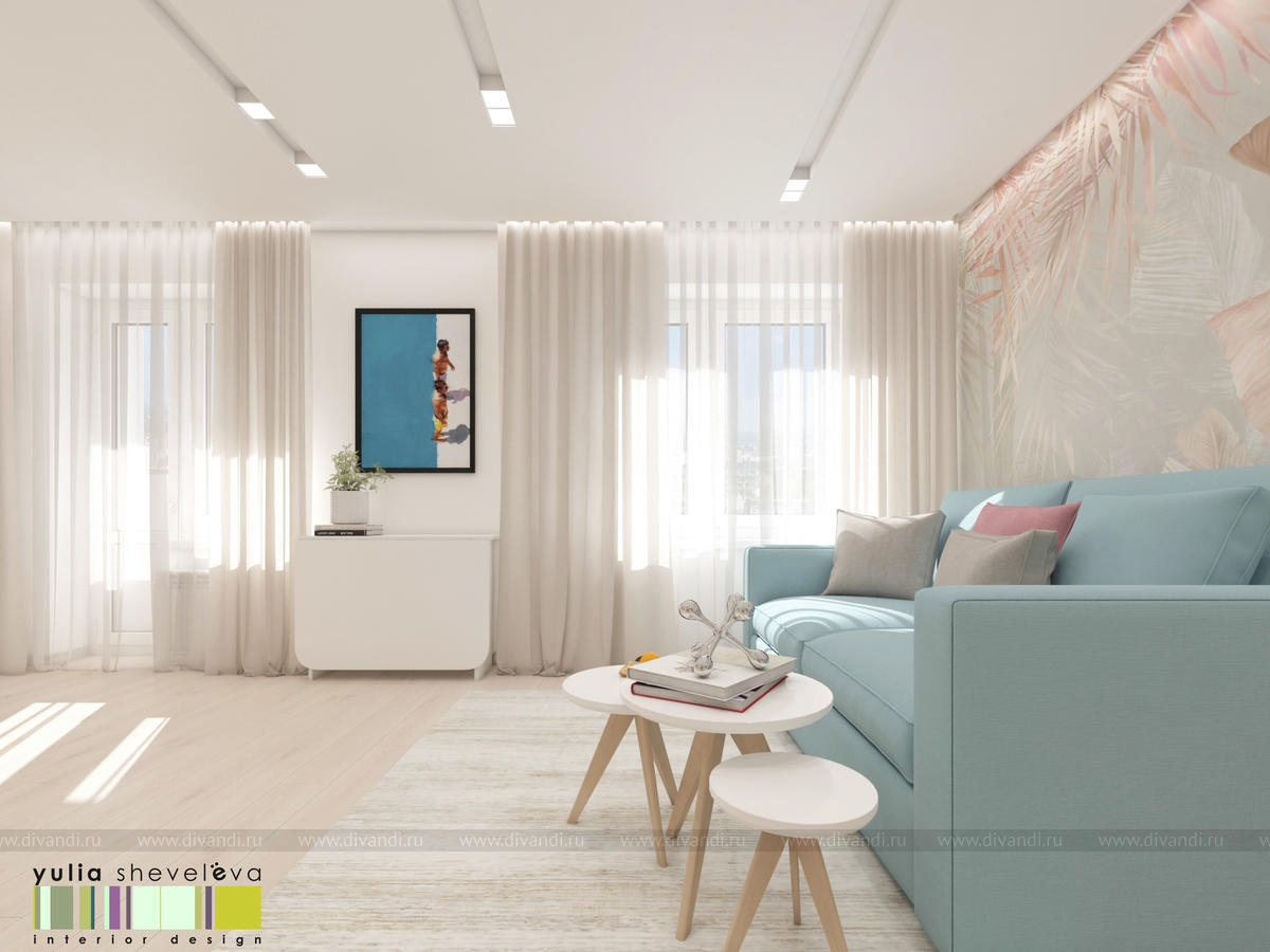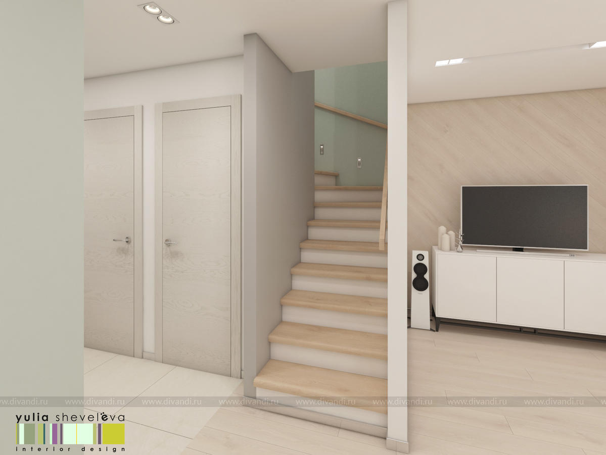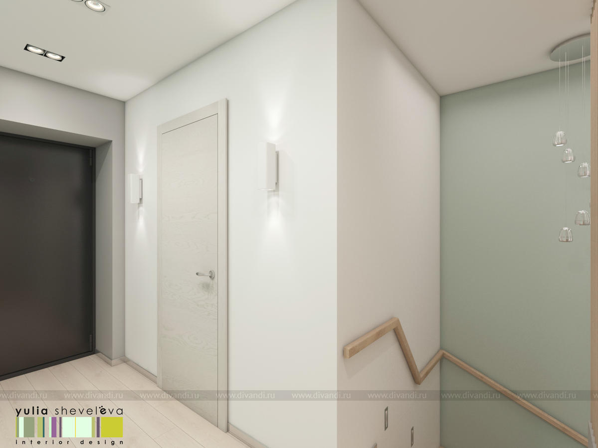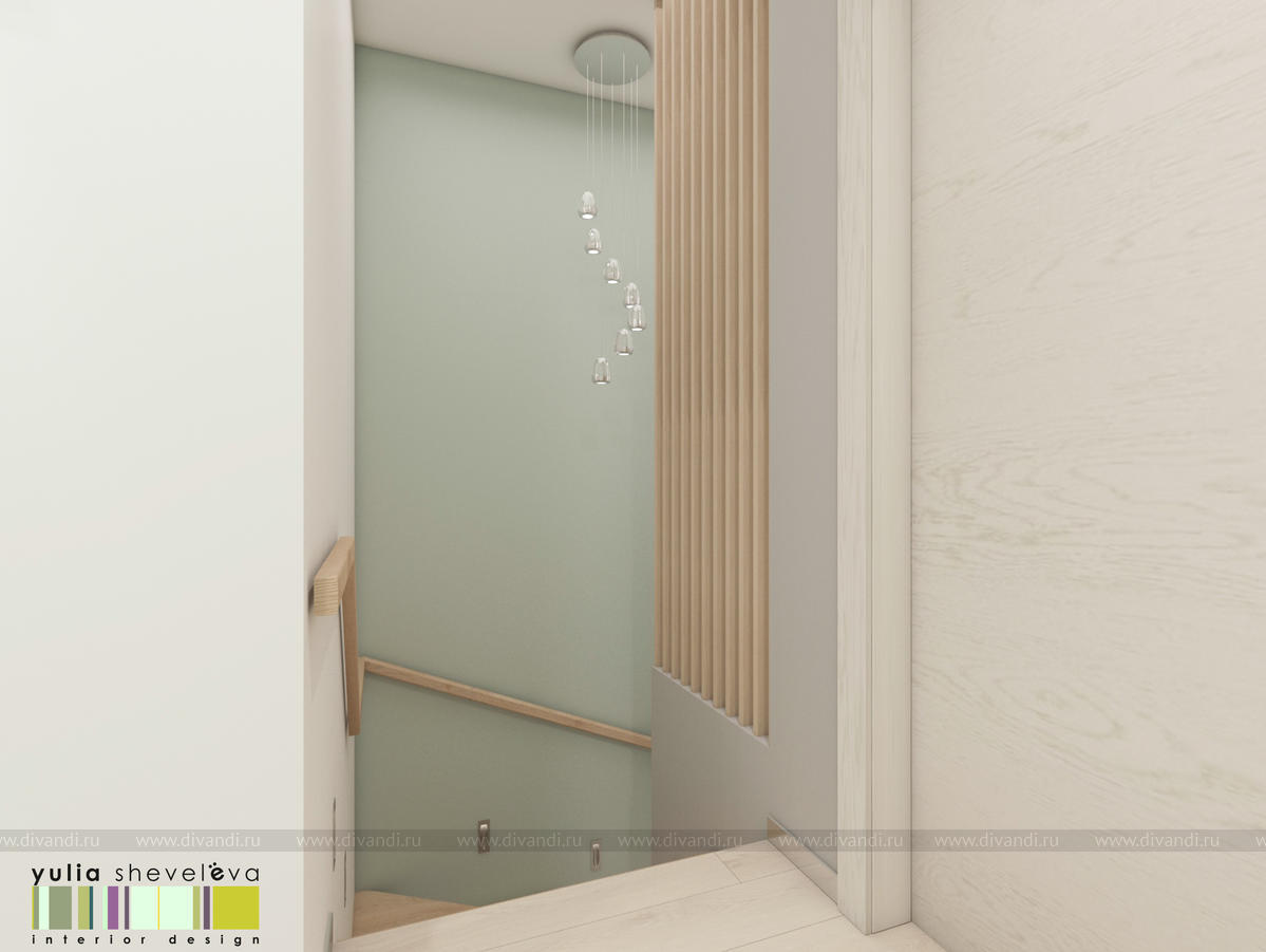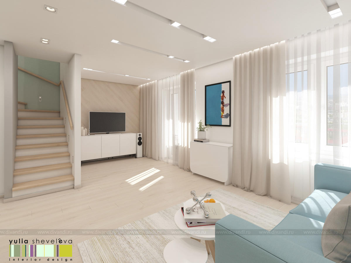 Дизайн-проект двухуровневой квартиры площадью 80 м² в г. Псков. Интерьер выполнен в светлых пастельных тонах, а в качестве акцентов выступают пудровые оттенки голубого и зеленого. Все построено на полутонах и легких акцентах.