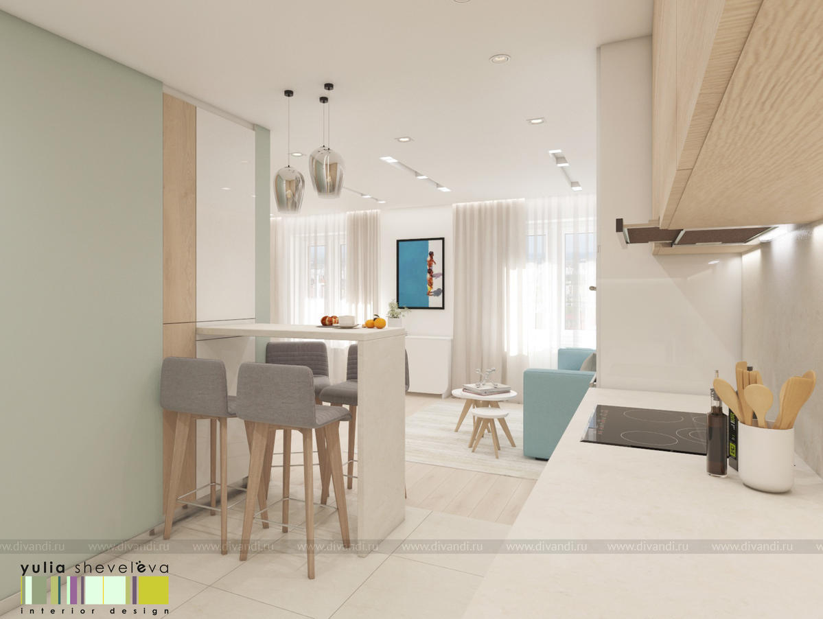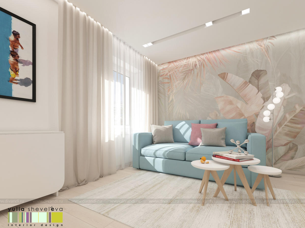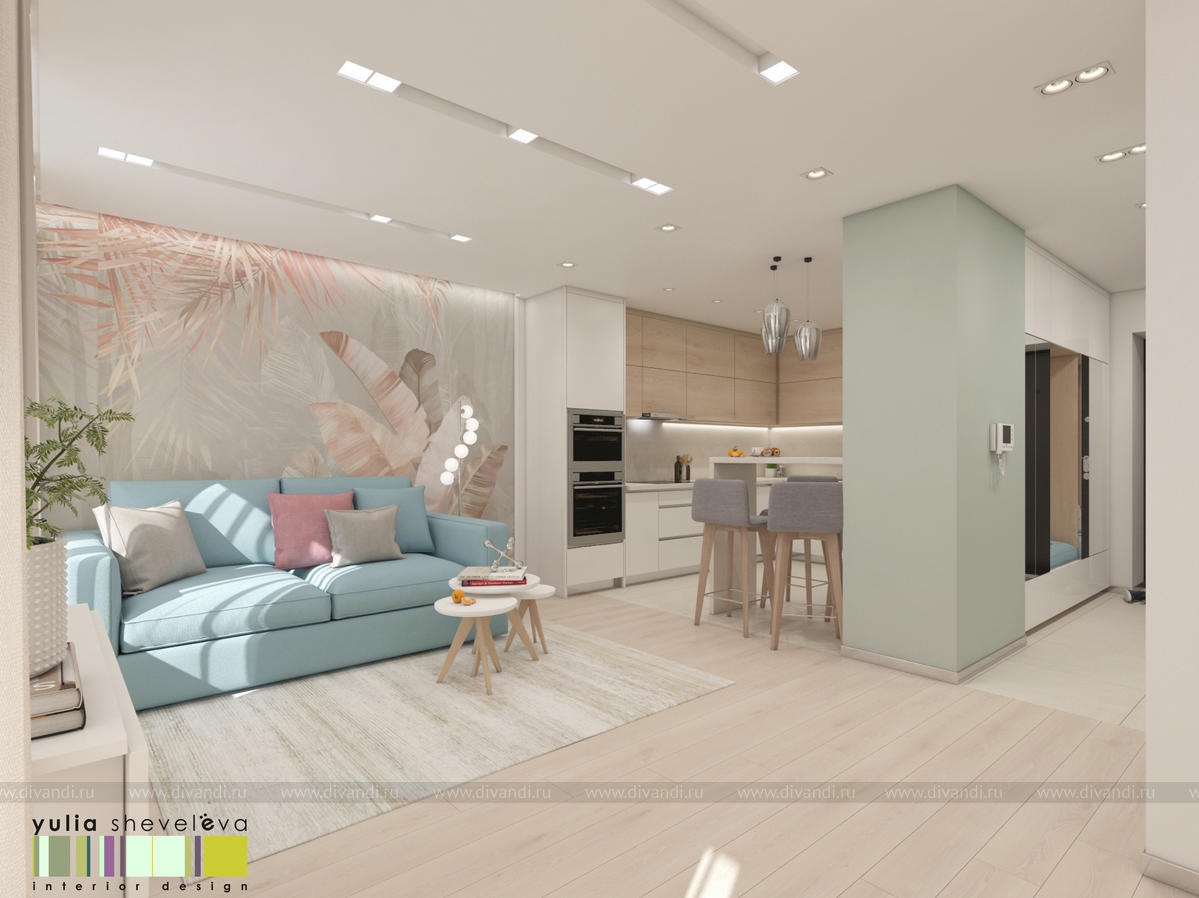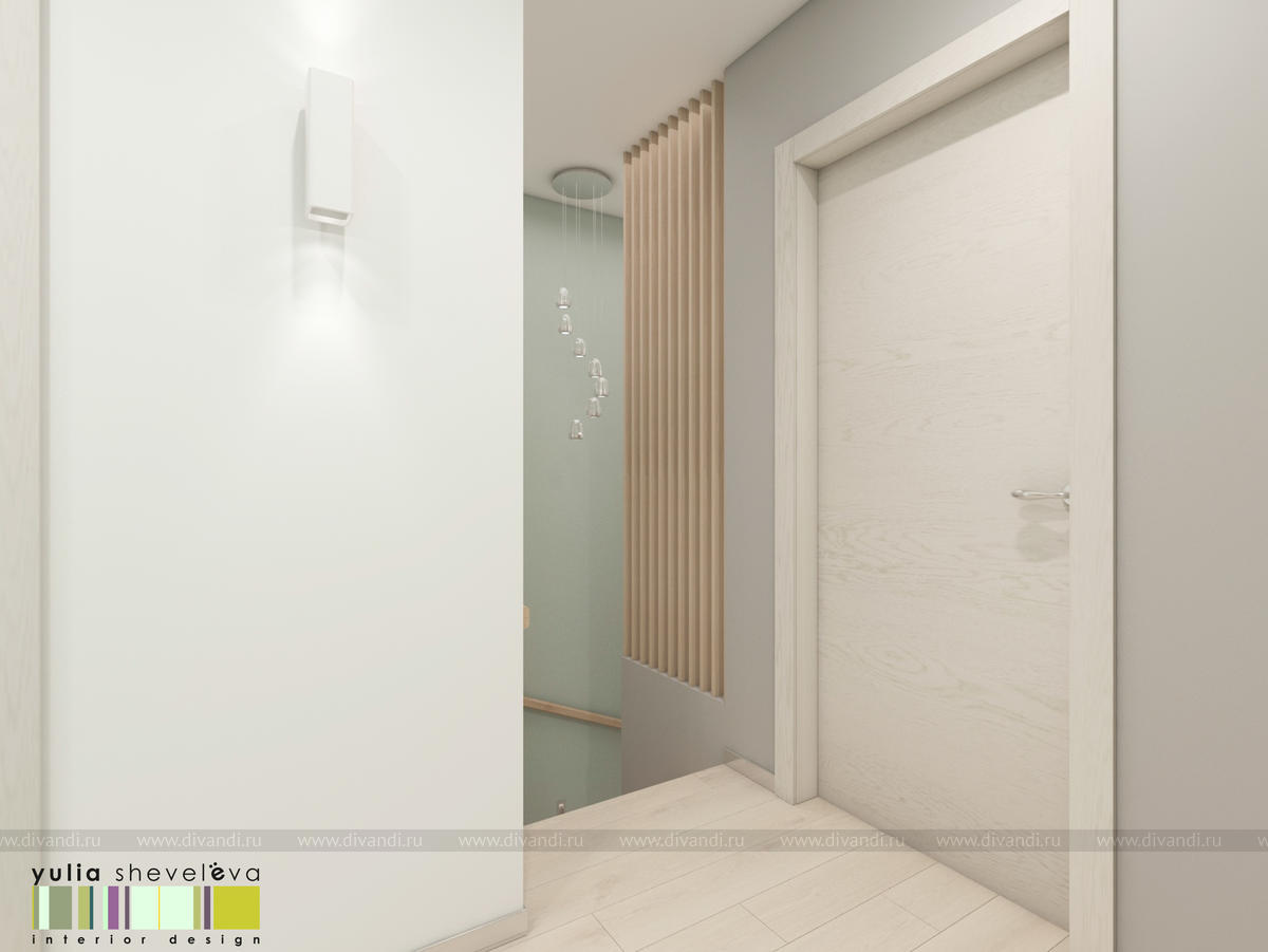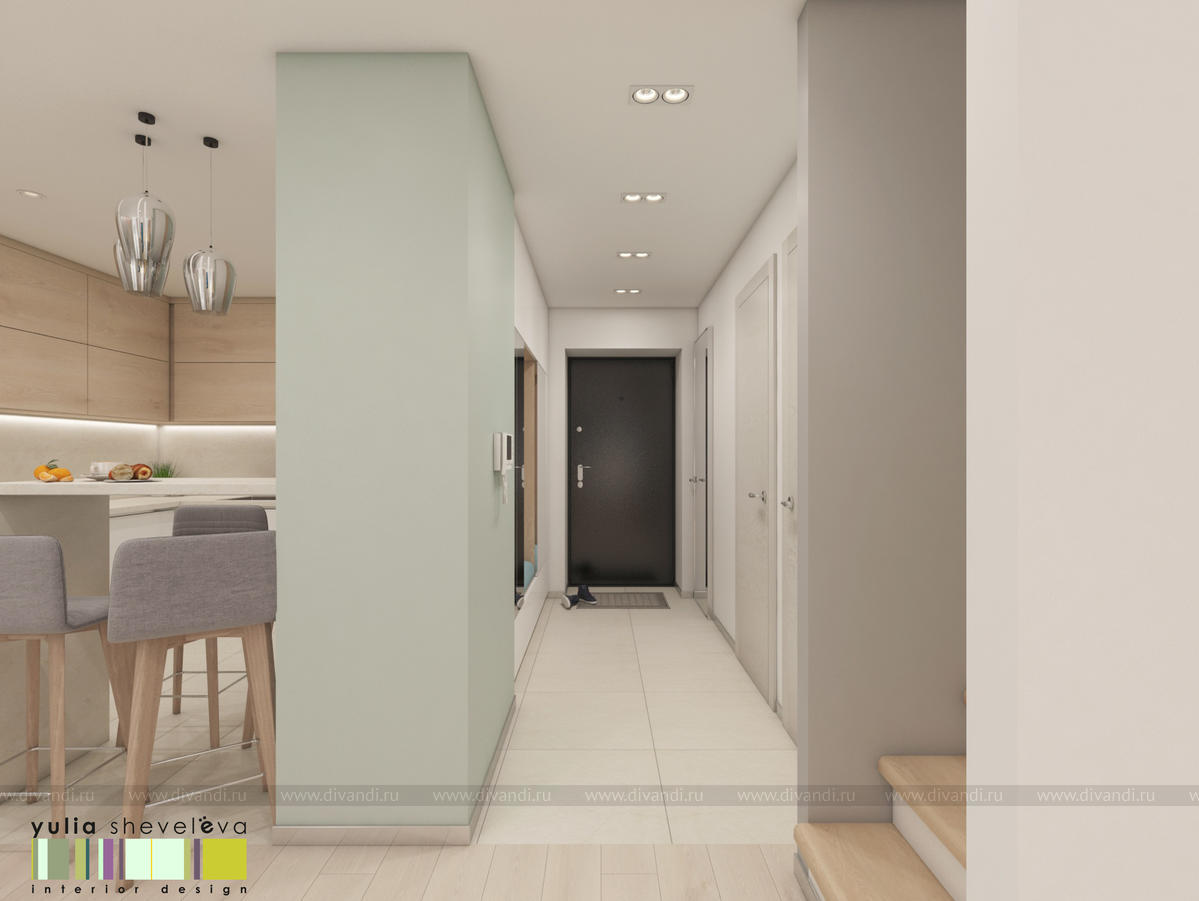 Дизайн-проект двухуровневой квартиры площадью 80 м² в г. Псков. Интерьер выполнен в светлых пастельных тонах, а в качестве акцентов выступают пудровые оттенки голубого и зеленого. Все построено на полутонах и легких акцентах.