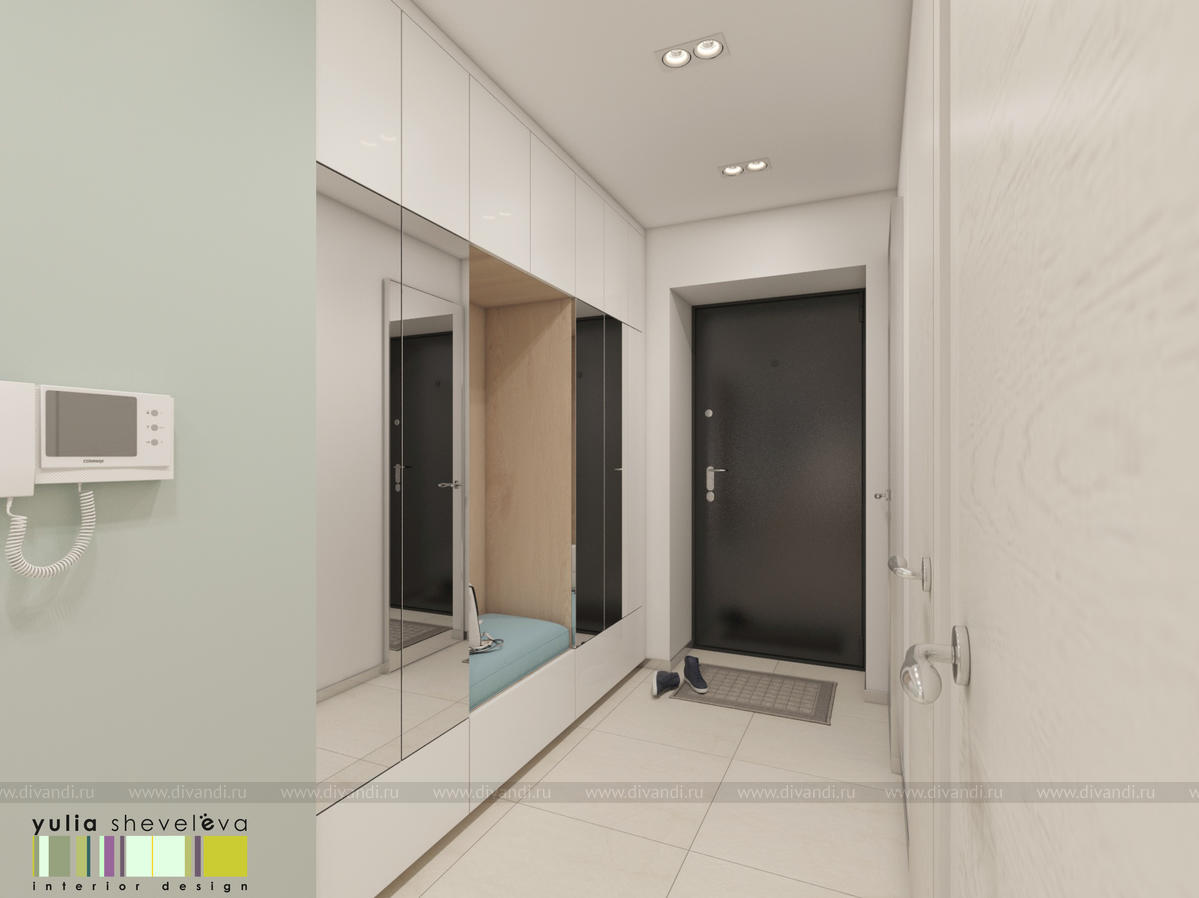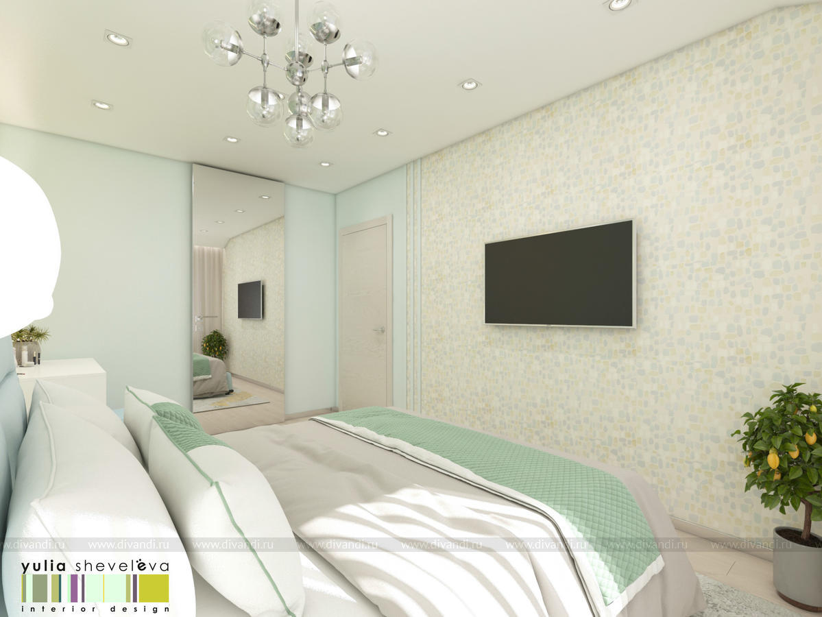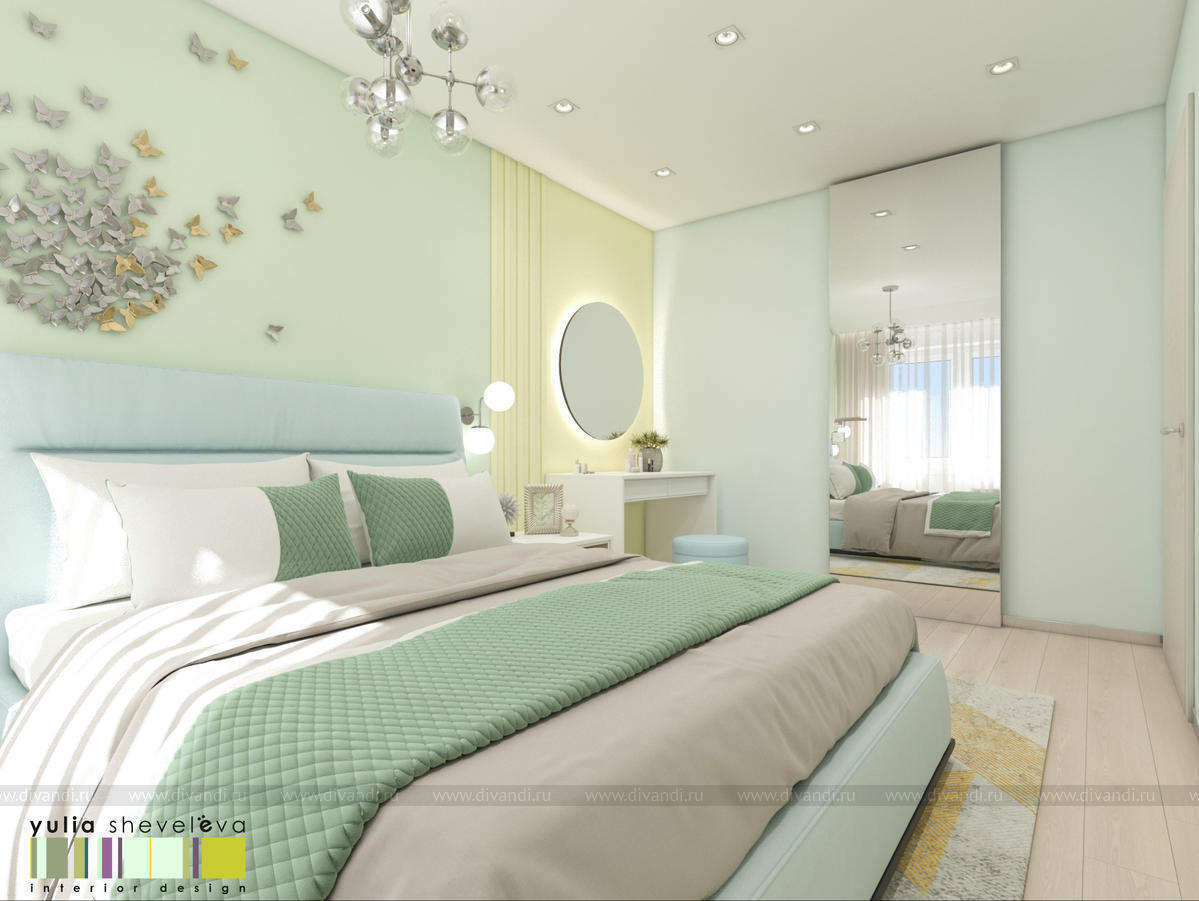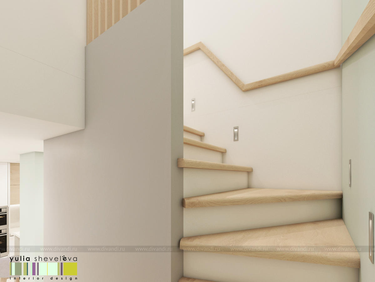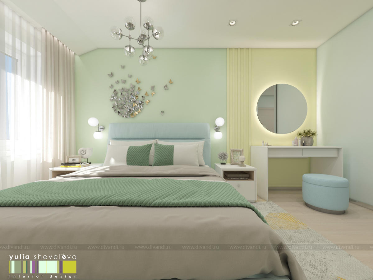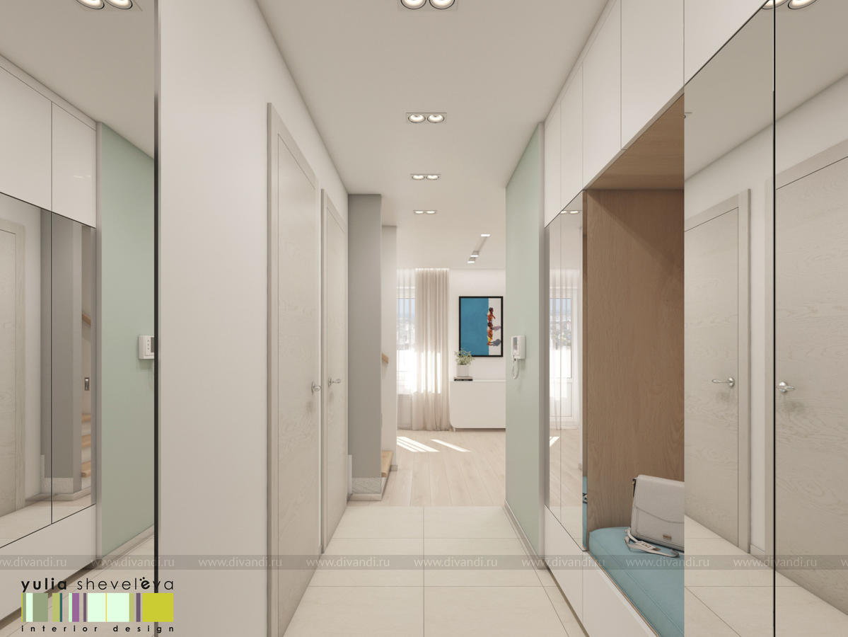 Дизайн-проект двухуровневой квартиры площадью 80 м² в г. Псков. Интерьер выполнен в светлых пастельных тонах, а в качестве акцентов выступают пудровые оттенки голубого и зеленого. Все построено на полутонах и легких акцентах.