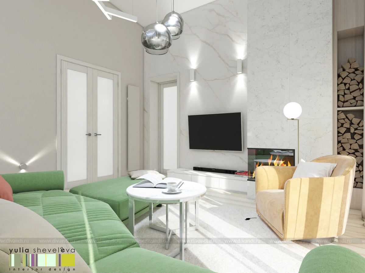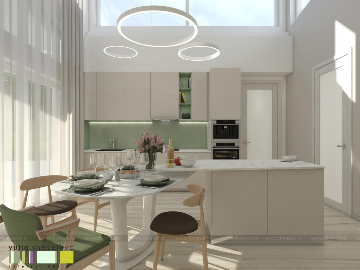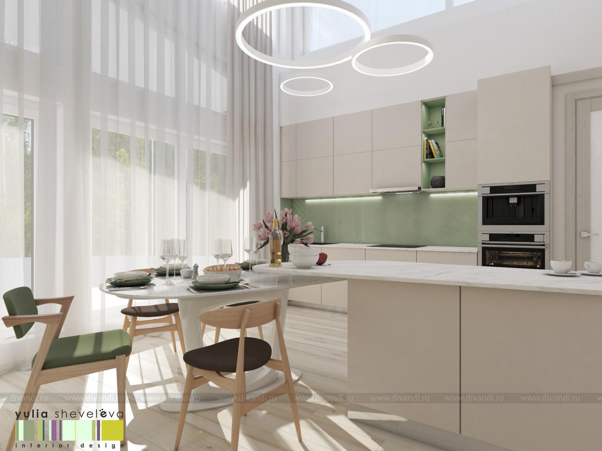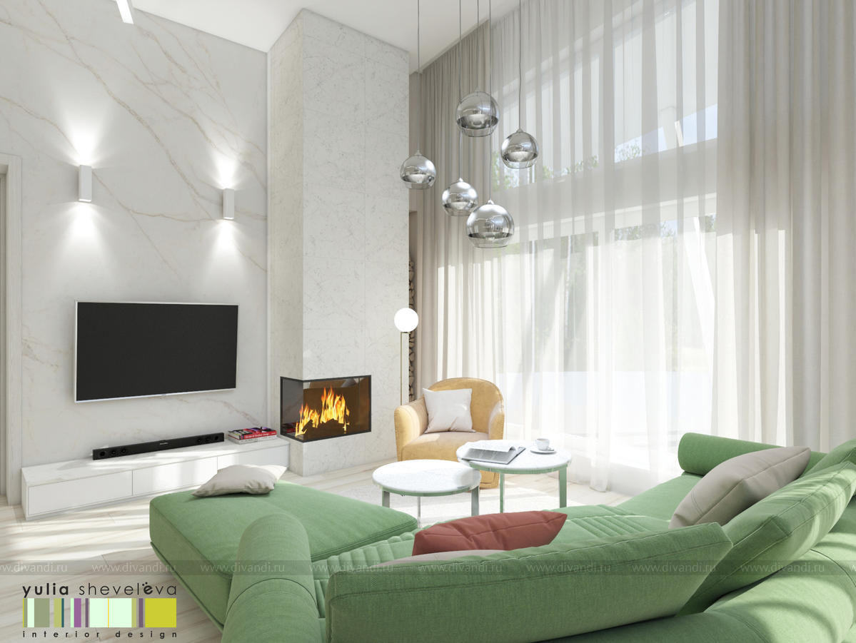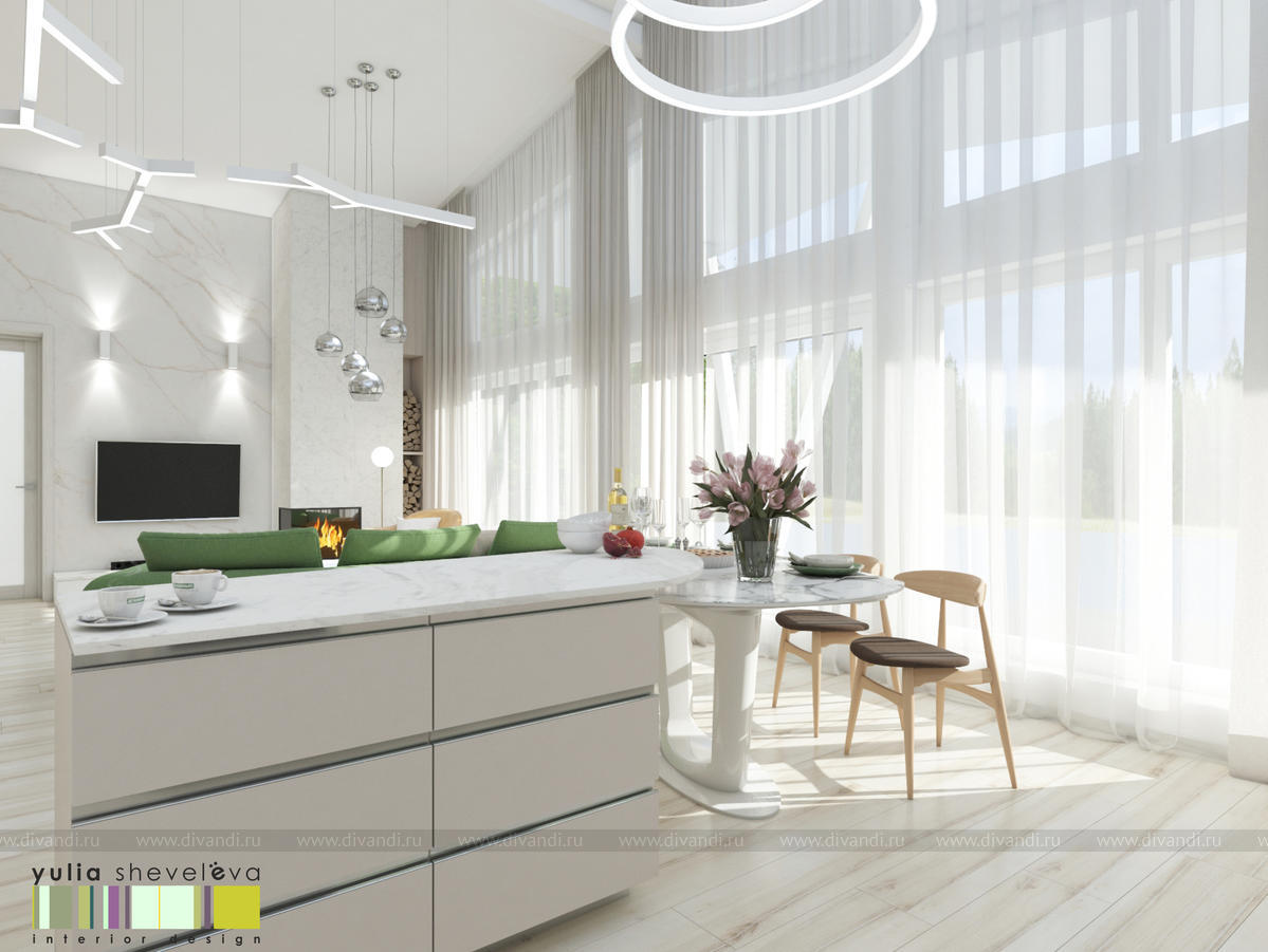 В просторной кухне-гостиной яркий и красивый диван, цвета майской зелени. Напротив - камин, облицованный керамической плиткой «под мрамор». Кухня небольшая, с островной частью и овальным столом. В дополнение есть зона барбекю на террасе и черновая кухня, где будет спрятана часть бытовой техники.