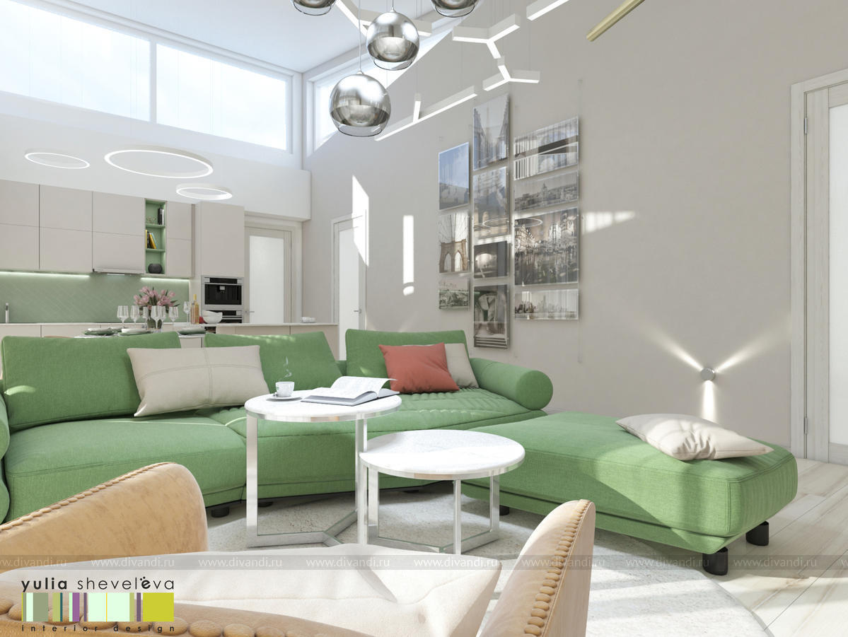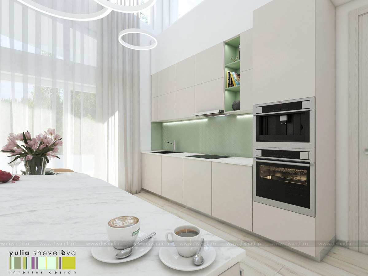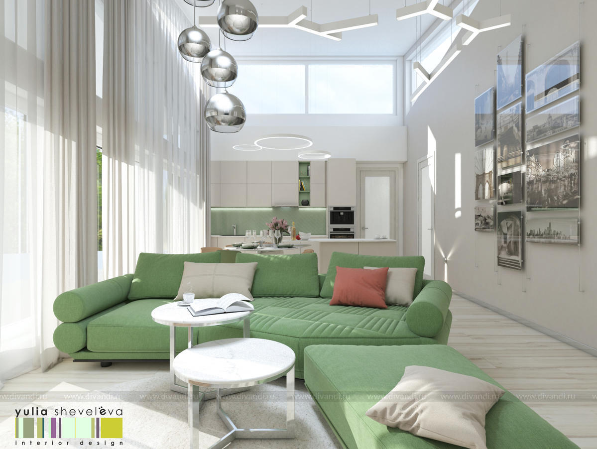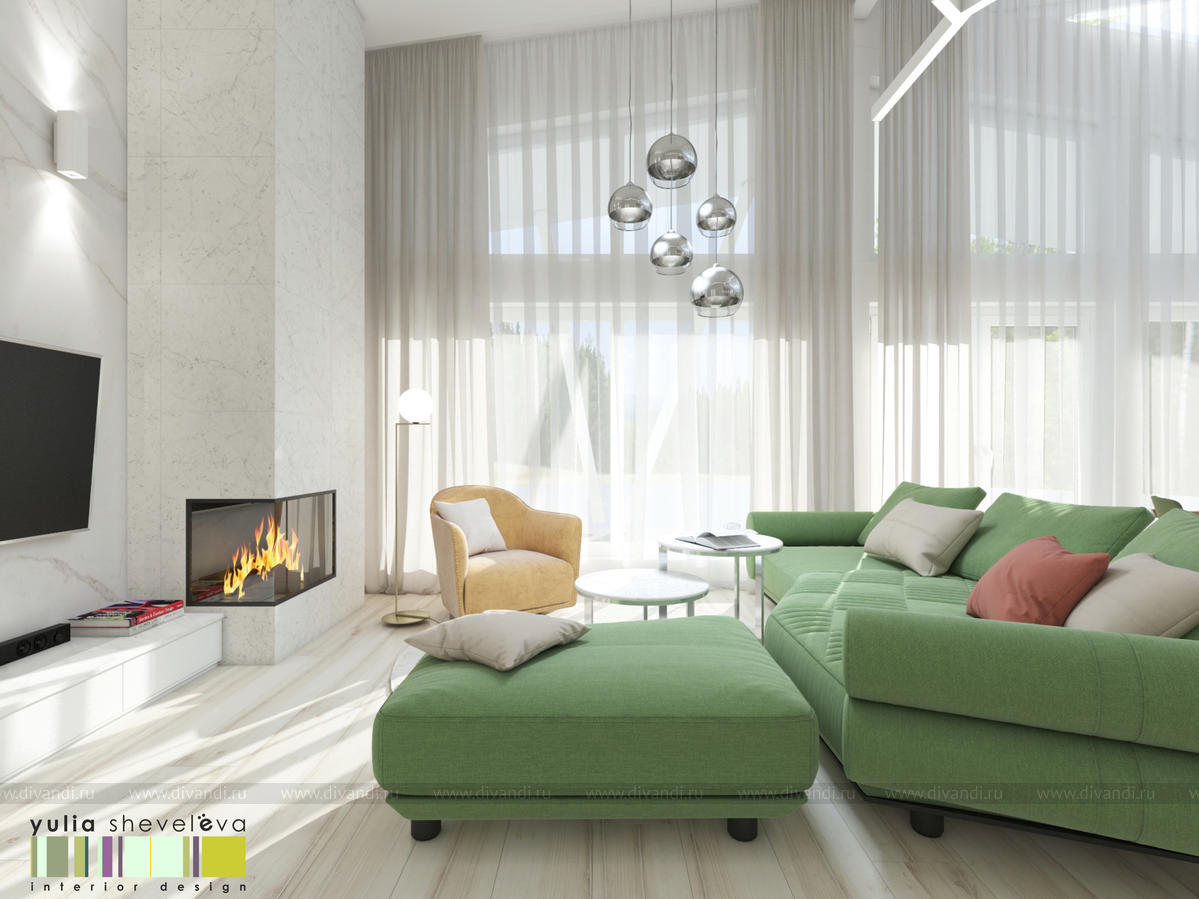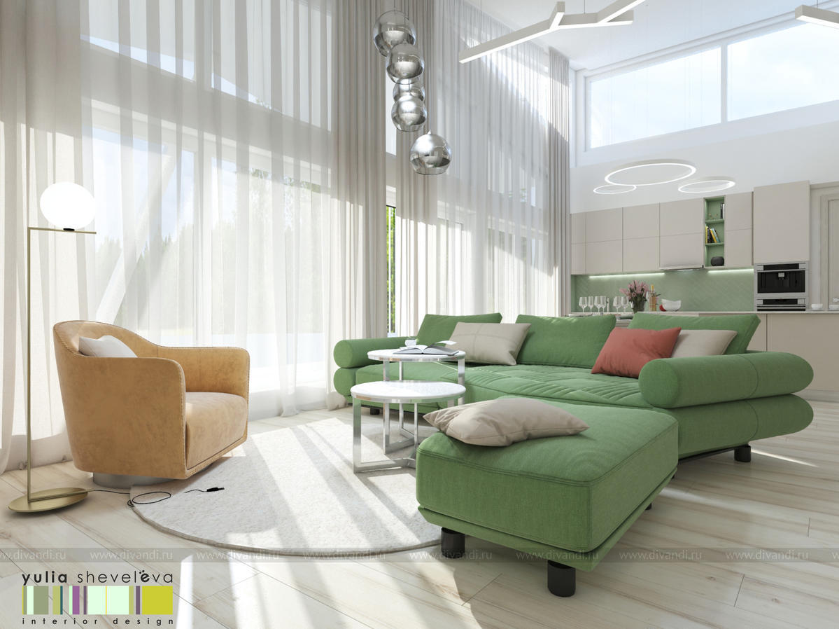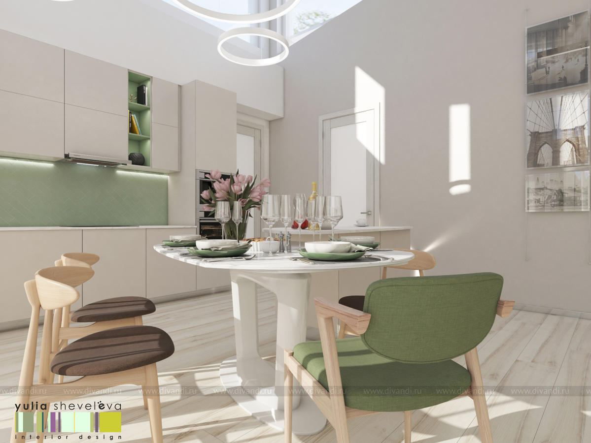В просторной кухне-гостиной яркий и красивый диван, цвета майской зелени. Напротив - камин, облицованный керамической плиткой «под мрамор». Кухня небольшая, с островной частью и овальным столом. В дополнение есть зона барбекю на террасе и черновая кухня, где будет спрятана часть бытовой техники.