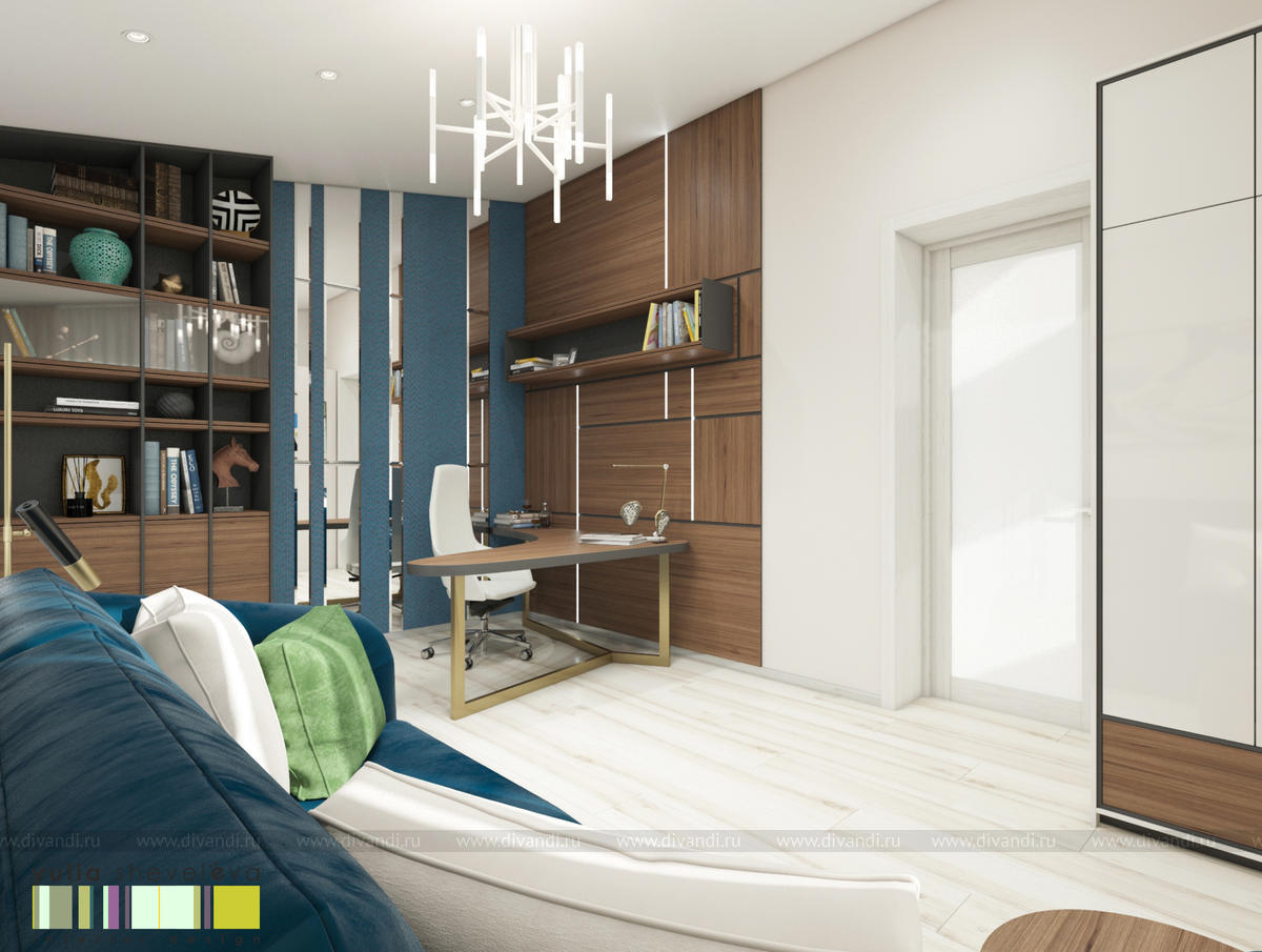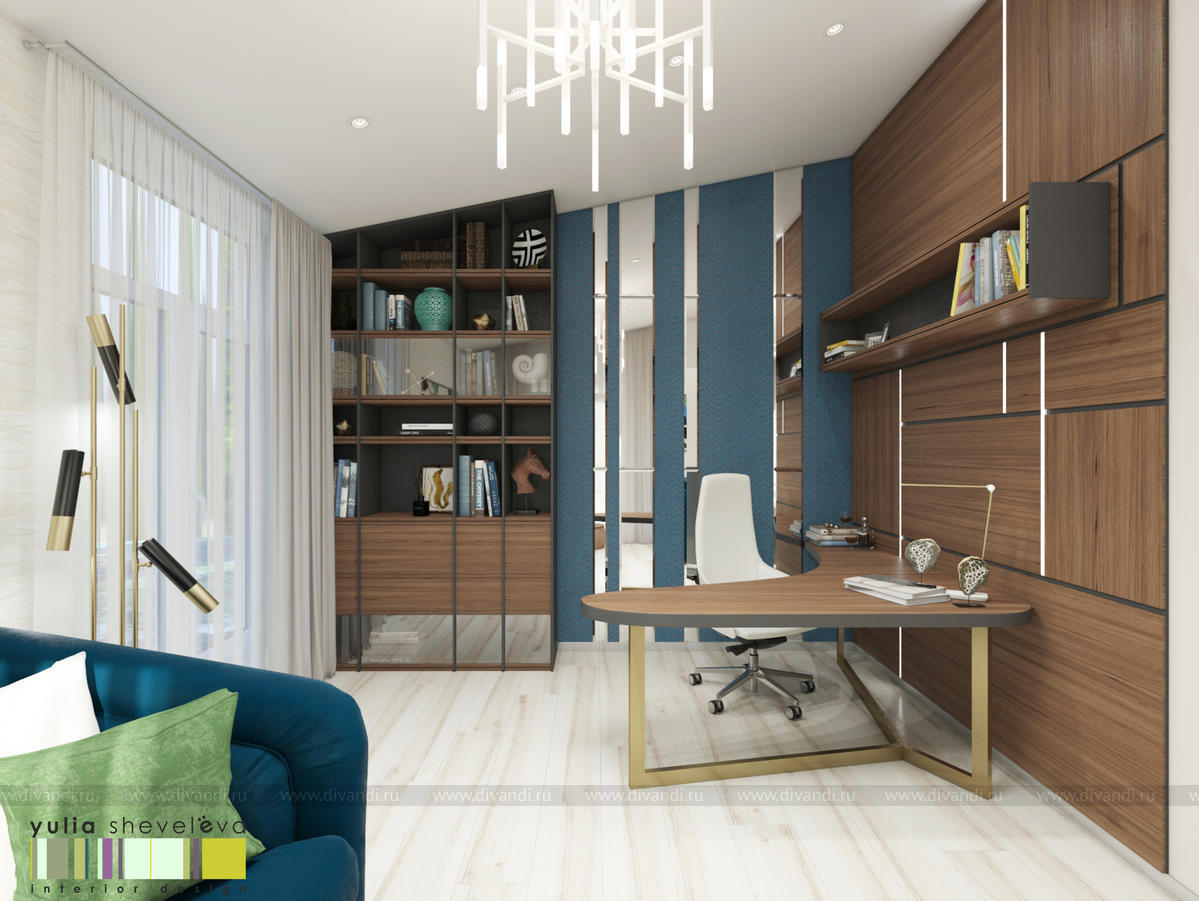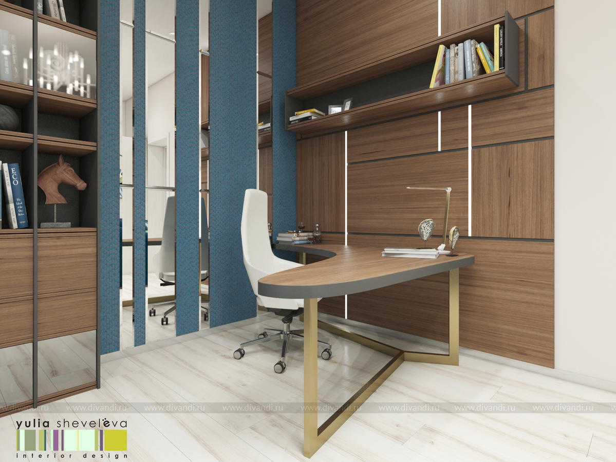 Кабинет оформлен с бежево-синей гамме, с шпонированными панелями.