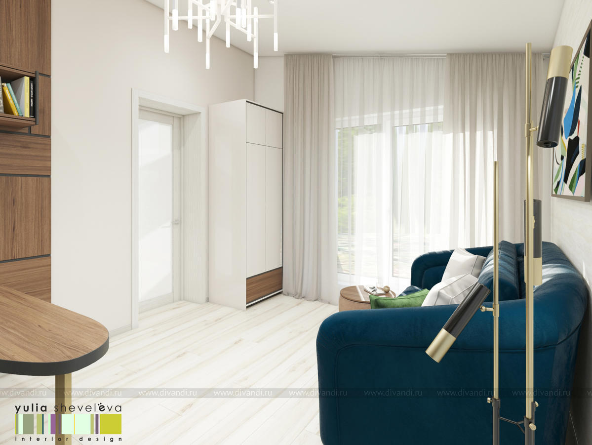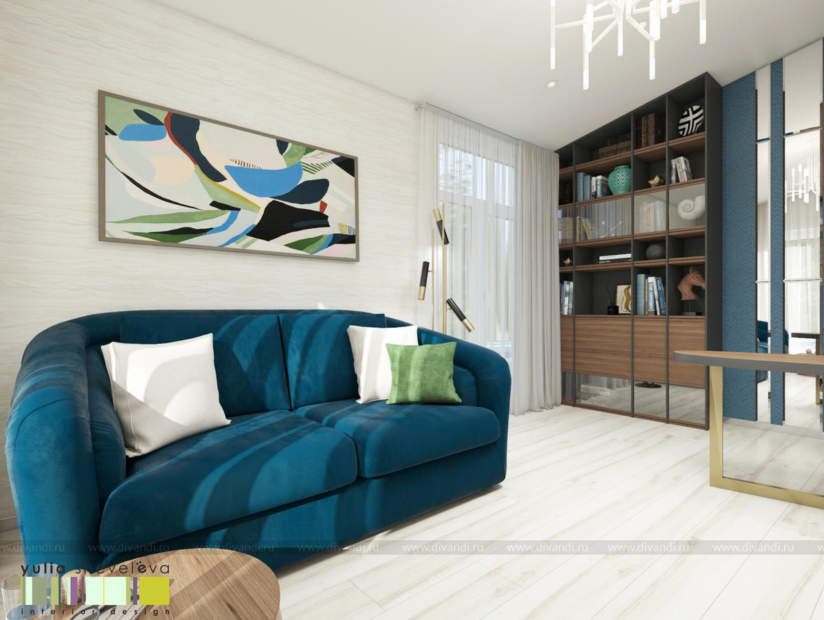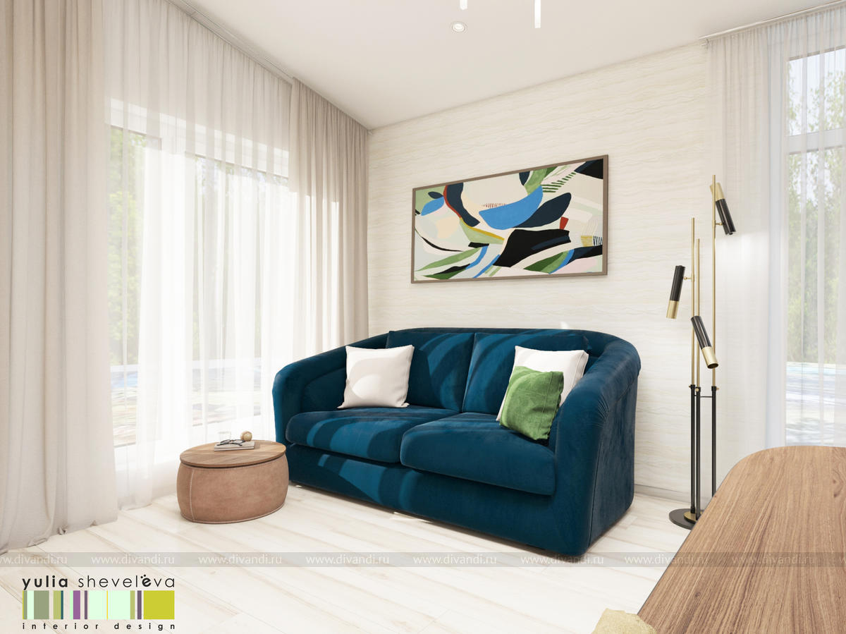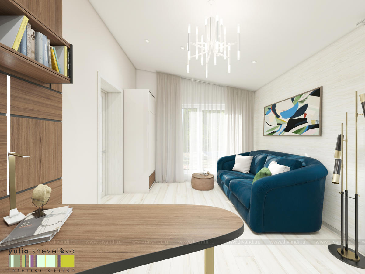 Кабинет оформлен с бежево-синей гамме, с шпонированными панелями.