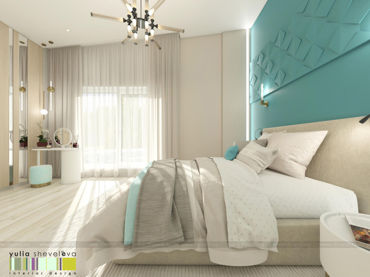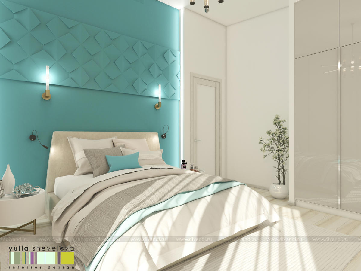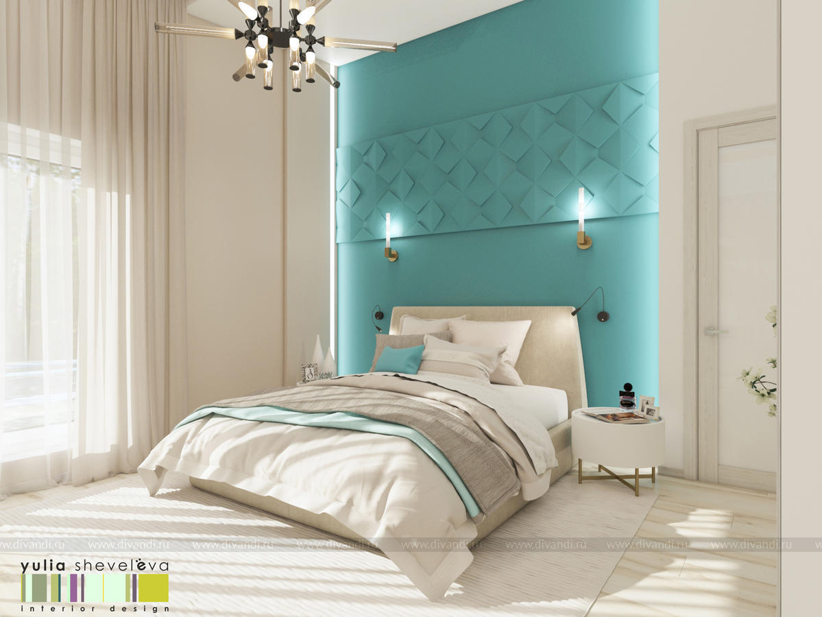 Спальня выполнена в нежных бежевых тонах, ярким акцентом служит стена за изголовьем кровати, декорированная панелями из полиуретана.