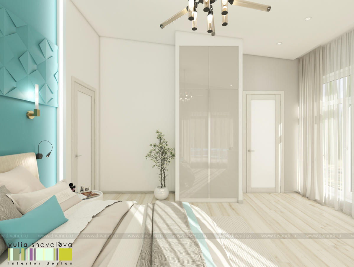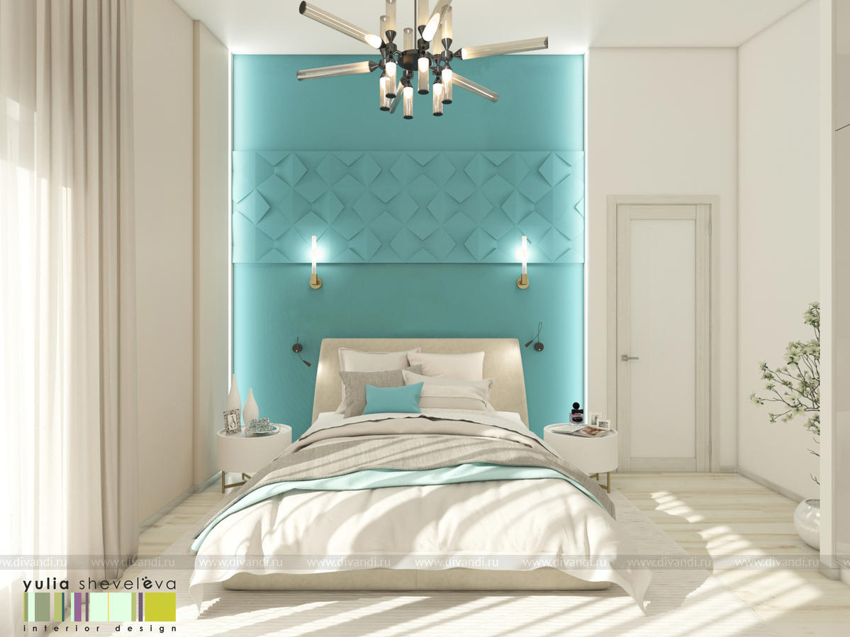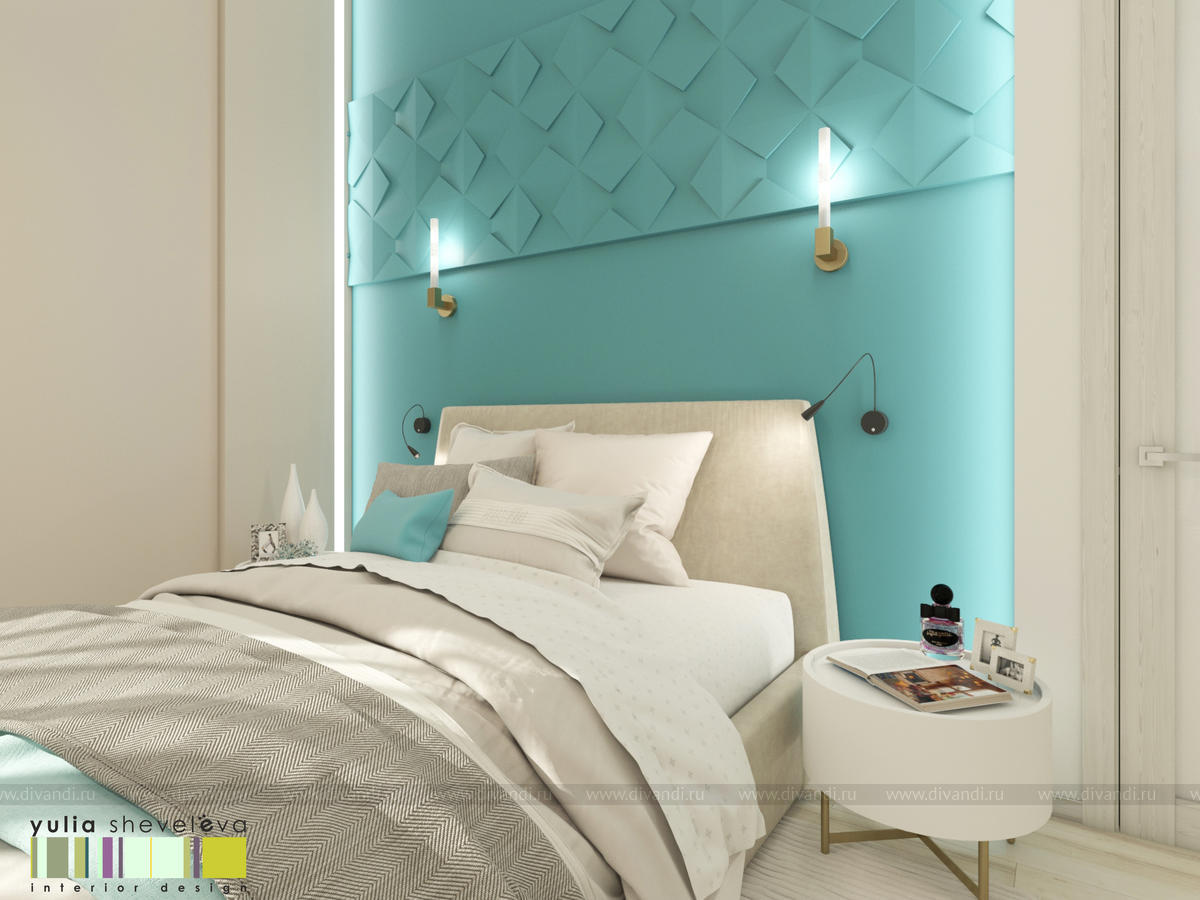 Спальня выполнена в нежных бежевых тонах, ярким акцентом служит стена за изголовьем кровати, декорированная панелями из полиуретана.