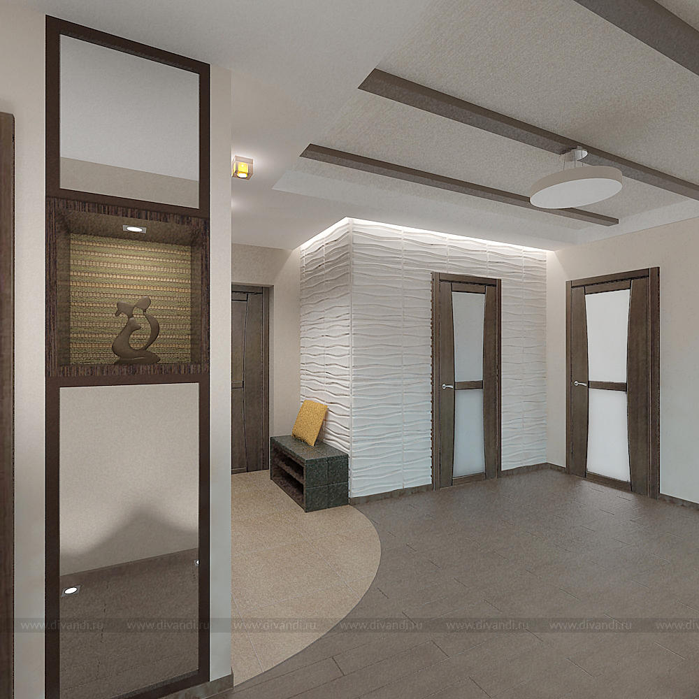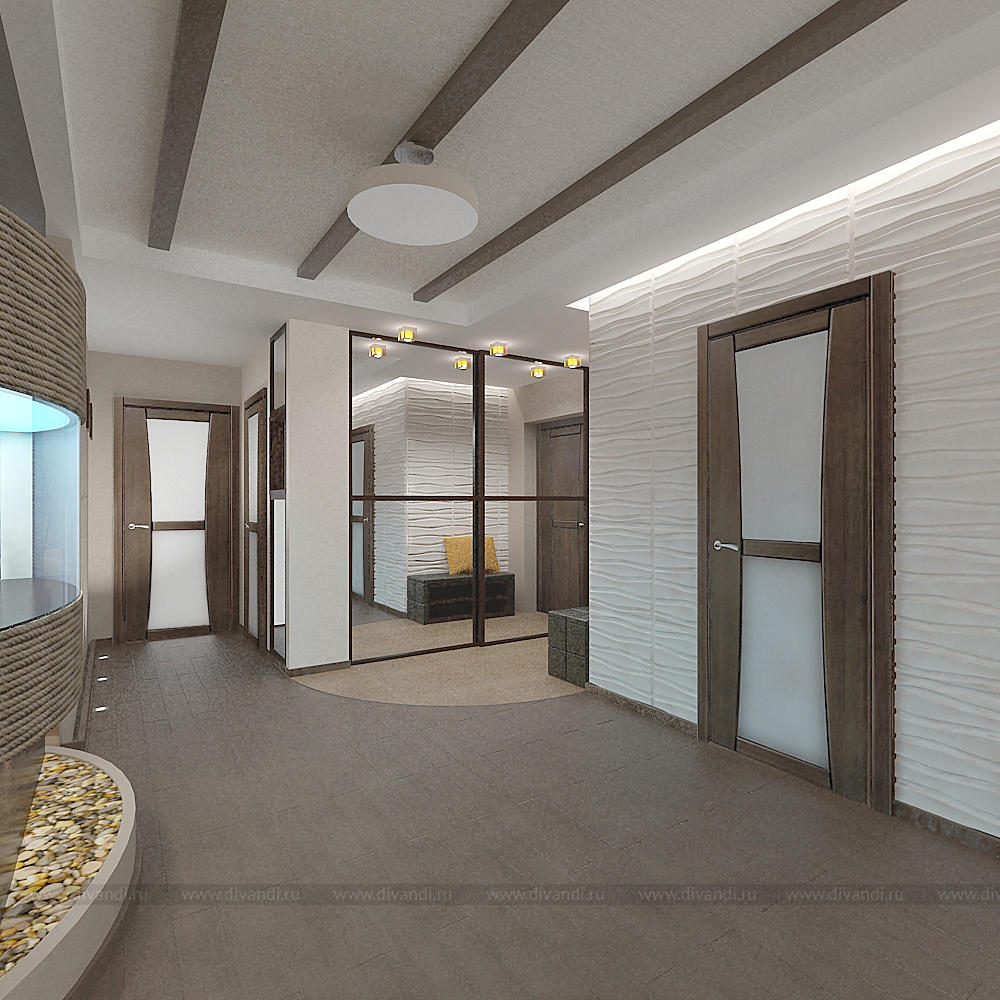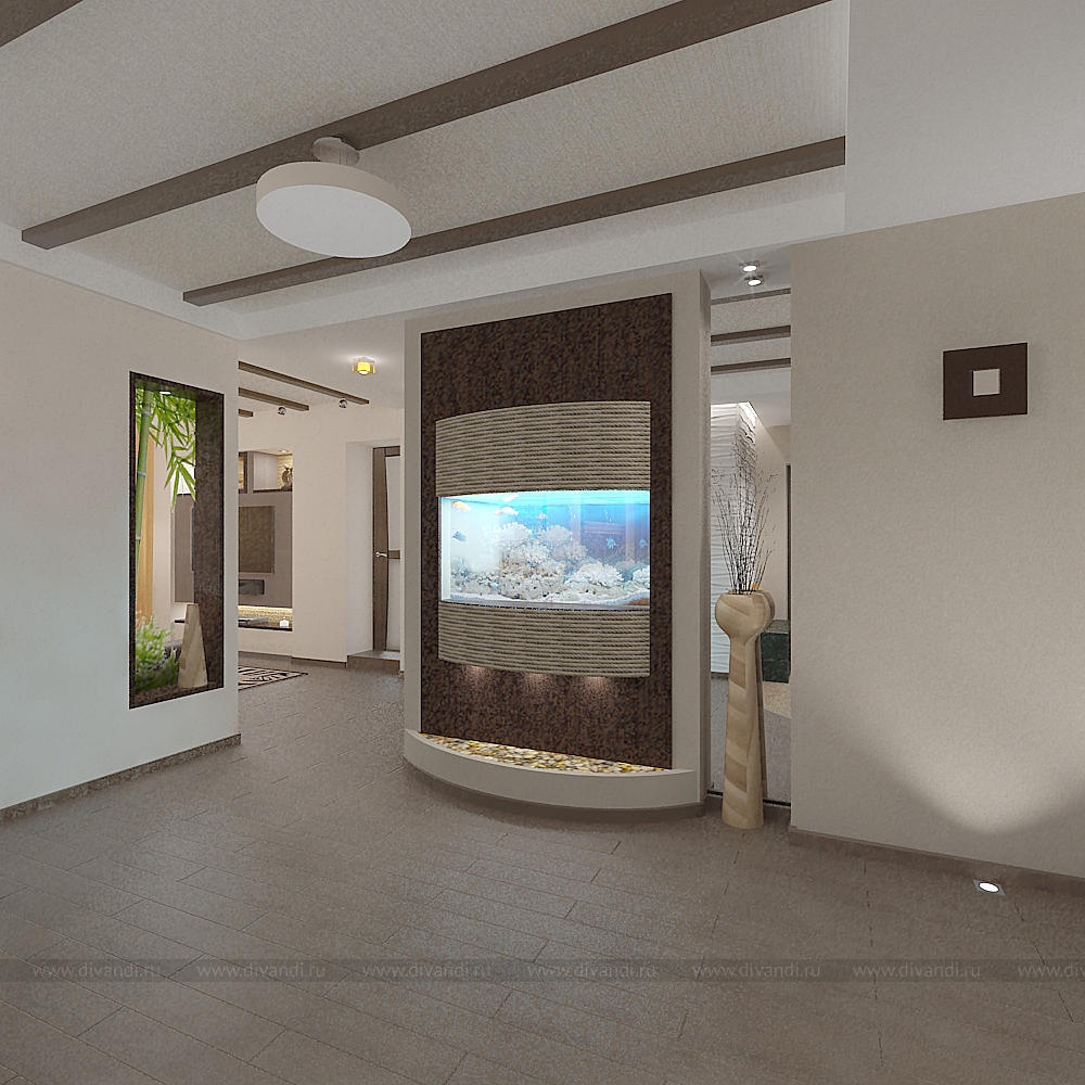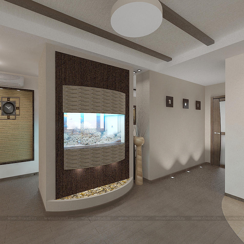 Прихожая решена лаконично и функционально в естественных природных оттенках с акцентом на деталях. Бамбук, натуральные растительные обои, деревянные балки на потолке, аквариум с манильским канатом тактично вносят свой экзотический штрих в городскую квартиру.