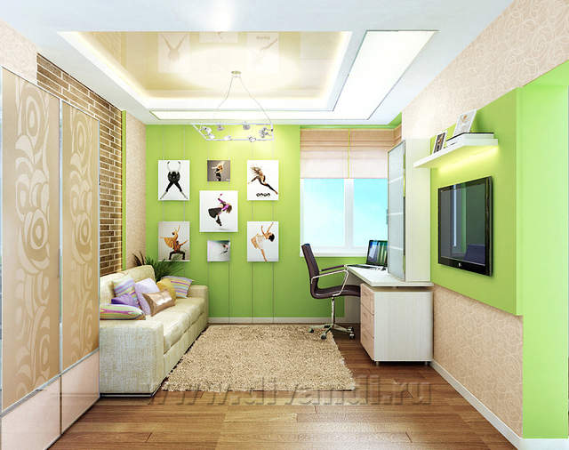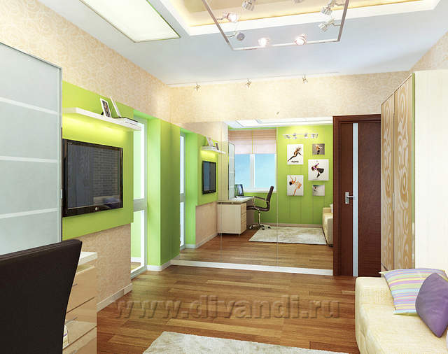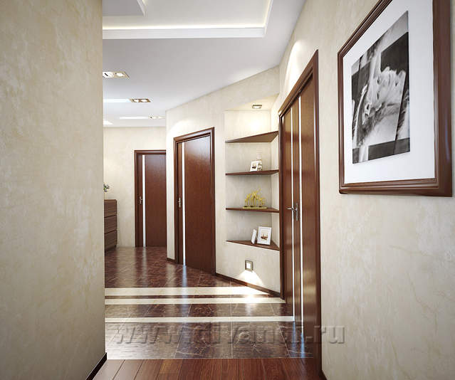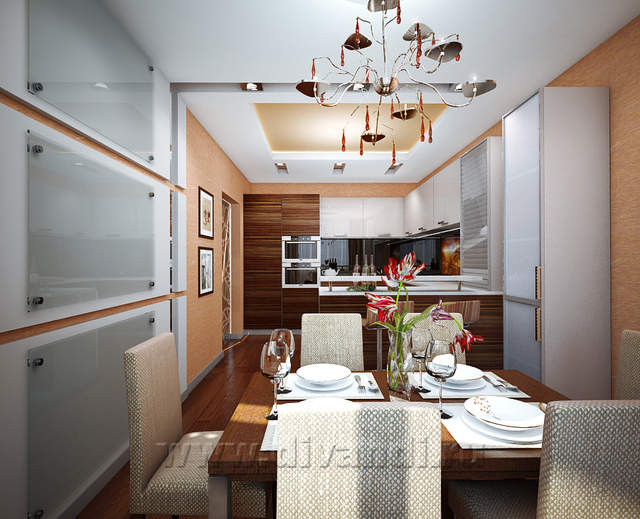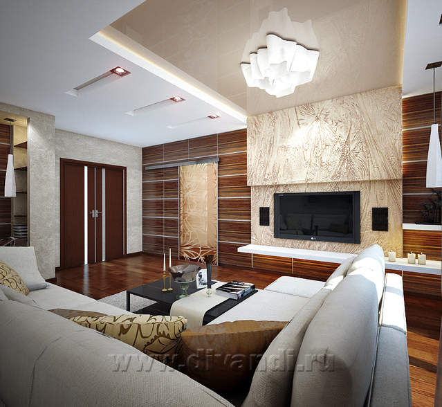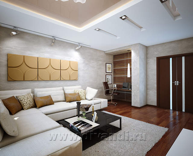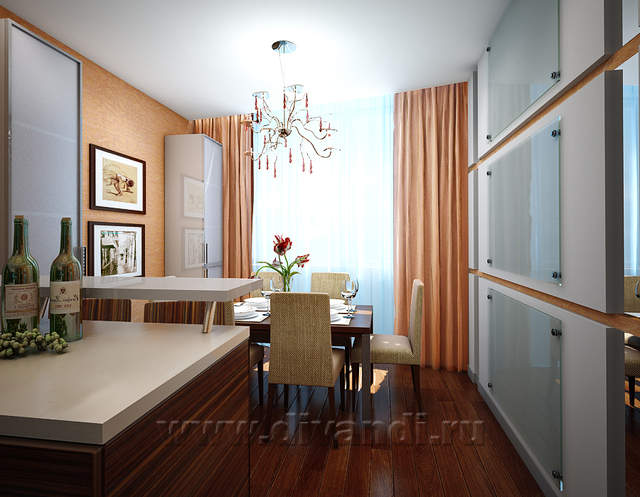 Трехкомнатная квартира в современном стиле. В части помещений использованы экологические материалы (натуральный шпон, массивная и паркетная доска, декоративные штукатурки). От обоев принципиально отказались почти во всех помещениях. В гостиной совместили 2 типа декоративной штукатурки и шпона зебрано. Детская - была запроектирована для молодой девушки, увлекающейся танцами, поэтому большая стена комнаты отдана под зеркало .Во всей квартире виден намёк гламура. Использование мдф "под кожу", стекло, придает элегантность всему интерьеру.