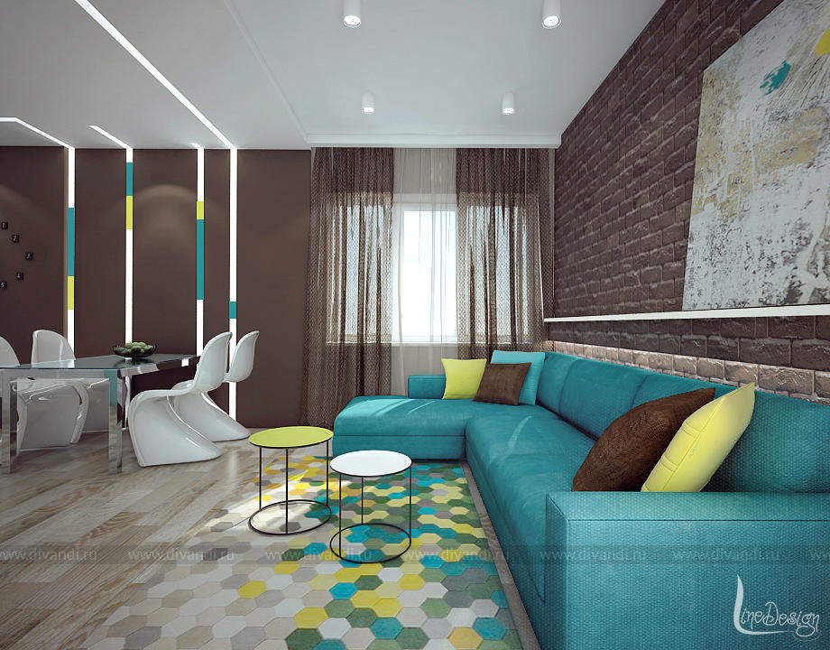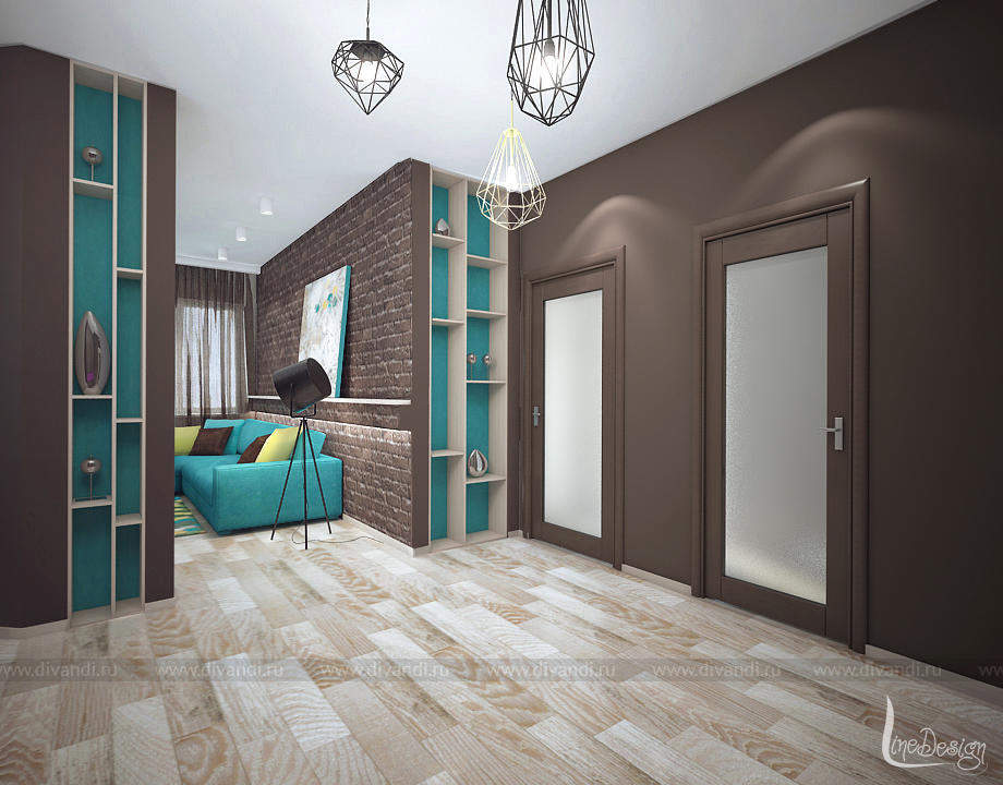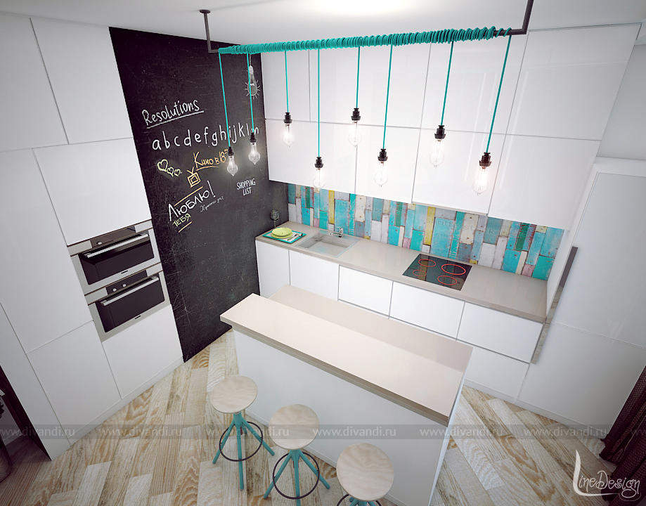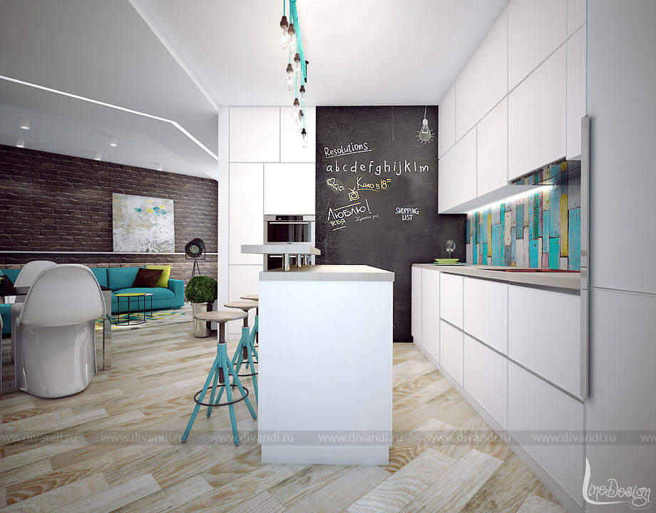 Стиль «Лофт» отличается характерными урбанистическими элементами, свободной планировкой. В нашем случае использованы: деревянные пол, с ярко выраженным рисунком, стены с кирпичной кладкой, доска для рисование мелом, открытые провода, стеклянный фартук с изображение грубой фактуры крашеных досок — все эти контрастные фактуры создают индустриальную атмосферу. Ощущение простора удалось добиться объединением гостиной и кухни.