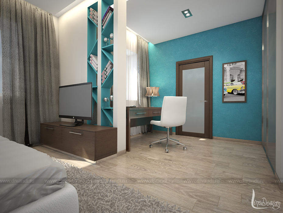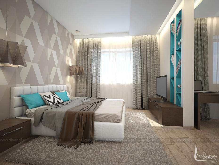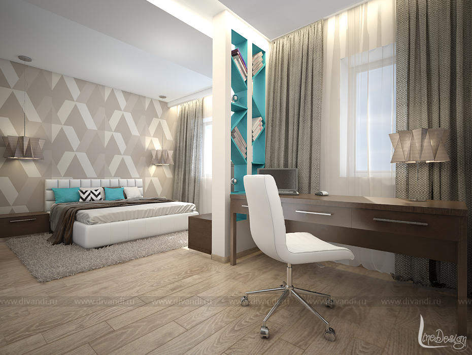 Спальня выполнена в стиле "оригами", полки повторяют направление линий, заданное в обоях, которые визуально представляют собой сложение многоугольников. Светильники фабрики Calligaris продолжают тему «оригами» — характерной особенностью этой модели является то, что благодаря им световой дизайн строится на интересной игре света и тени.