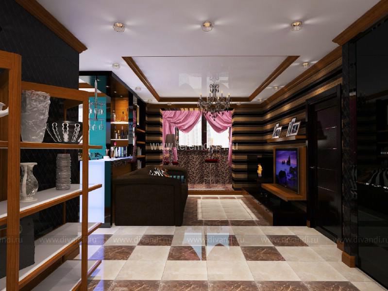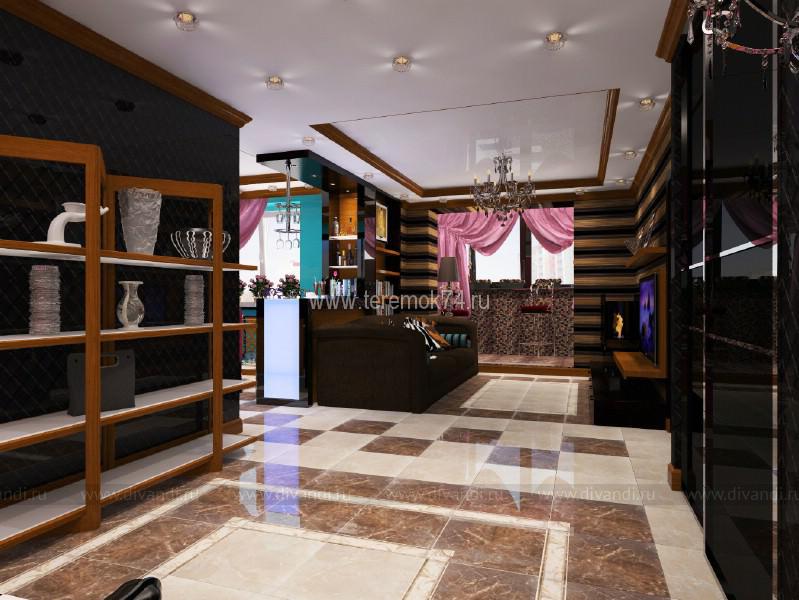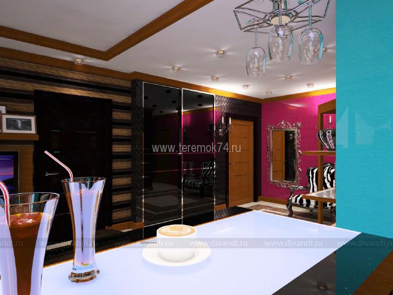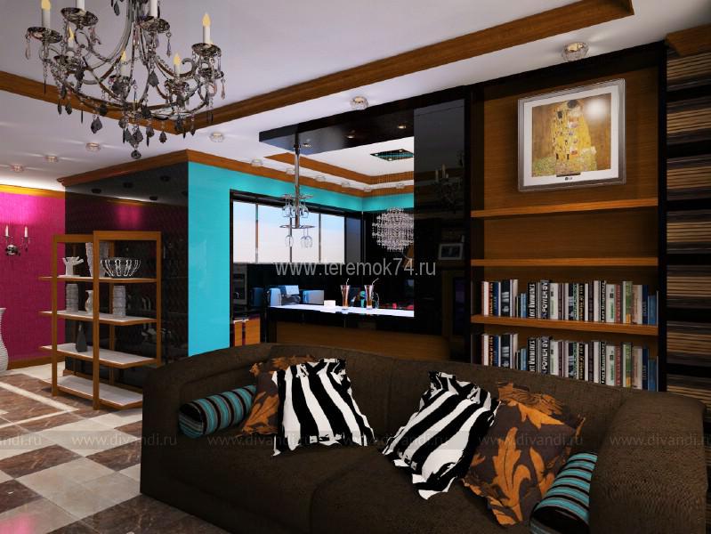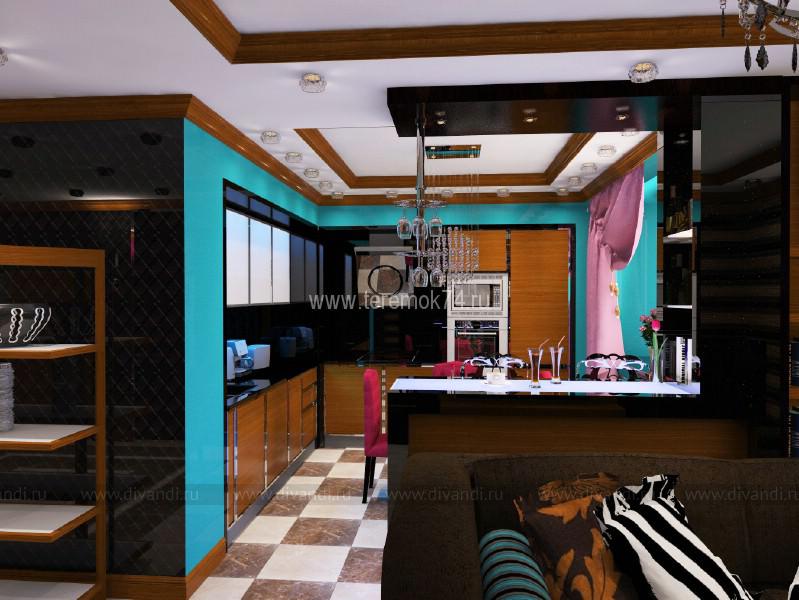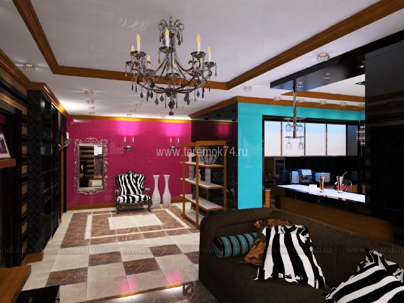Яркий, красочный интерьер для молодой девушки. Эта квартира находится в ЖК «Александровский». В первоначальном варианте планировка квартиры составляла 3-комнаты и 1 санузел, но мы перепланировали таким образом, что появились кухня, совмещенная с гостиной, спальня с ванной комнатой, гостевая, и санузел для гостей. Интерьер это студии выполнен в восточном стиле. Так в оформлении использованы дерево, текстиль, камень, кожа. Вся мебель выполнена по индивидуальному эскизу.