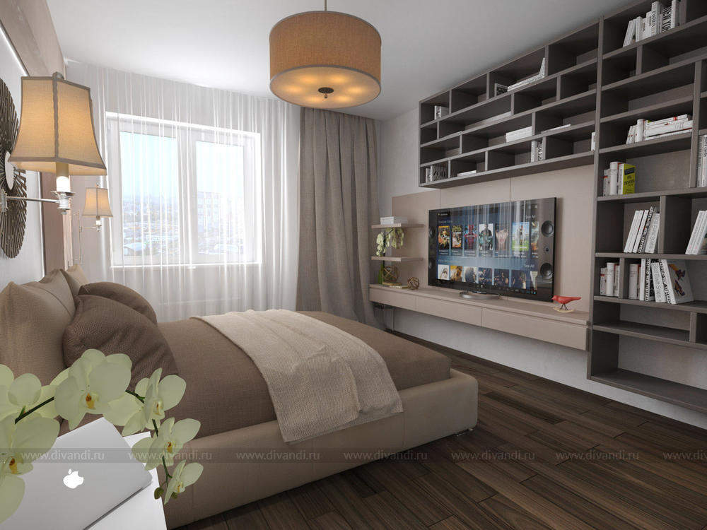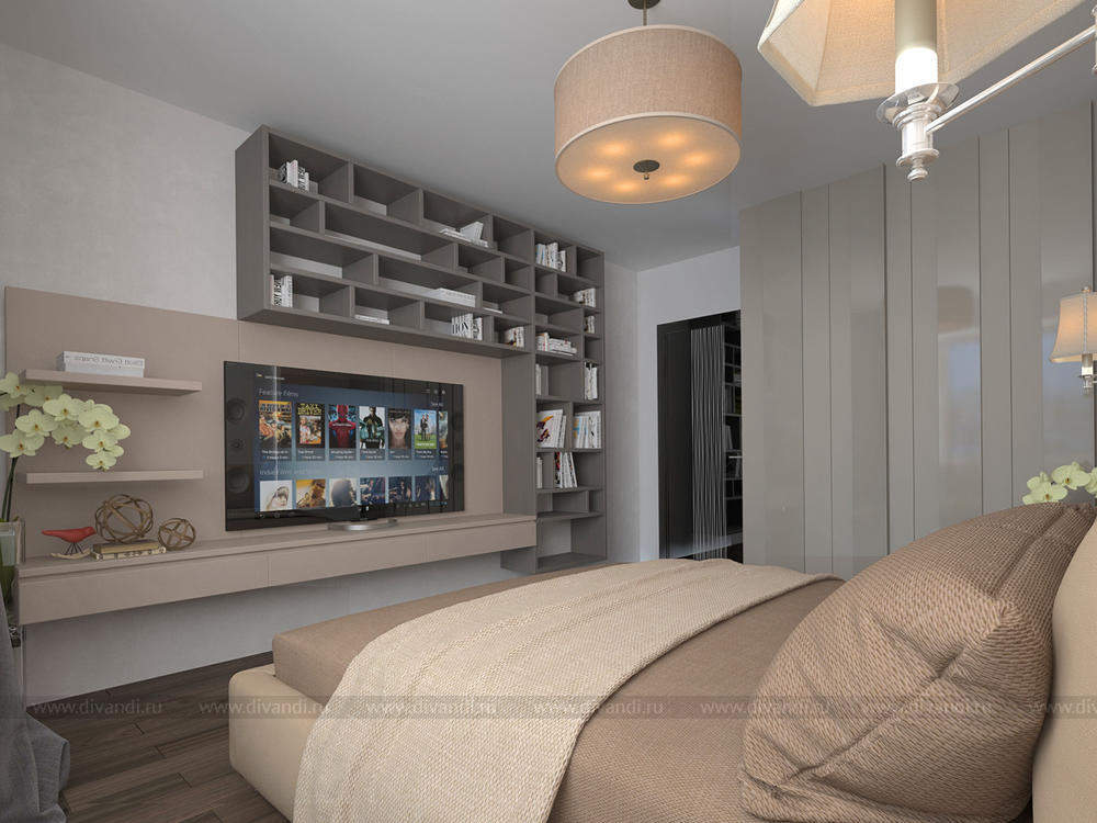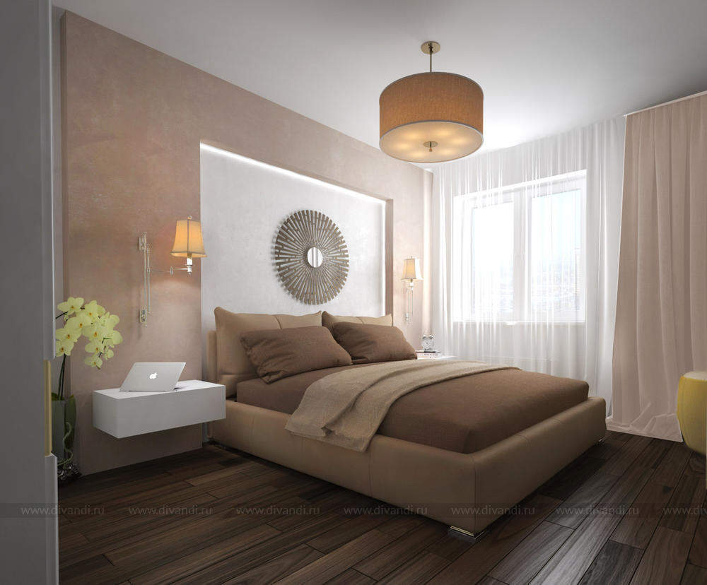 Современная спальная комната в пастельных тонах.