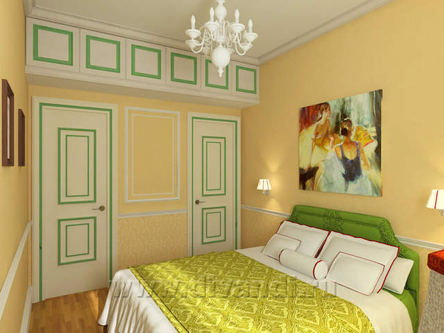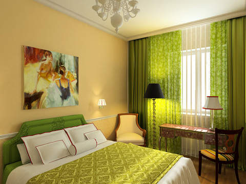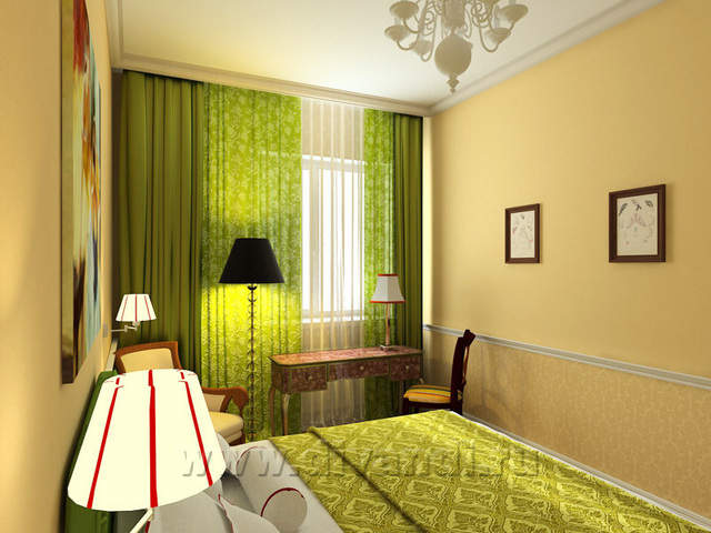Планировка спальни вполне традиционна, но при этом, атмосферу комнаты удалось передать в изысканных тонах эклектики Востока и Прованса. Такое решение позволяет получить полную иллюзию присутствия на Севере Франции. Основной цвет в интерьере – зеленый. Он создает ощущение умиротворения и покоя. Отделка стен выполнена в смешанной технике – сверху отделка декоративной штукатуркой, а внизу - обои на тканевой основе с узорами. Для поддержания общего стиля, подобные узоры цитируются на столике, постельном белье и портьерах. Особую утонченность спальне придает картина, выполненная маслом. Карнизы портьер «спрятаны» за потолочный плинтус, что придает интерьеру мягкую недосказанность и театральную атмосферу.