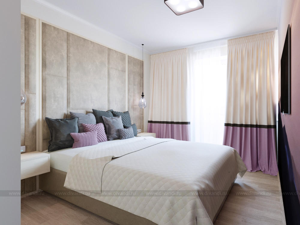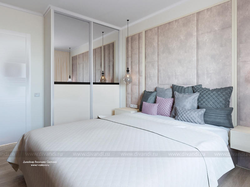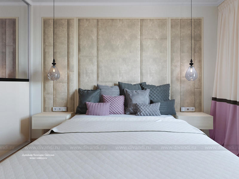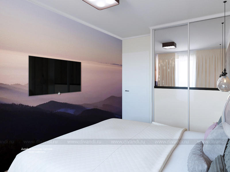 Спальная комната: спокойная и романтичная. Кровать с изголовьем во всю стену, для теплоизоляции, тк стена уличная и очень холодная. Напротив фотообои, которые мы печатали на заказ, с принтом заката в горах!))