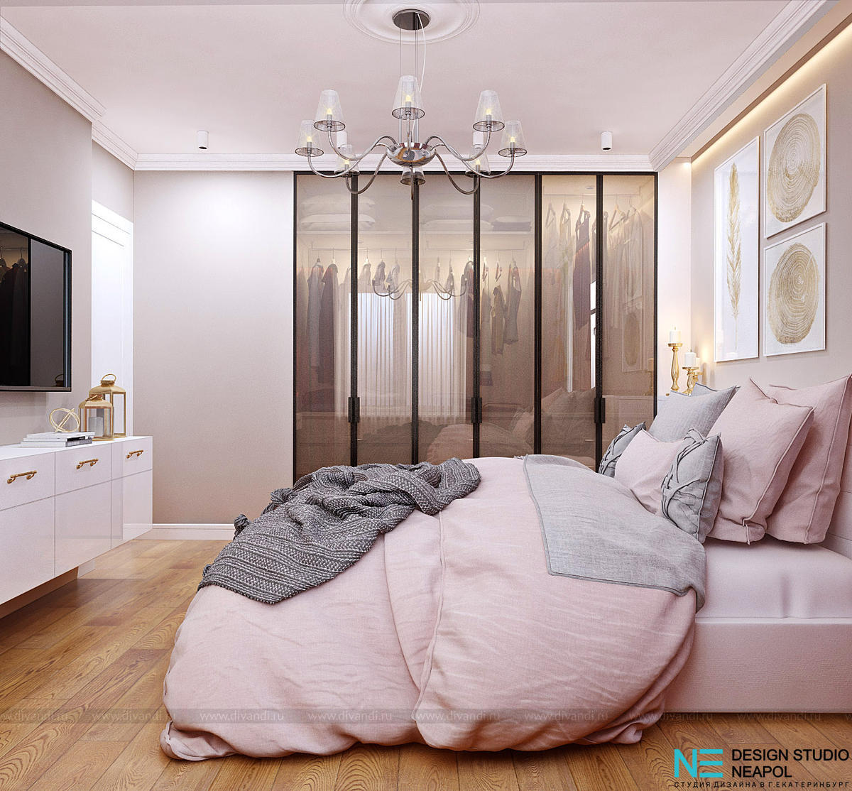 Дизайн-проект спальни из проекта ЖК Московский Квартал. Основной задачей проекта и пожеланием заказчиков было грамотное сочетание нескольких стилей: лофта, классики, современности и востока.