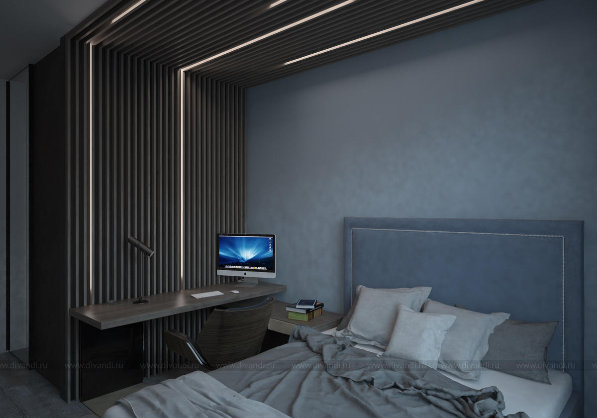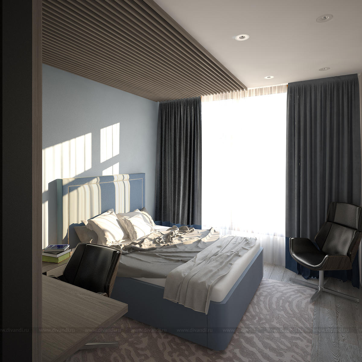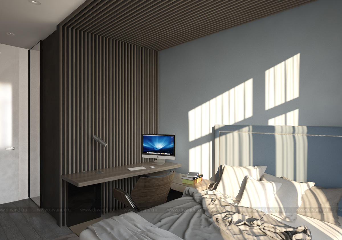 Спальня в холодной цветовой гамме в сочетании с тёплыми предметами текстиля. В комнате предусмотрено рабочее место и книжный шкаф
