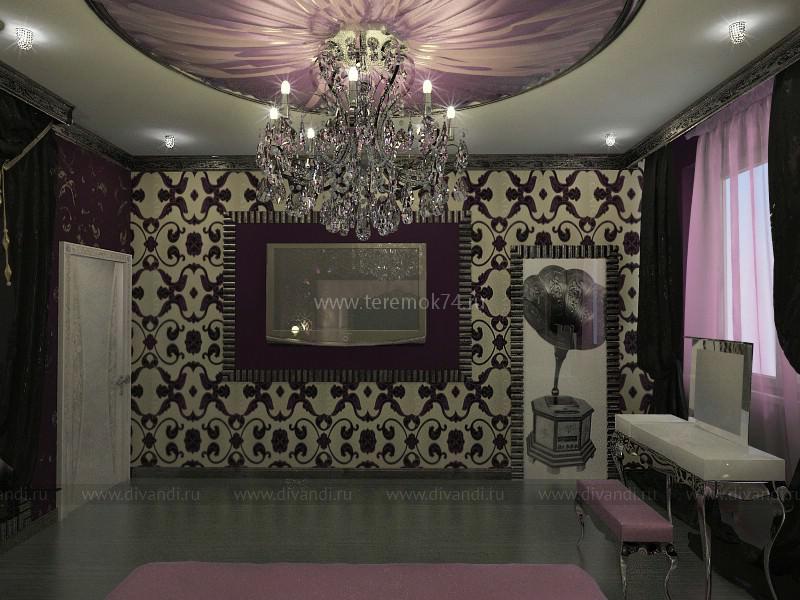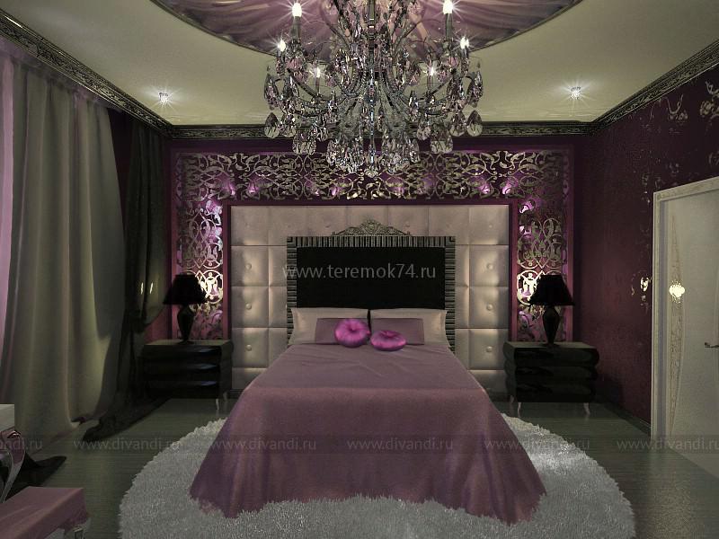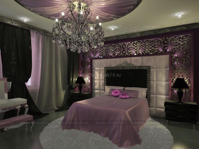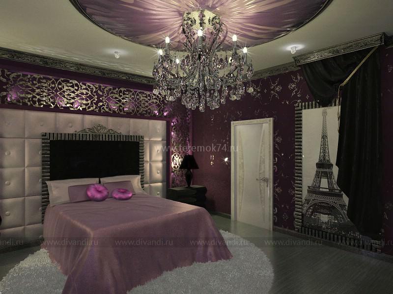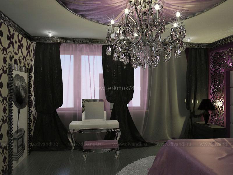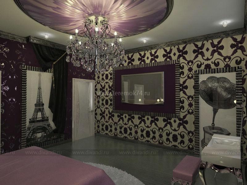 Интерьер этой спальни мы сделали в эклектичном духе. К пожеланиям заказчика, оформить интерьер в ар деко, нами были предложены черно-белые ретро-принты на стеклах в виде эльфивой башни и старинного граммофона для придания шарма и сделать интерьер более индивидуальным. Холодные текстуры патинированного серебра на лепнине, темно-фиолетовые цвета на стенах, черные акценты в текстиле подчеркивают интимность обстановки. Интерьер получился выдержанным в цветовой гамме, но насыщенным контрастами форм.