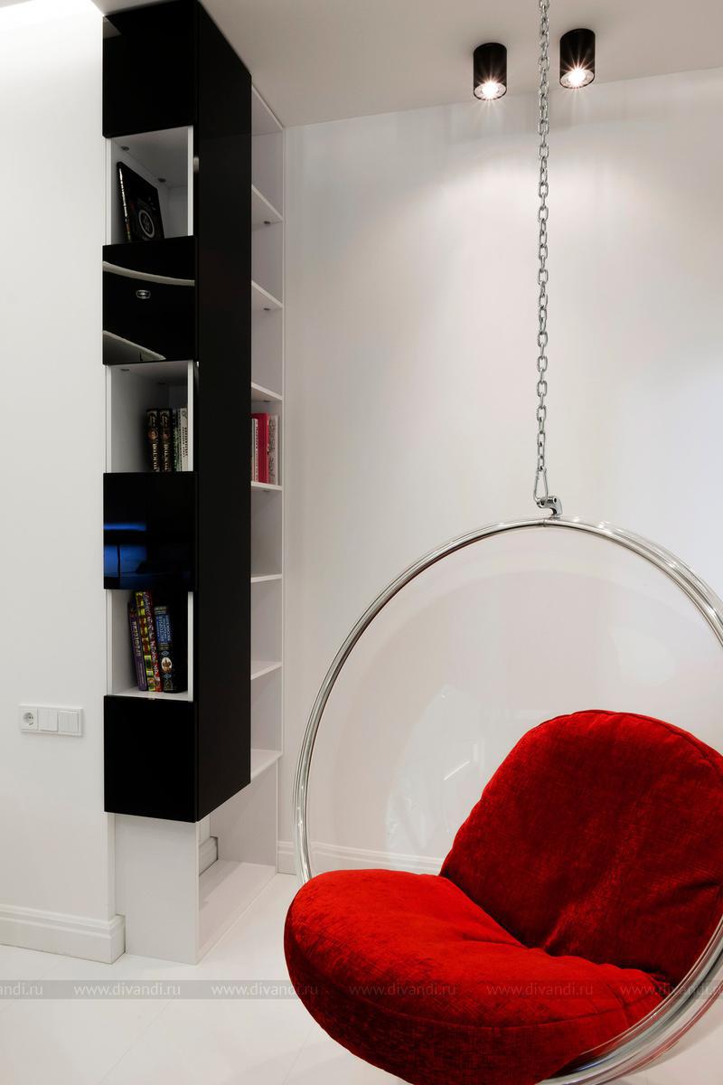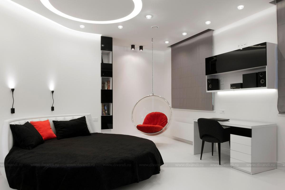 Спальня с контрастным решением для молодой девушки. Преобладание только белого (даже на полу) и черного цвета. Красное кресло в качестве акцента.