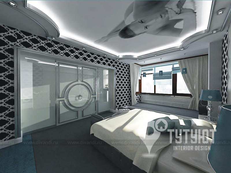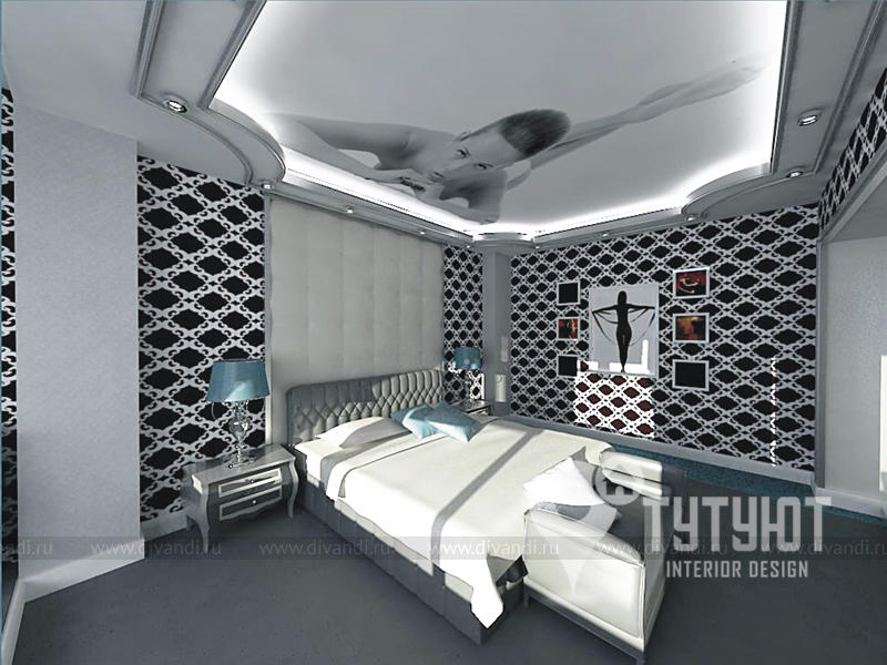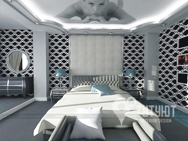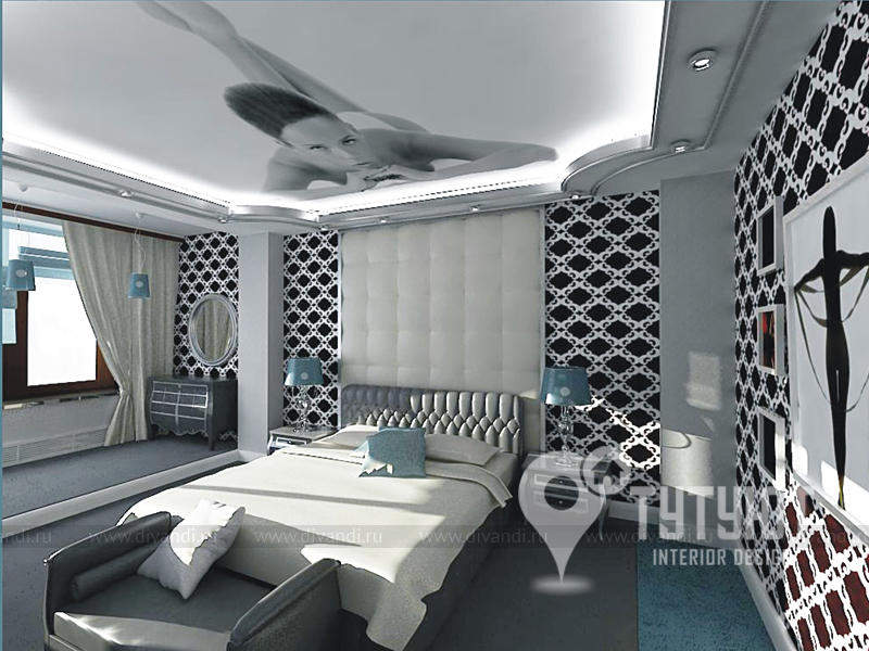 Необычная спальня на контрасте черного и белого с добавлением дымчато-голубых оттенков. На натяжном потолке выполнена фотопечать девушки по желанию заказчика. Вход в спальню - широкий портал, соединяющий ее с холлом. Изголовье кровати выполнено из мягких панелей.