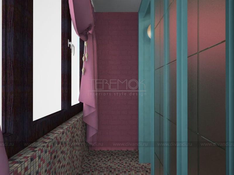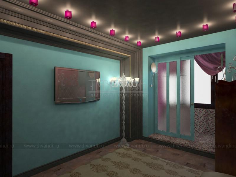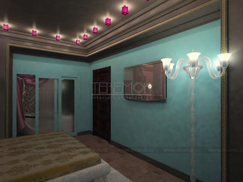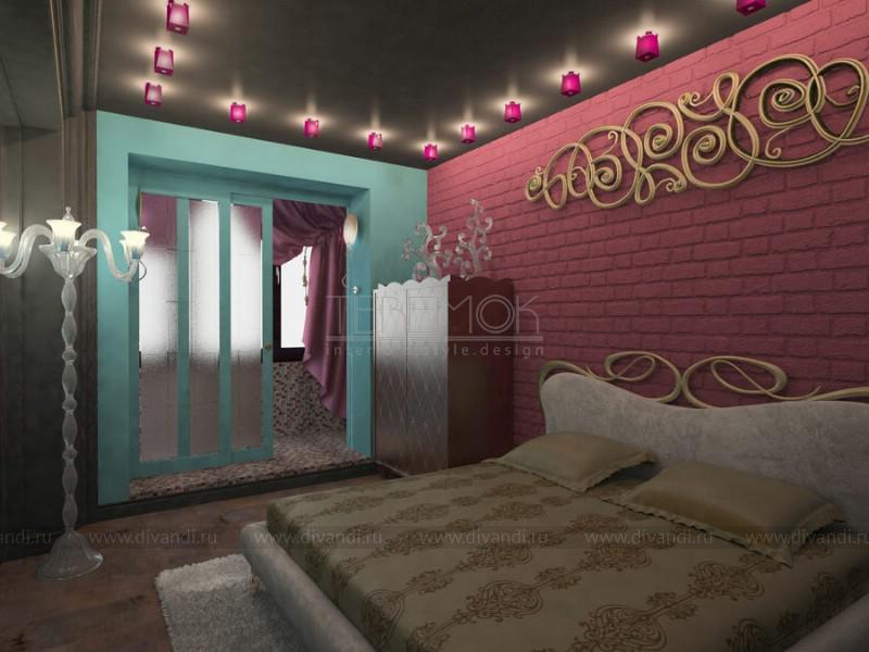 Спальня функционально включила в себя зоны балкона и санузла, разделенные раздвижными перегородками. Несущие балки дома и вентиляционные короба оформили полиуретановой лепниной, которая начинается от пола и продолжается по стене, что создало эффект "рамы". Эту конструкцию и потолок выкрасили темно-серым цветом, стенам были выбраны сложные оттенки голубого и грязно-розового. Освещение было выбрано точечное со светильниками в виде плодов граната, выступая цветовым акцентом на потолке.