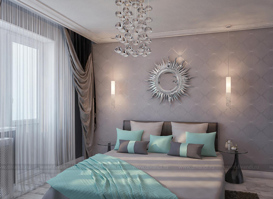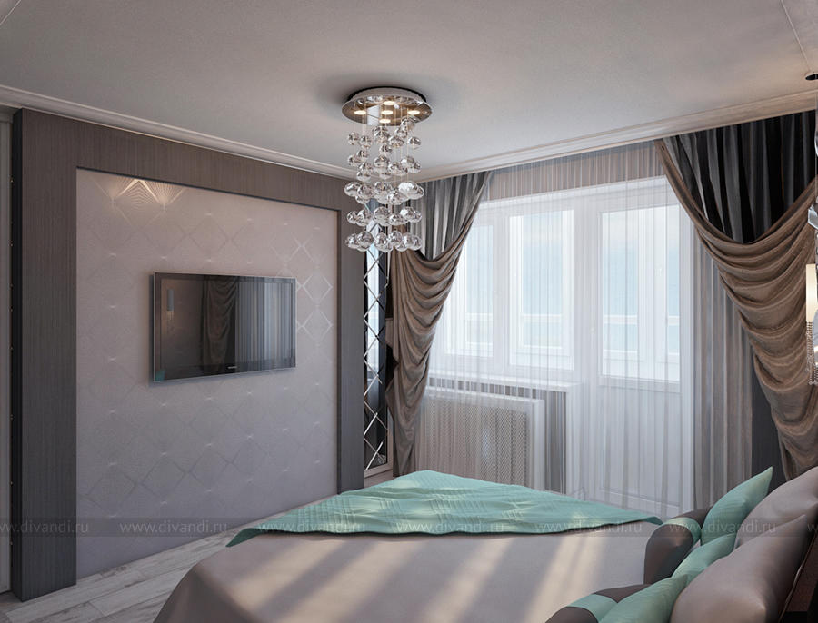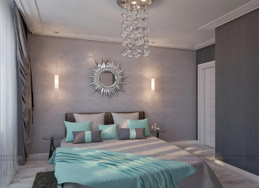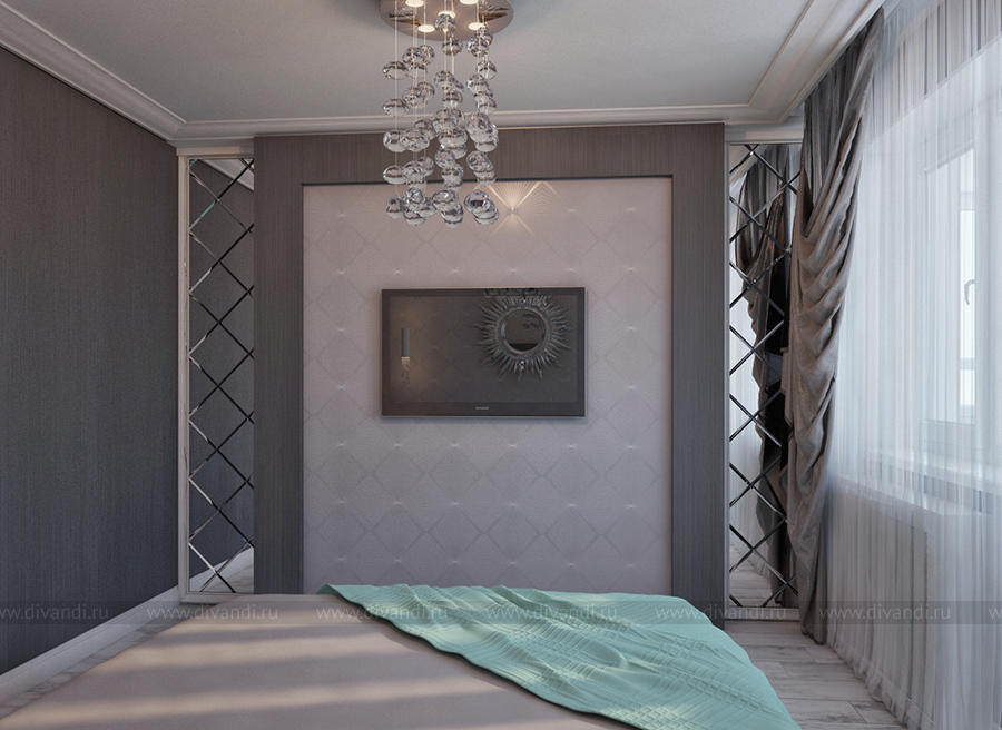 Небольшая спальня смогла вместить в себя еще и гардероб. Было решено отказаться от различных шкафов в пользу гардероба в который можно зайти с двух сторон. Два входа сделаны потому что гардероб разделен на женскую и мужскую части для удобства заказчиков.