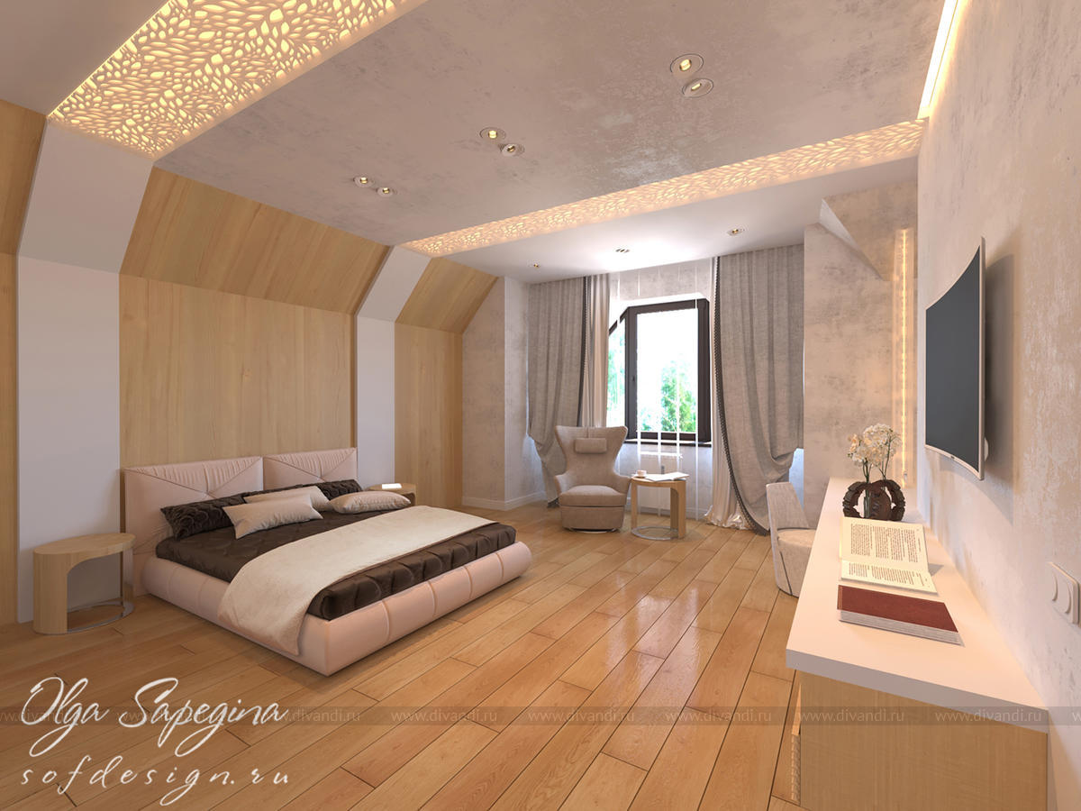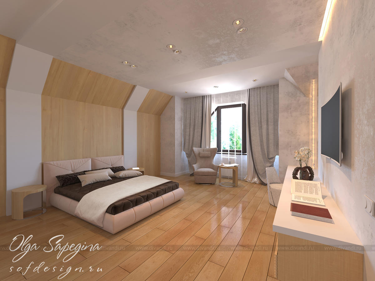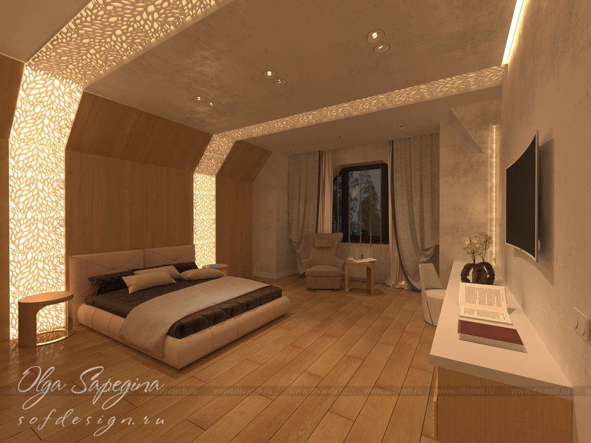 Стена за изголовьем кровати облицована панелями, из кедровой вагонки. Вагонка не обработана, сохраняет свой естественный цвет и кедровый аромат.