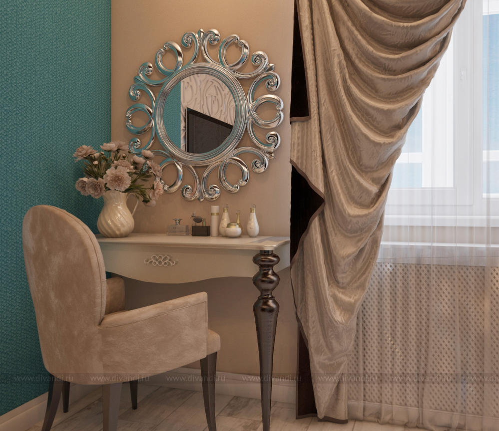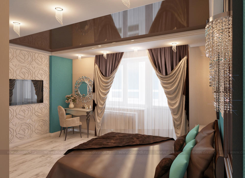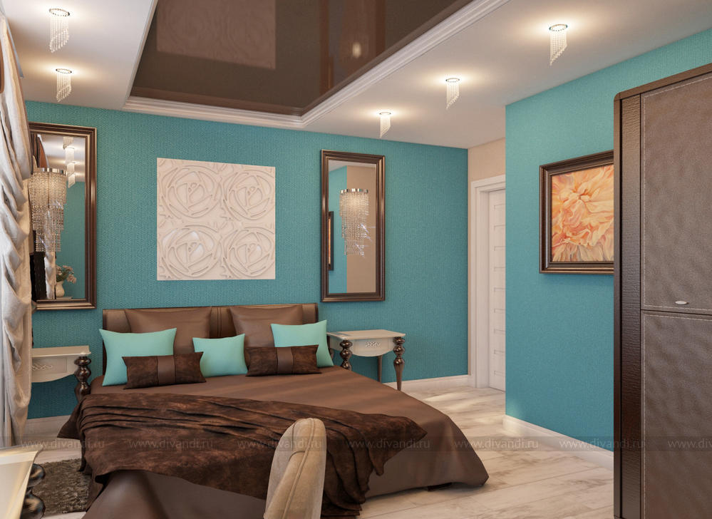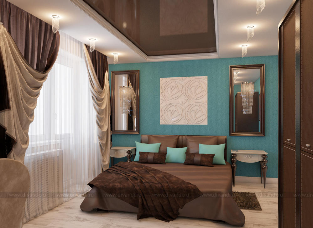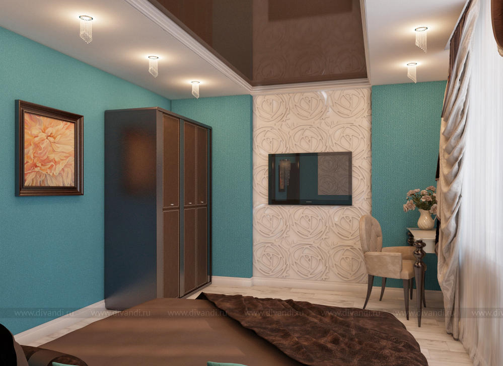 Спальня разработана с учетом существующей мебели(шкаф и кровать), это и задало шоколадную тему интерьера. Цвет морской волны освежает столь сладкий шоколадный цвет.