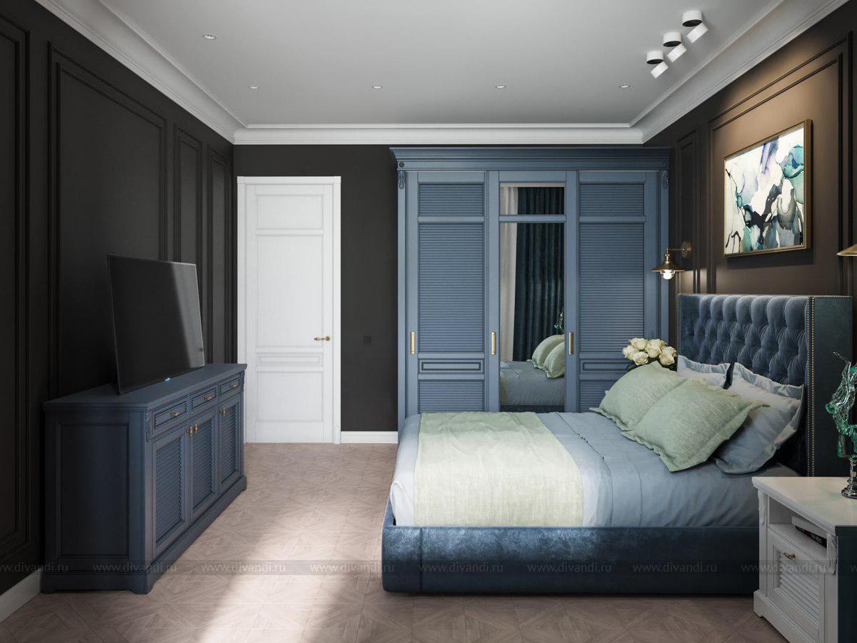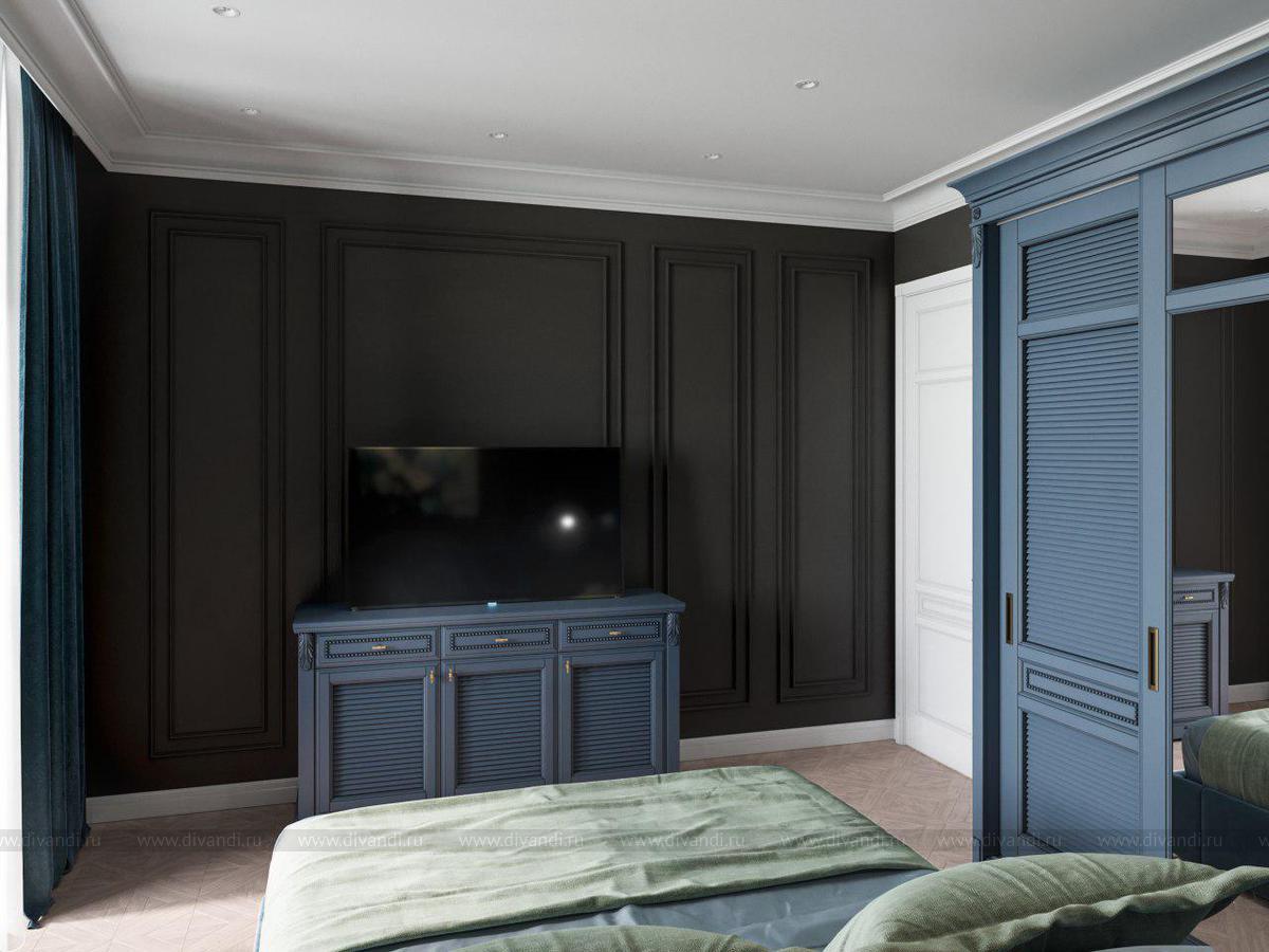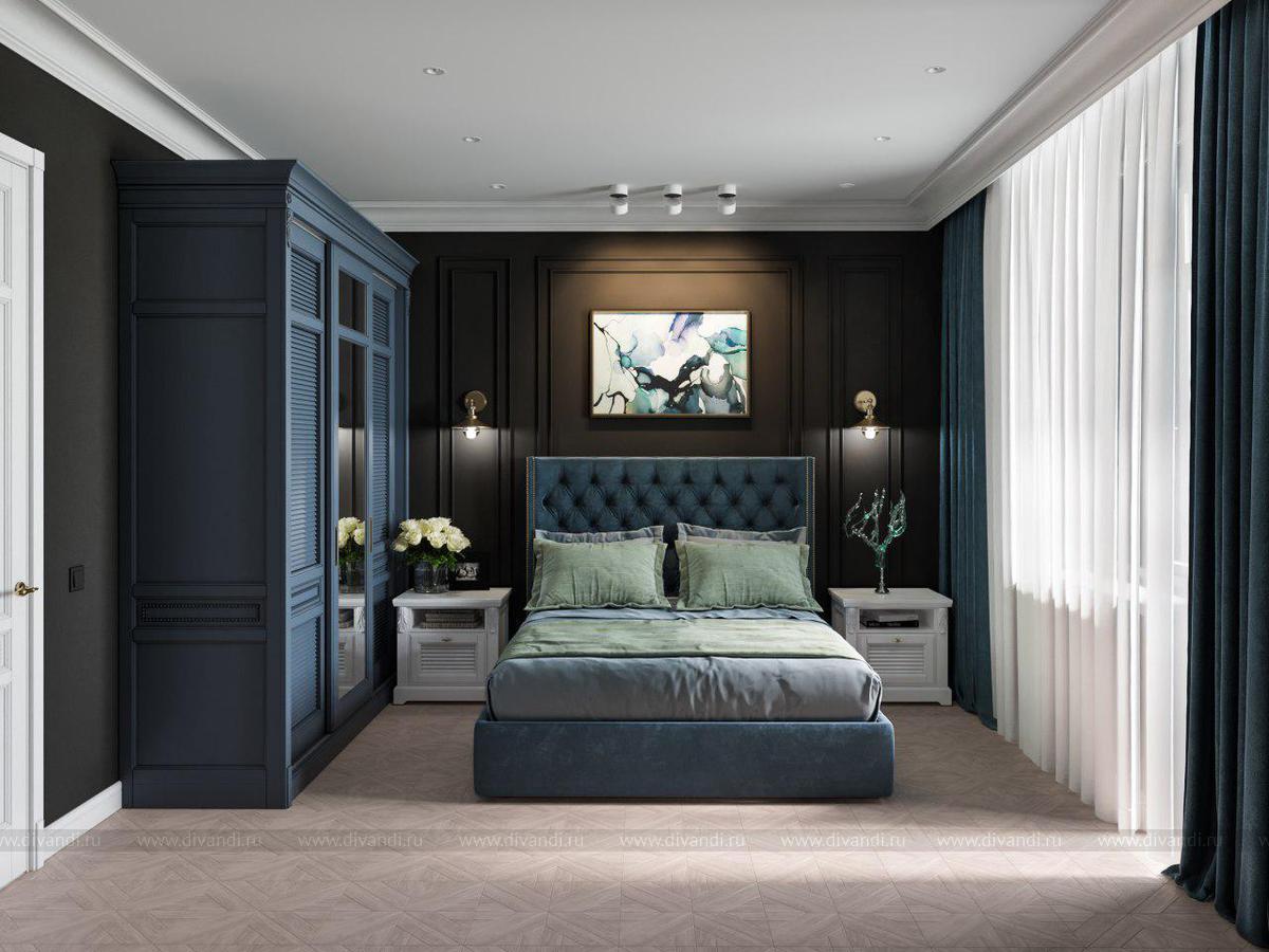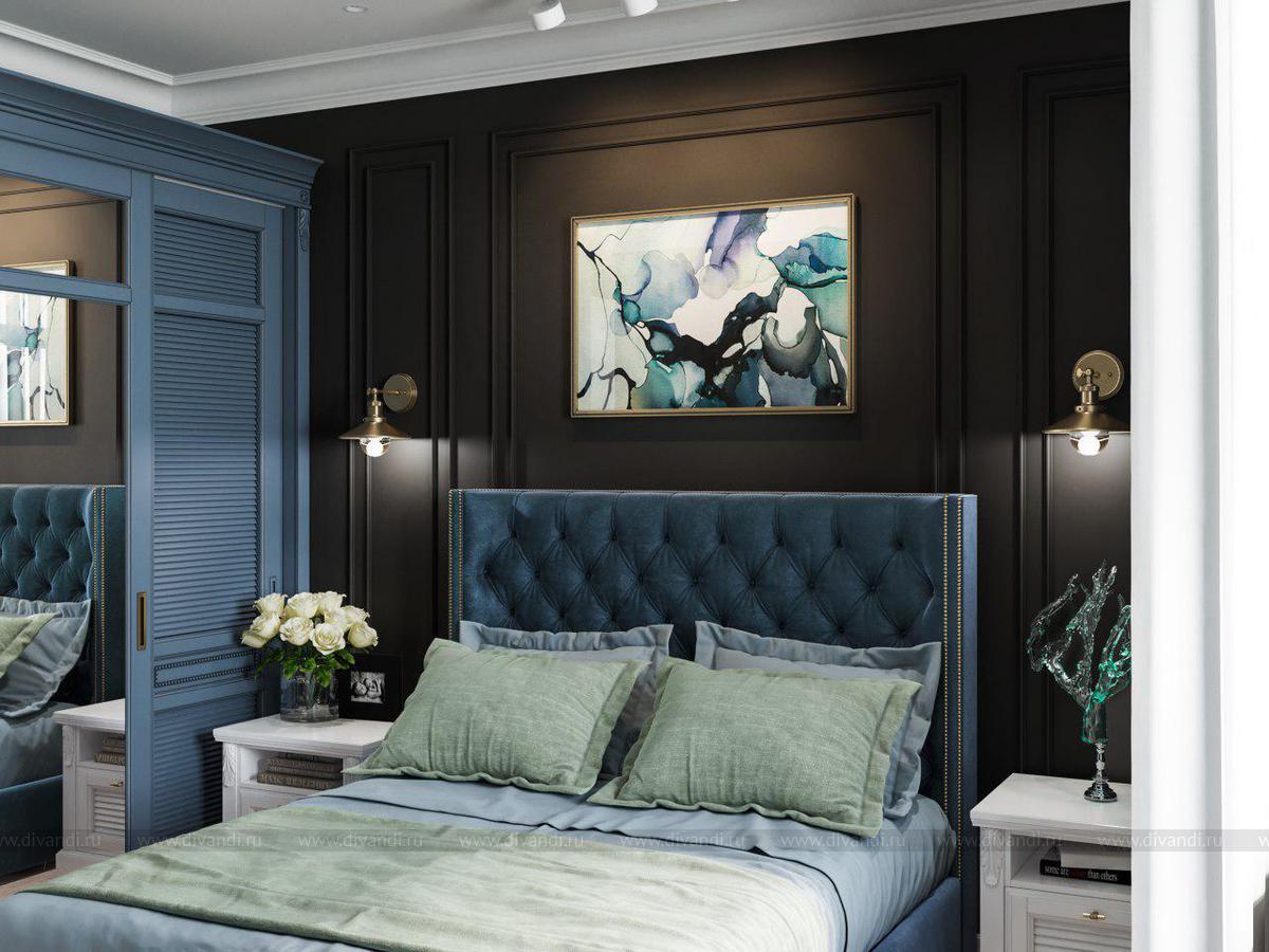Классический интерьер спальни решен в смелом черном цвете и с использованием мебели, выкрашенной модным цветом 2018 года "морской пион"