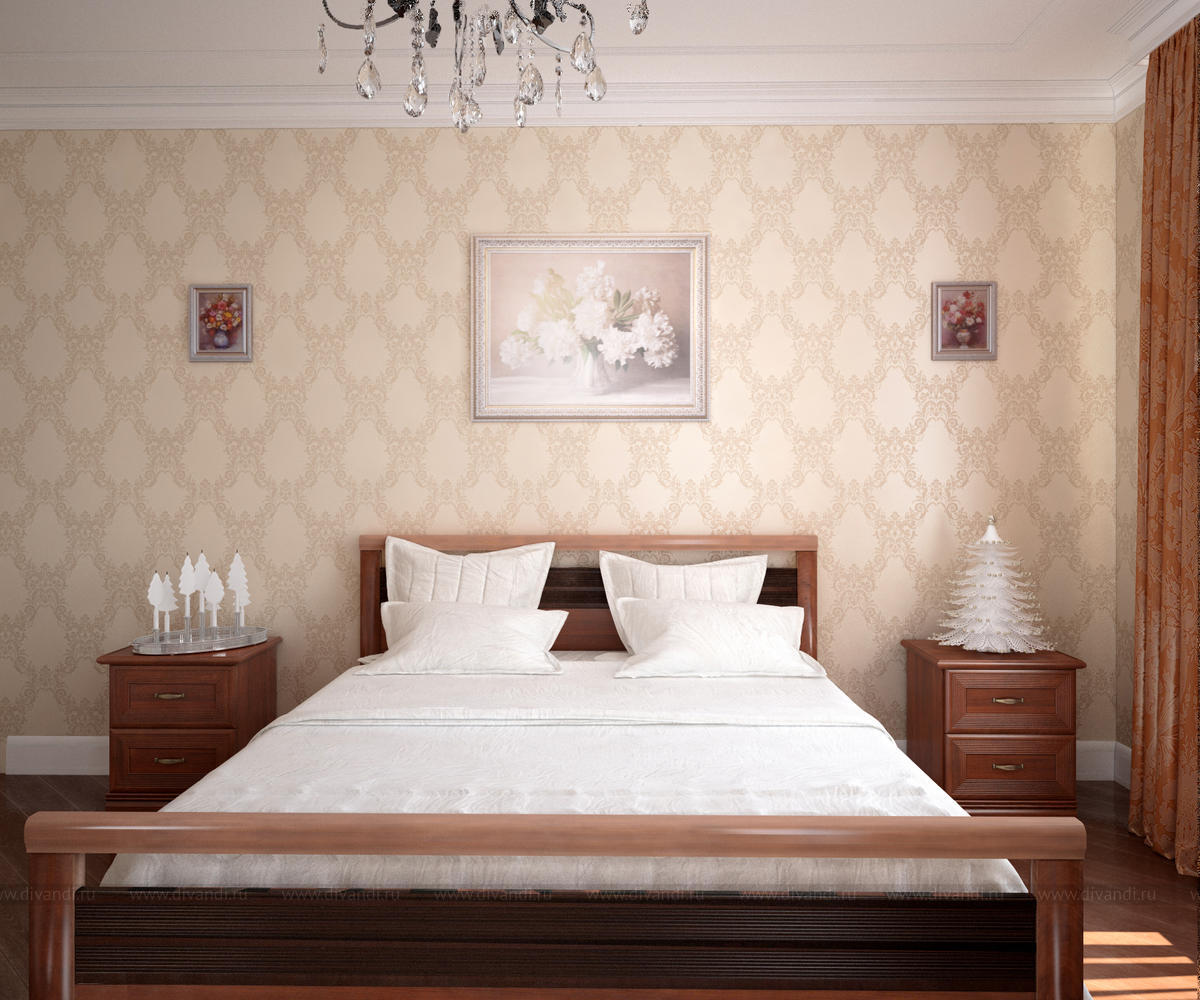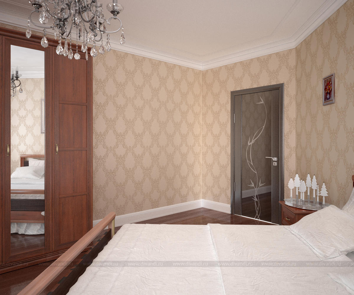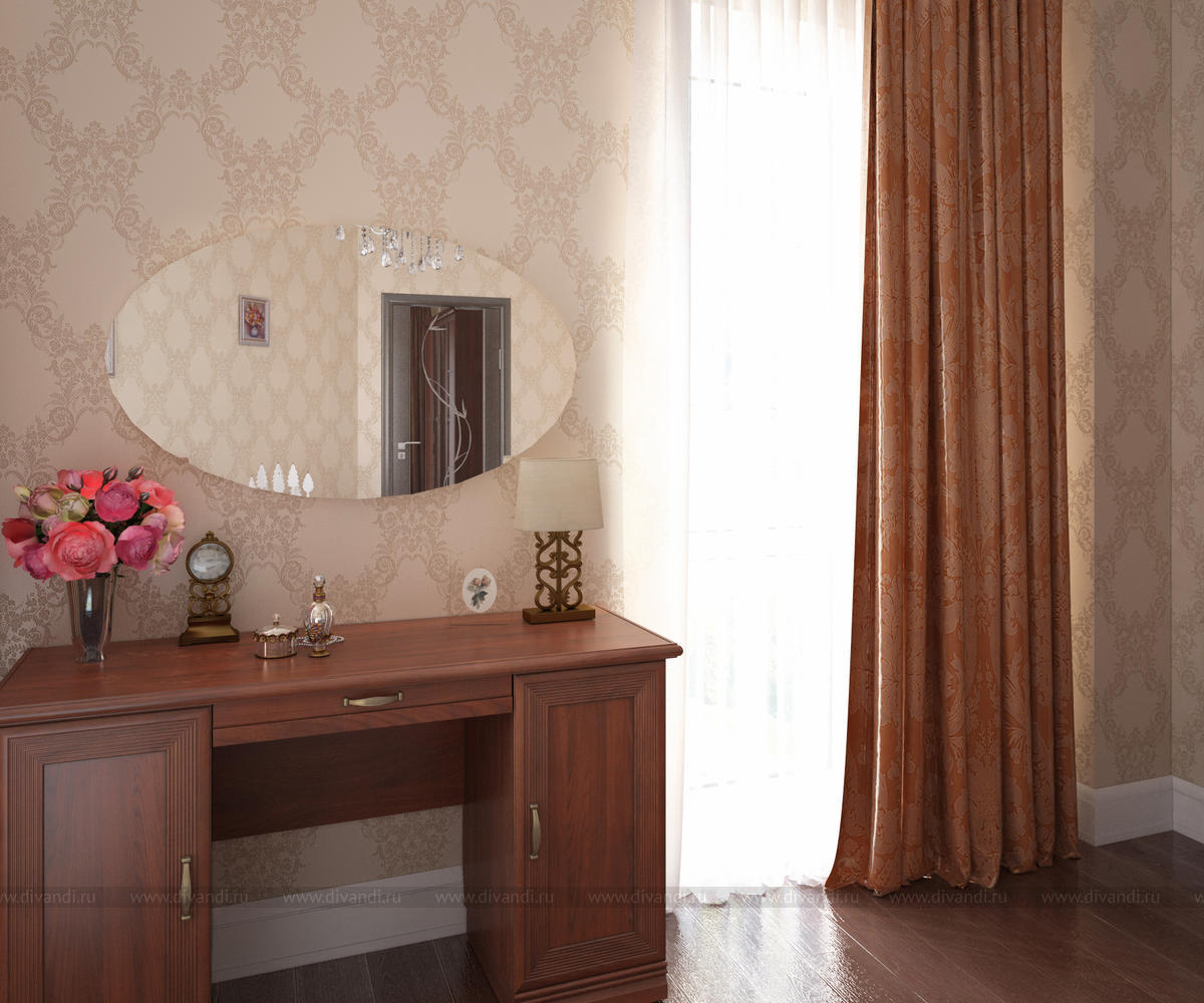 Сложную конфигурацию спальни, смягчили обои с классическим рисунком. Светло-бежевые оттенки придают пространству лоск, и выглядят элегантно. Овальное зеркало, деталь создающая незримую, но ощутимую геометрию, которая так необходима классическому стилю.