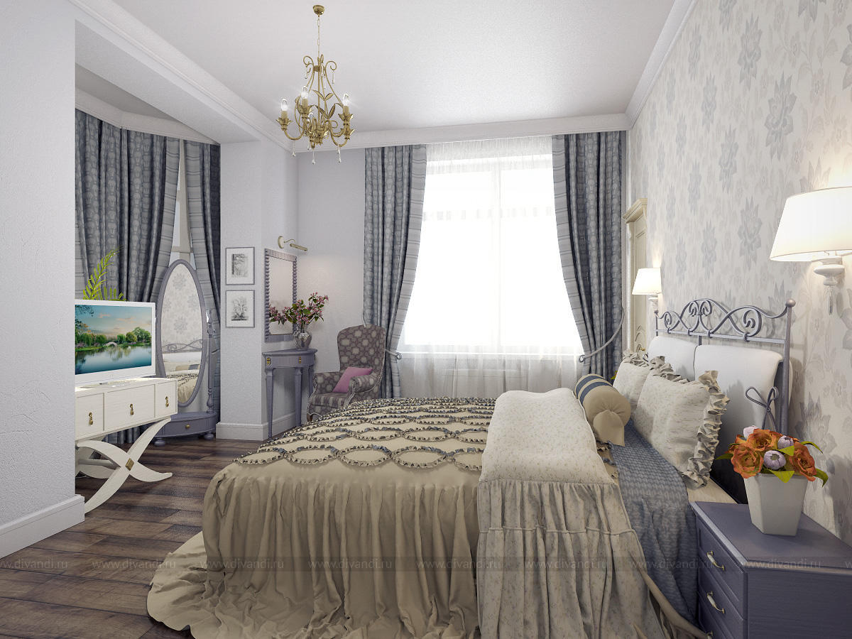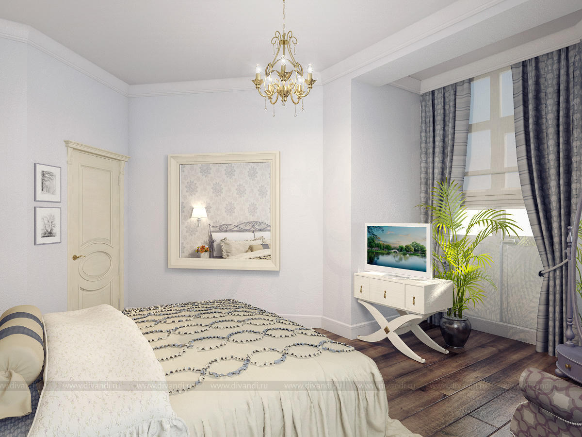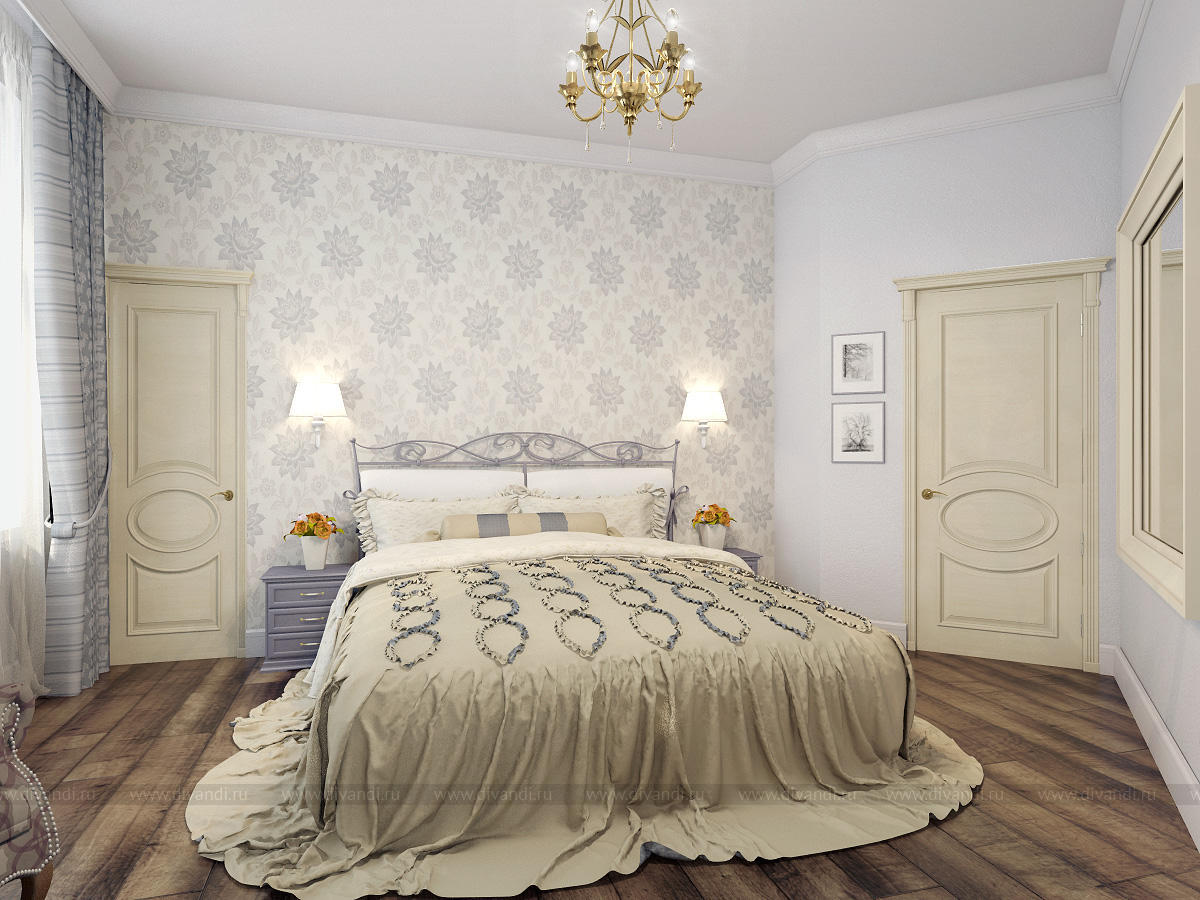 В этой спальне сочетаются нежные пастельные оттенки фиолетового, песочного, бежевого цветов. Насыщенный деревянный пол оттеняет светлое наполнение.