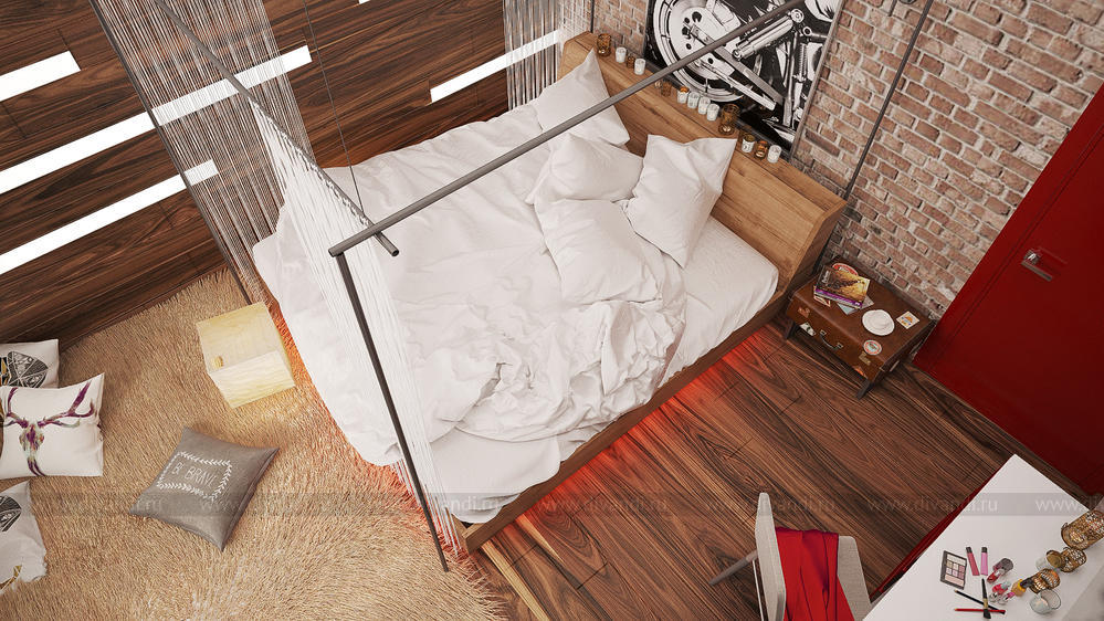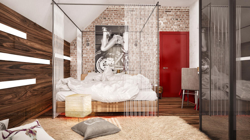 Целью проекта: создать в комнате настроение страсти и сексуальности, поэтому центральное место в спальне отведено просторной удобной кровати. Дизайн интерьера выстроен на контрасте материалов, полупрозрачности намеков и нюансов, ярком красном цвете.