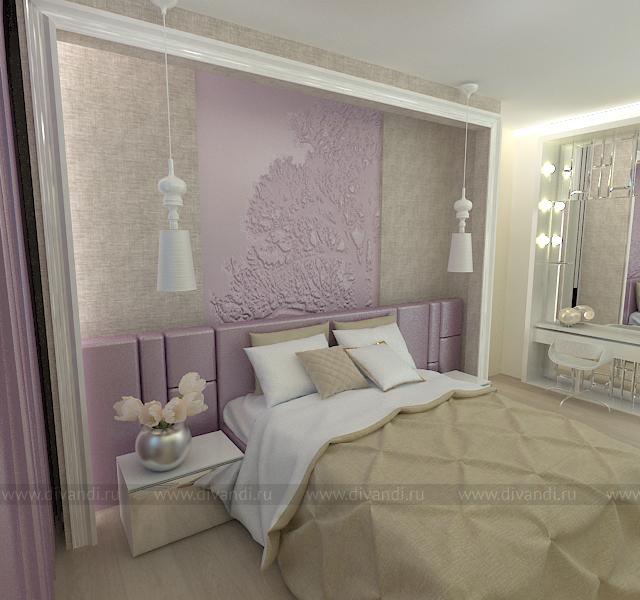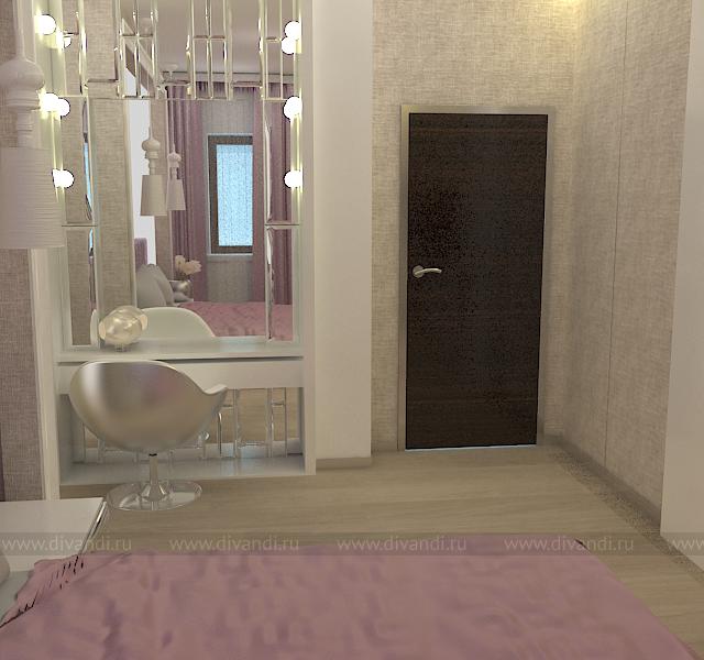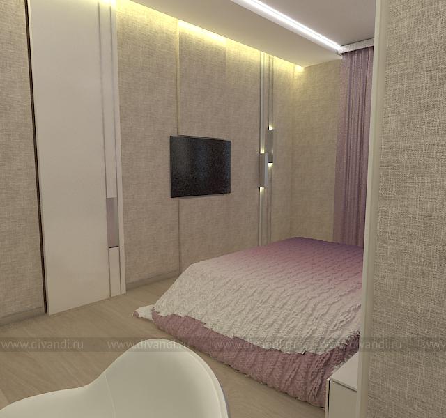 Вниманию зрителя представлена визуализация спальни в едином жилом блоке с гардеробной комнатой и ванной