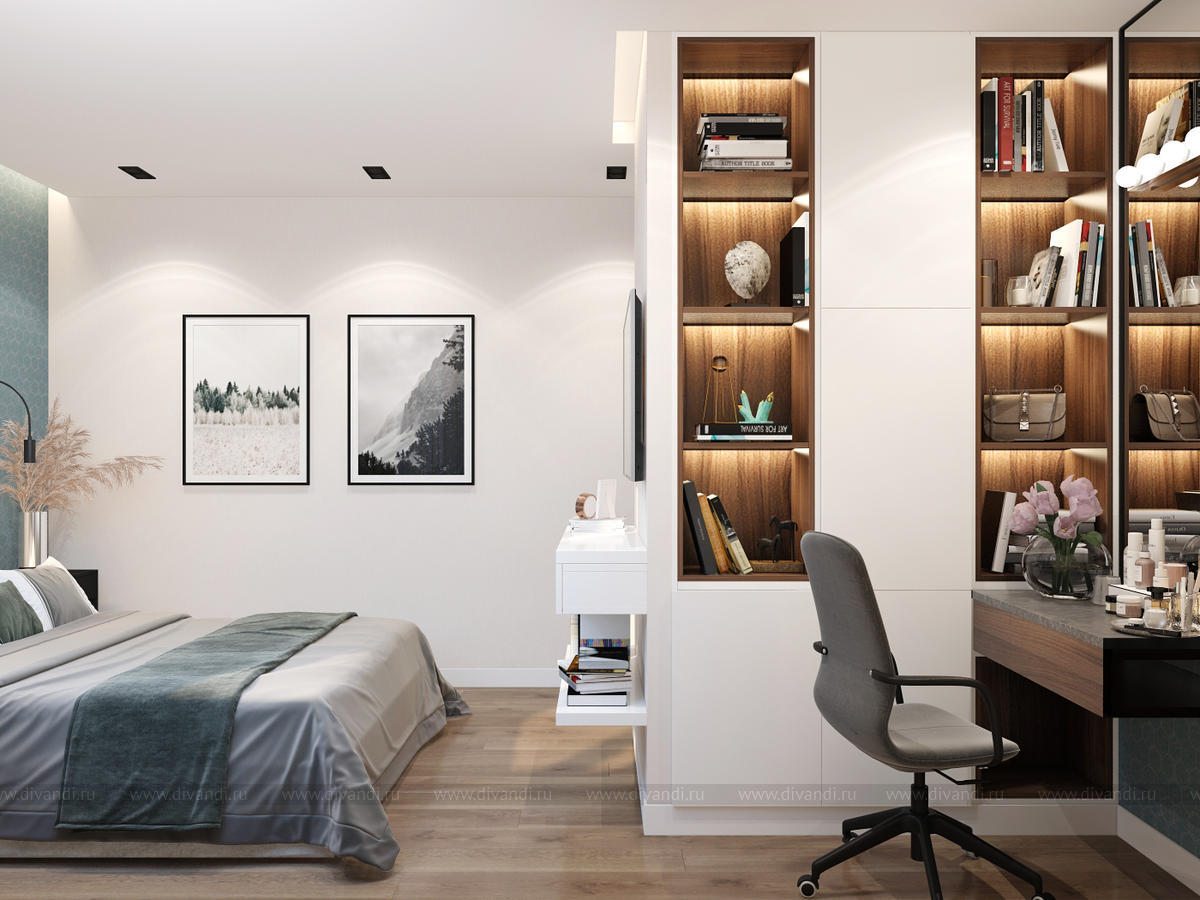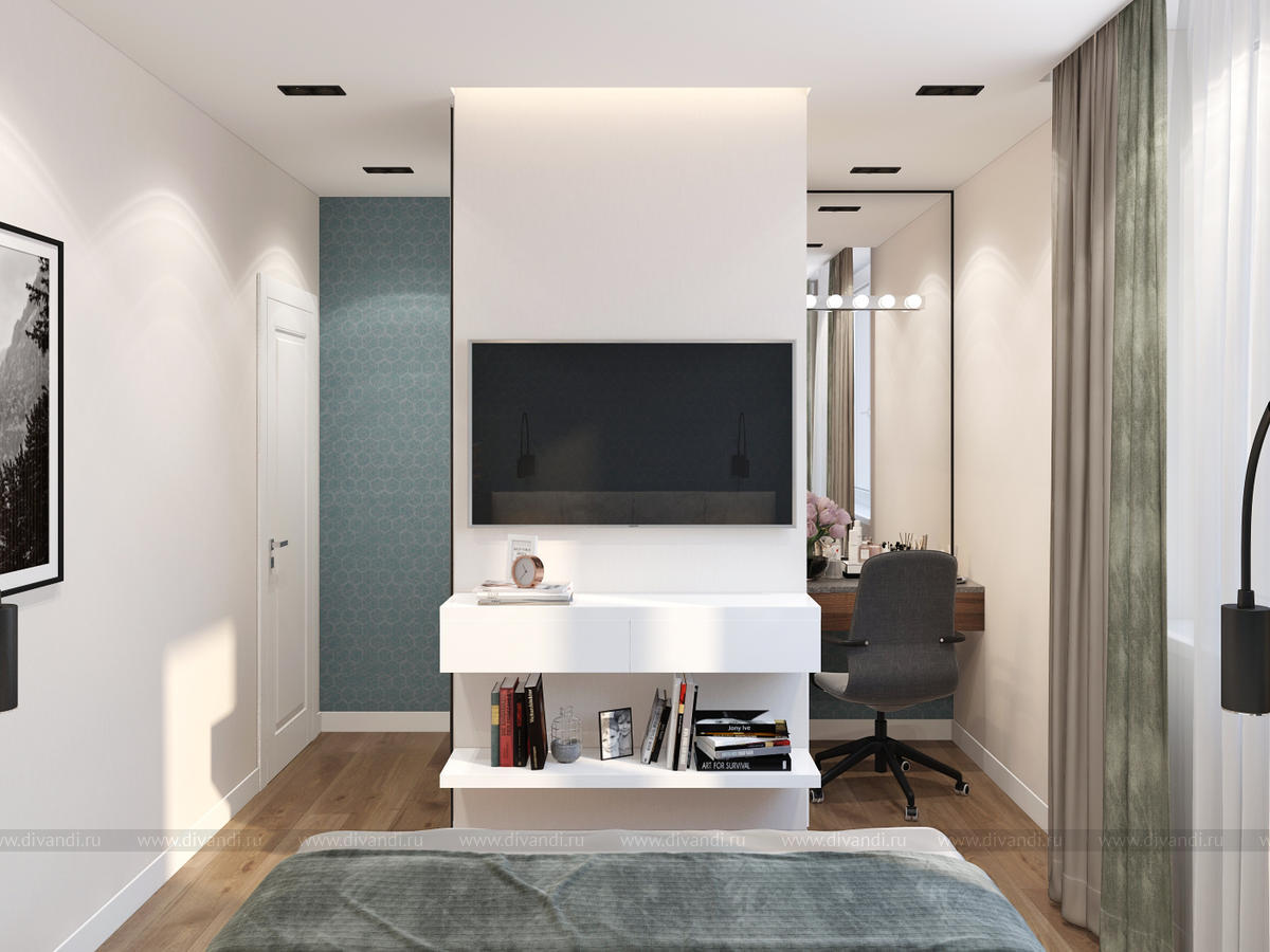 Спальня в квартире, с косметическим столиком, который может использоваться как рабочее место.