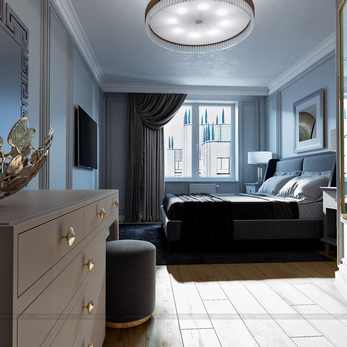Помещение спальни предназначено для качественного сна, расслабления, ухода за собой, обличения себя в некий образ перед выходом в более общую территорию или в социум. В спальне организовано комфортное спальное место в удалении от входа в комнату. Разместилась гардеробная и будуар с зеркалом.