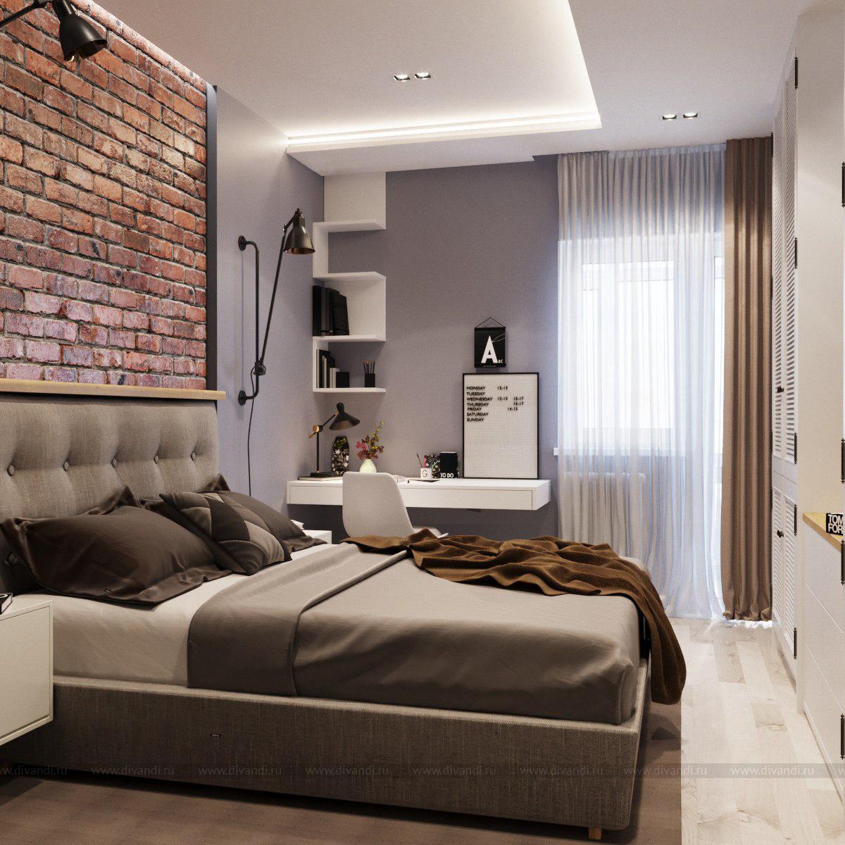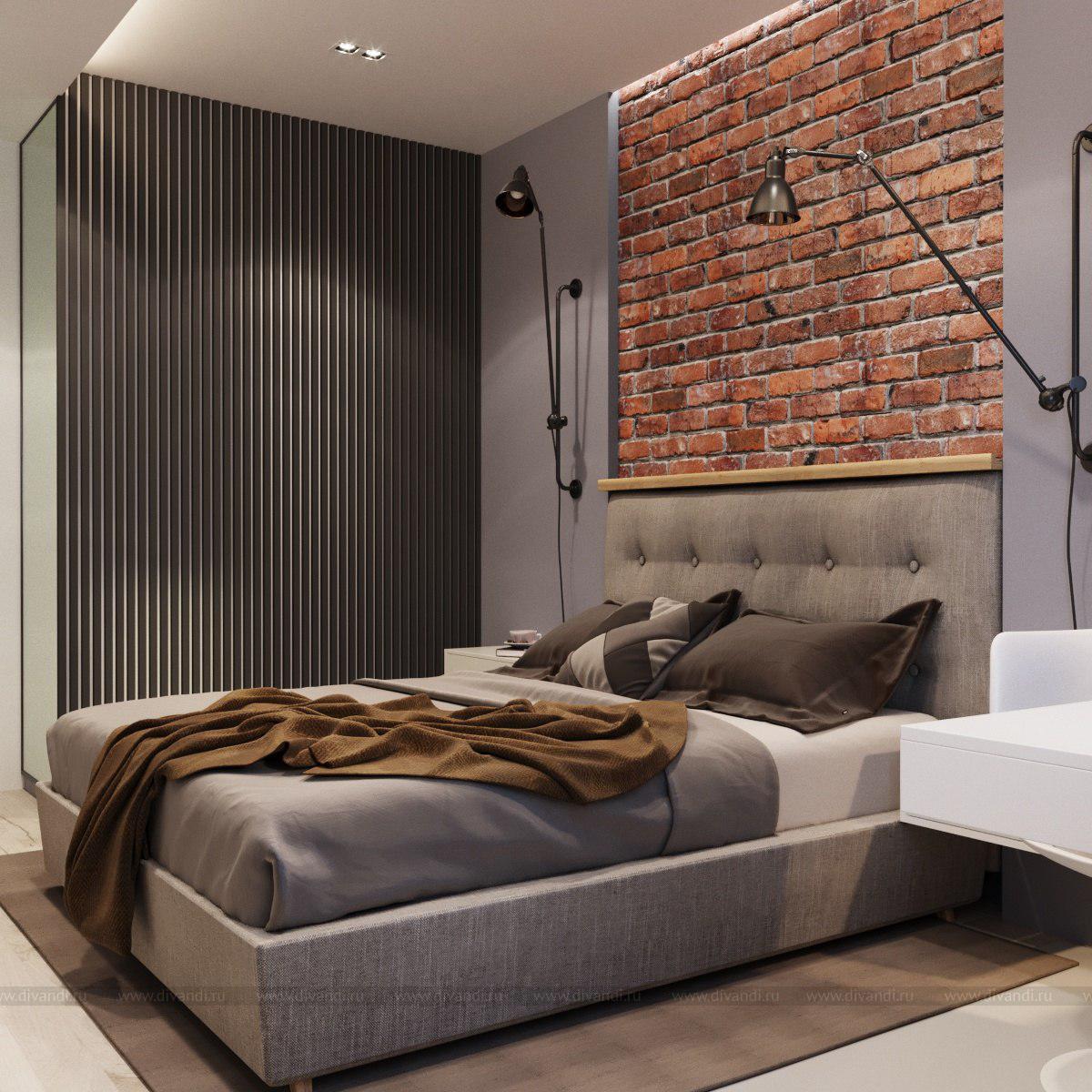 Спальня в стиле лофт. Спальня выдержана в спокойных оттенках с яркими акцентом в виде красного кирпича.
