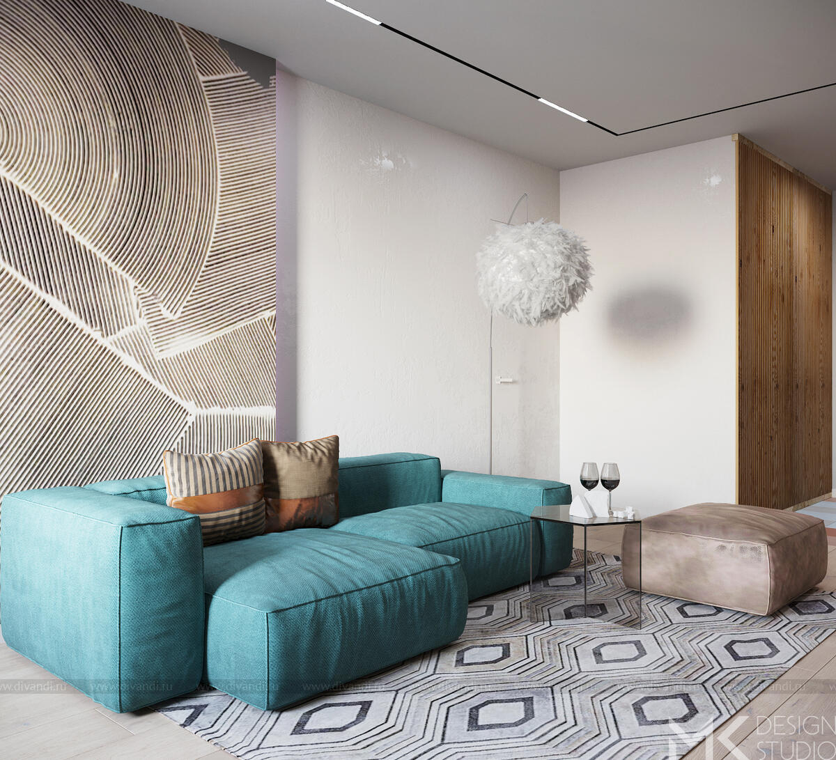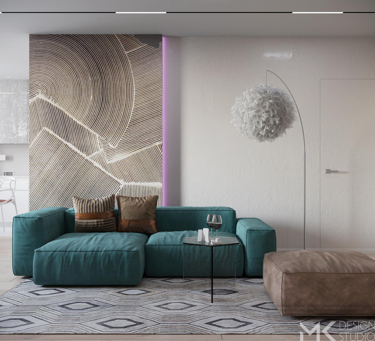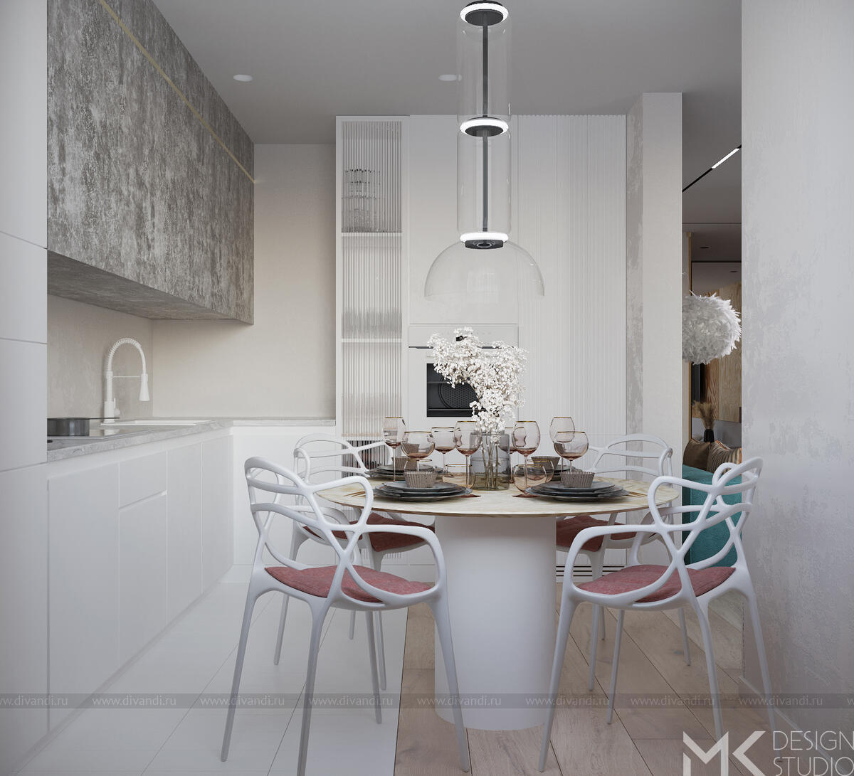 Проект получил название «Статичное искусство». Заходя в прихожую, видим гардеробную, выполненную из реек. За счет этого в ней появился воздух, так как сама она маленькая. И зона прихожей стала не проходной, как было на изначальном плане. Следуя идее реек, переводим на пол этот ритм и меняем текстуру и фактуру - появляется игра форм. В гостиной расположился акцентный яркий диван и фактурное панно за ним, которое подсвечено сбоку светодиодной лентой, создавая разное настроение. Так как кухня небольшая, было принято решение создать там невесомость и визуально убрать акцент с нее. Поэтому выбрали светлые материалы в отделке фасадов, стола и стульев. Стулья напоминают сплетение растений и вместе с невесомой люстрой получился тот самый "растворяющийся" эффект. Выглядит как застывшее искусство.