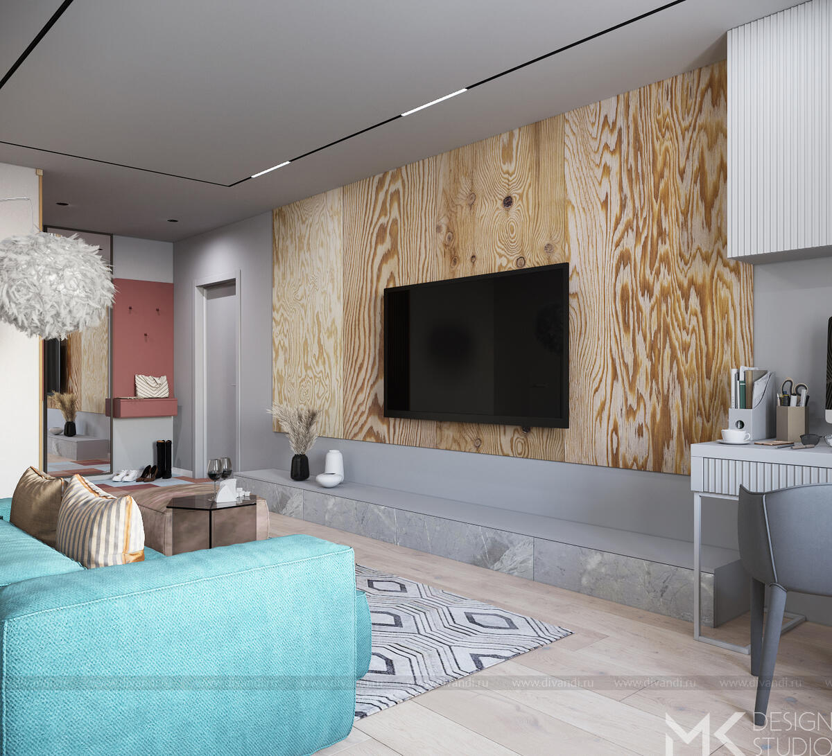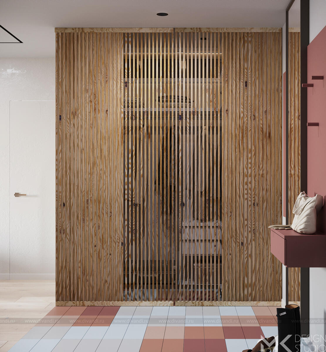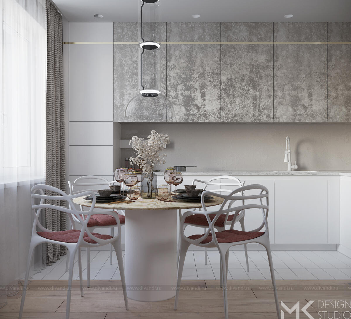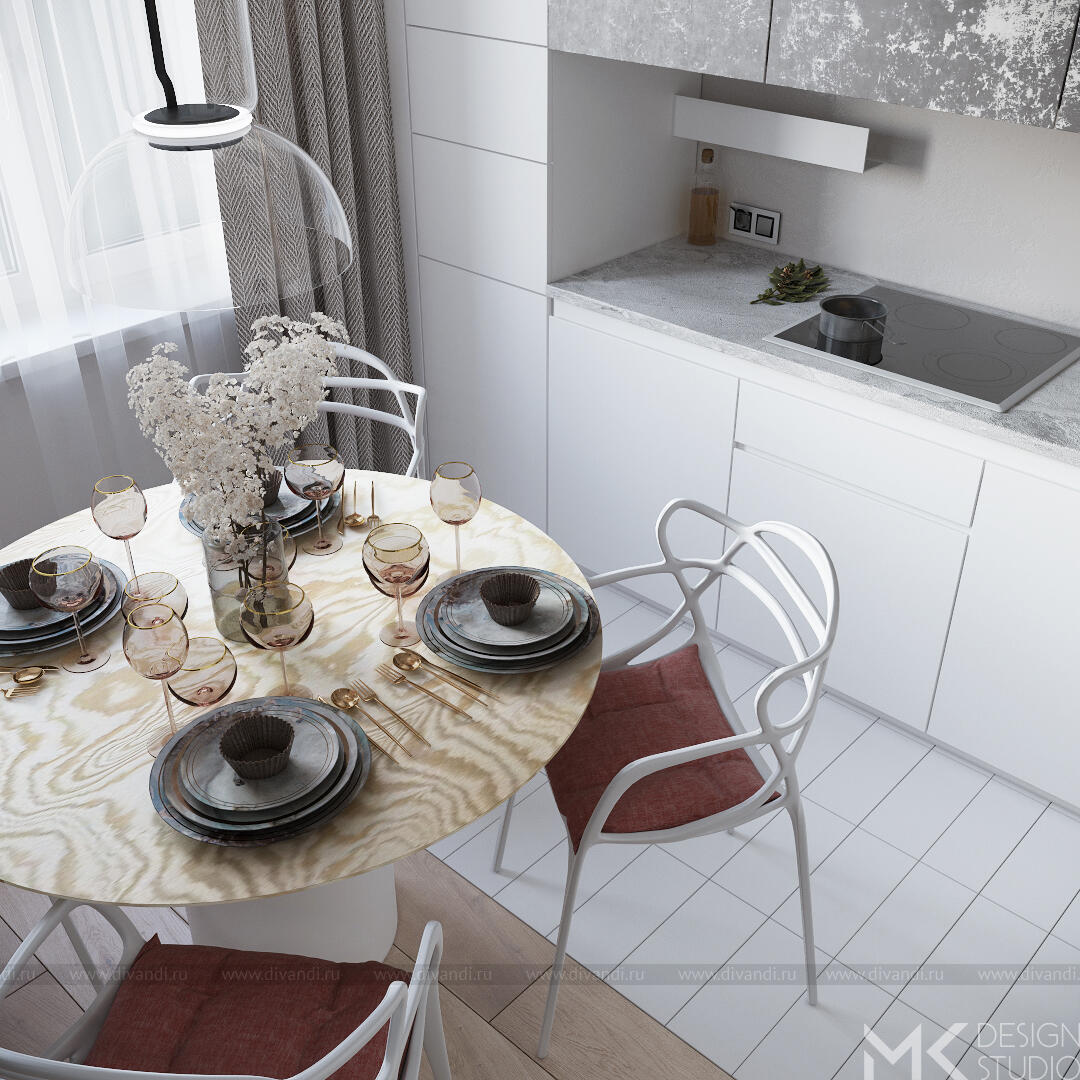 Проект получил название «Статичное искусство». Заходя в прихожую, видим гардеробную, выполненную из реек. За счет этого в ней появился воздух, так как сама она маленькая. И зона прихожей стала не проходной, как было на изначальном плане. Следуя идее реек, переводим на пол этот ритм и меняем текстуру и фактуру - появляется игра форм. В гостиной расположился акцентный яркий диван и фактурное панно за ним, которое подсвечено сбоку светодиодной лентой, создавая разное настроение. Так как кухня небольшая, было принято решение создать там невесомость и визуально убрать акцент с нее. Поэтому выбрали светлые материалы в отделке фасадов, стола и стульев. Стулья напоминают сплетение растений и вместе с невесомой люстрой получился тот самый "растворяющийся" эффект. Выглядит как застывшее искусство.