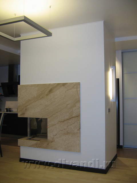 Заказчиками была поставлена задача-получить максимально просторный и воздушный интерьер. Для достижения поставленной цели была применина тчательная перепланировка и некоторые декоративные приемы. Большое внимание в проекте уделено встроеной и другой мебели. Также спроектированы световые сцены, приемущественно светильниками со скрытым источником освещения. И при всей открытости интерьера гостиная получилась функциональной ,например из зоны отдыха не просматриваются прихожая и рабочая зона кухни. А применение качественных, натуральных материалов и био-камин, создают еще более уютную атмосферу.