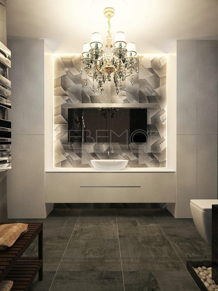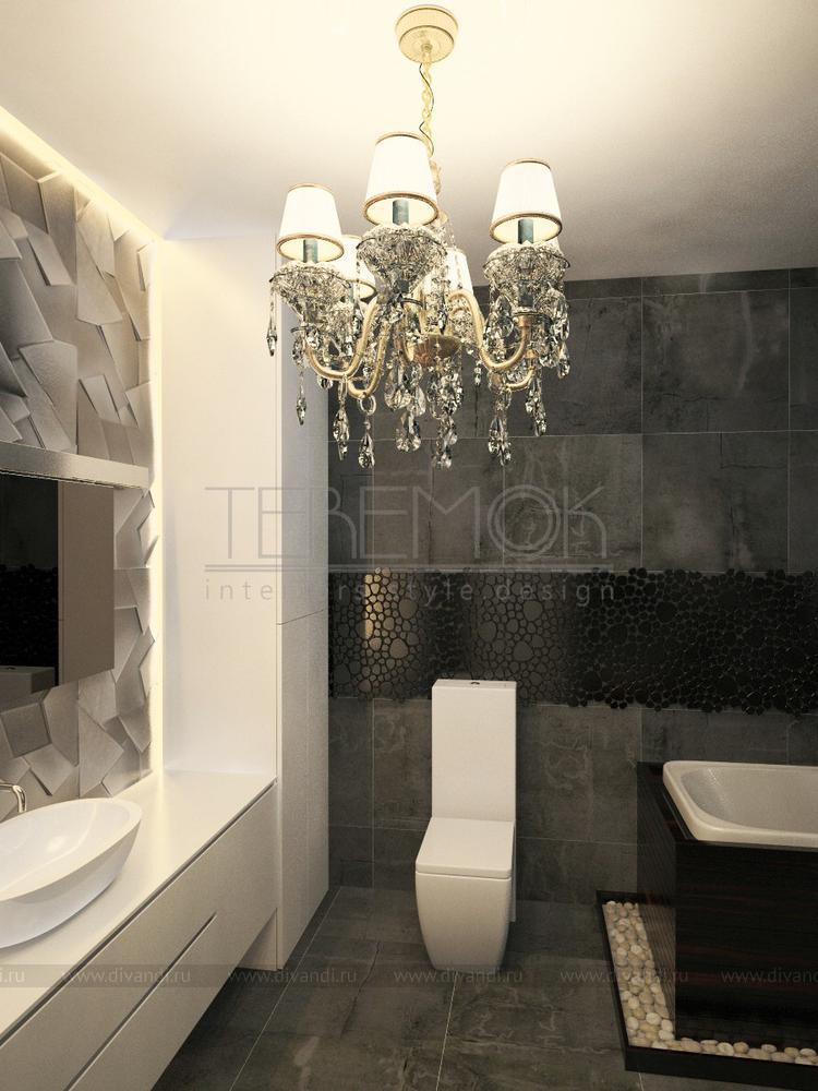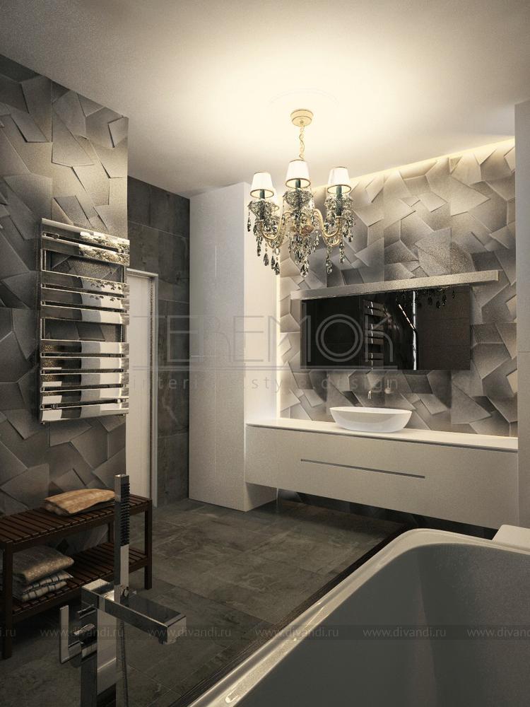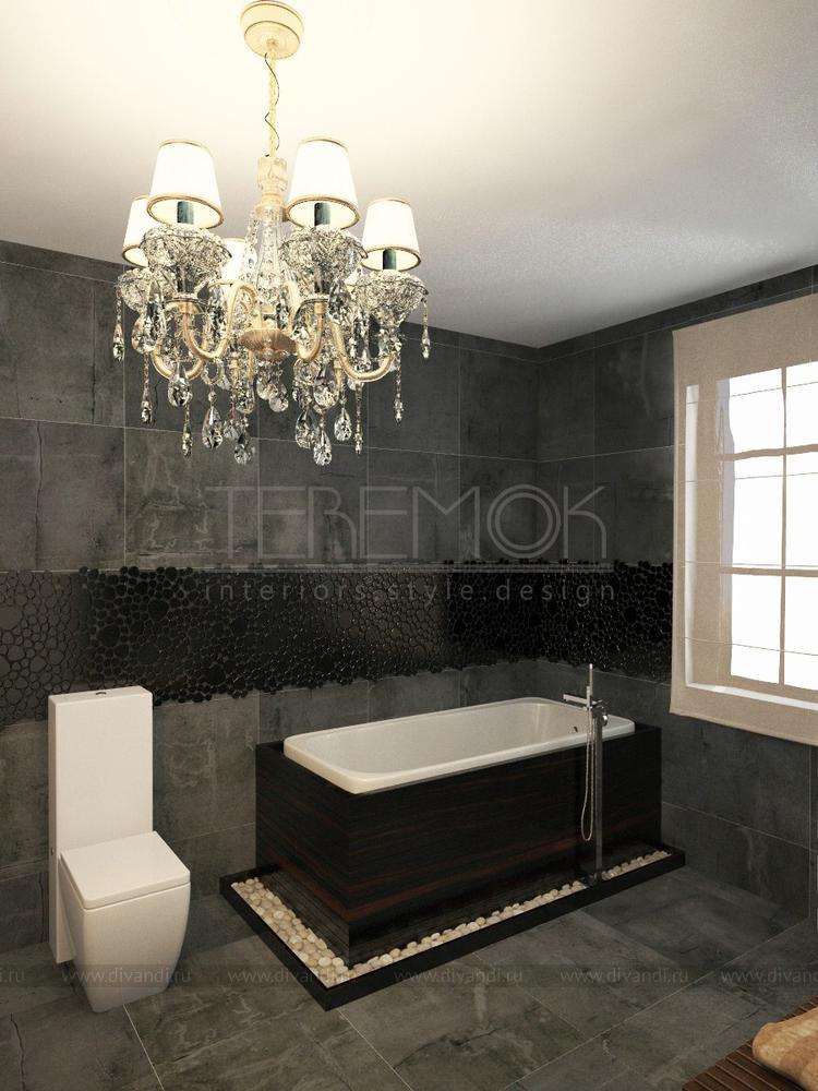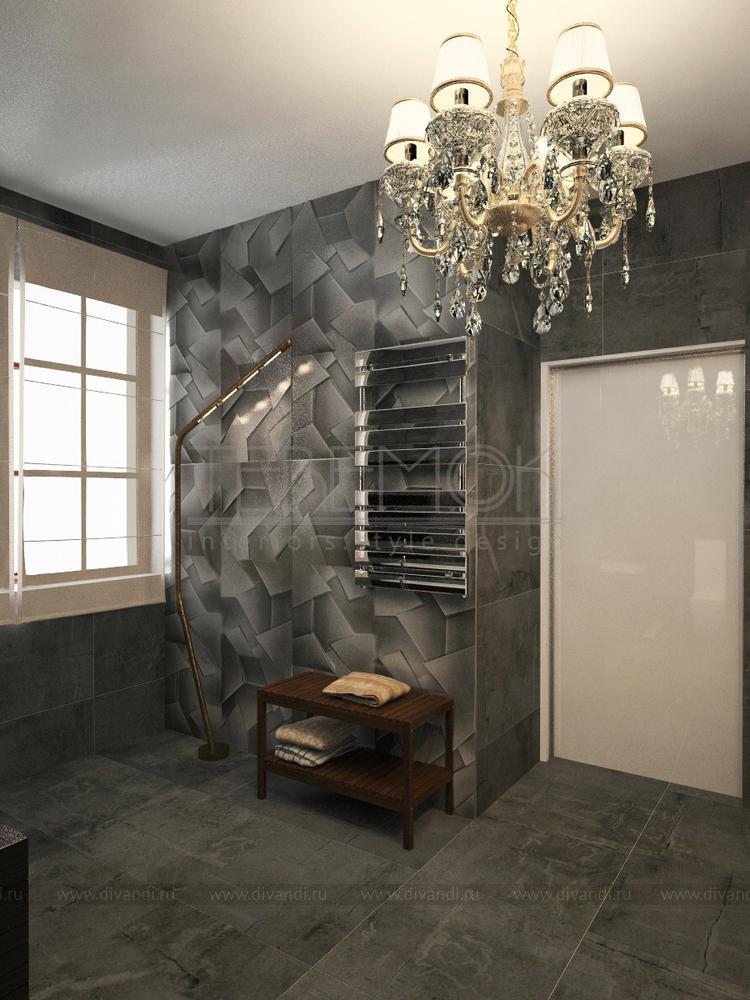 Наиболее популярной и надежной отделкой для ванной комнаты является керамическая плитка. Все дело – в ее свойствах. Она долговечна и многофункциональна, так как способна имитировать самые разные природные материалы. Материалы: 1.Керамогранит Apavisa Anarchy silver lappato prism 60x60 2. Керамогранит Apavisa Anarchy anthracite natural 60x60 3. Мозаика стеклянная однотонная Giaretta Морские камешки Black Moon