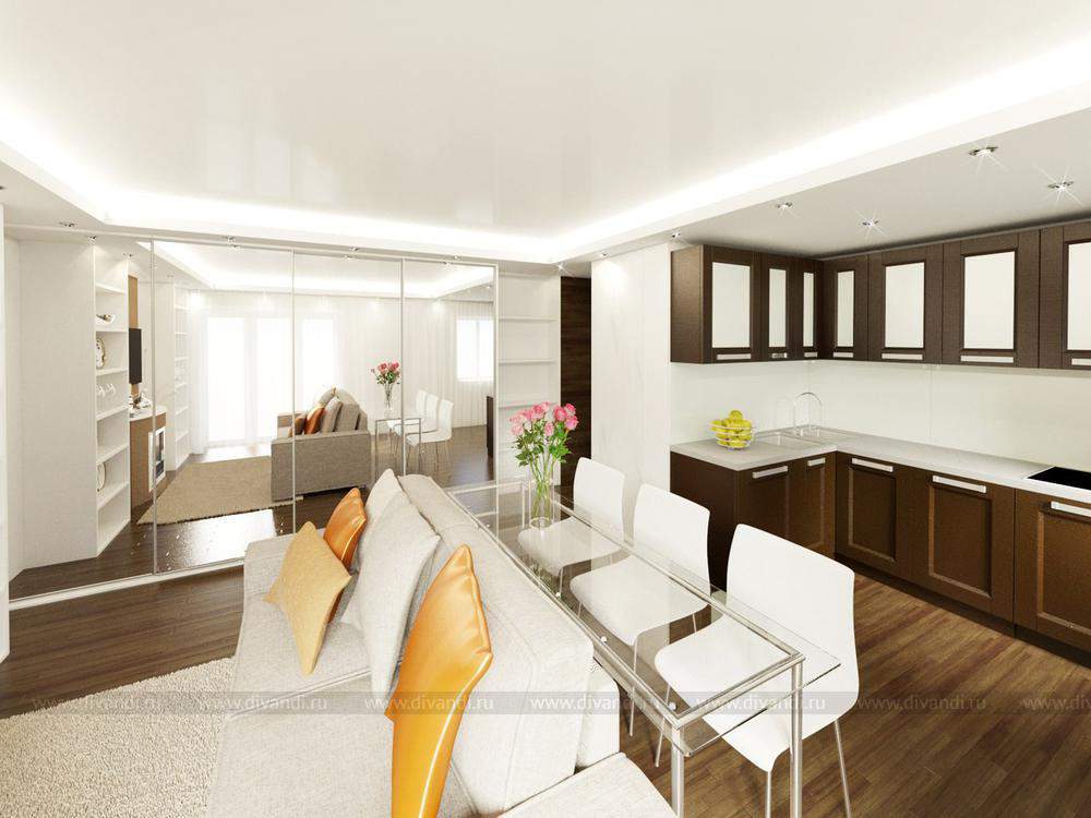 В интерьере квартиры - студии грамотно соединены практичность и стиль. Перед дизайнером стояла задача визуально расширить пространство, сделав его максимально удобным. Тщательно продуманная планировка позволила достичь желаемого результата. Плавный переход из обеденной зоны в гостевую сохраняет простор в комнате. Зеркальный шкаф, встроенный в стену, зрительно расширяет площадь помещения. Важным является то, что между зонами отсутствуют какие либо двери и перегородки, что лишь подчеркивает свободу планировки. Комната хорошо и равномерно освещена. Спокойные тона, отделка под натуральное дерево и пара ярких ноток в интерьере создают удивительное сочетание легкости и комфорта.