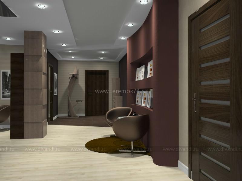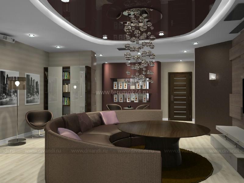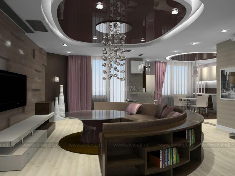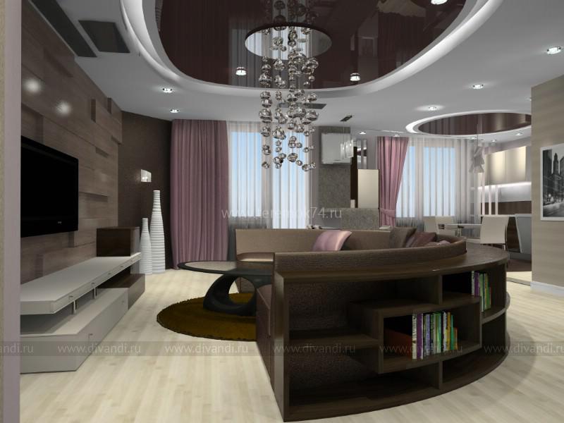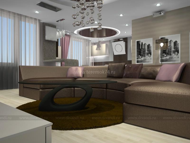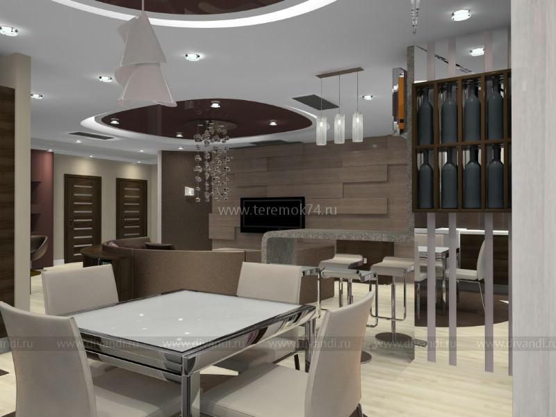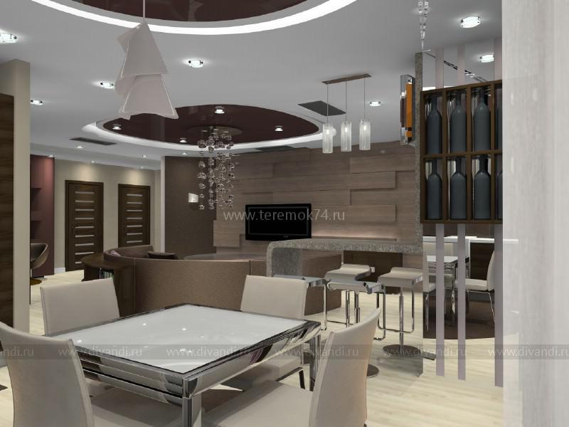 Главными задачами, поставленными перед нами при разработке данного проекта, было создание спокойного и уютного помещение, в котором прекрасно расположилась бы большая кухня с барной стойкой и бутылочницей, уютный большой диван для просмотра любимых фильмов в домашнем кинотеатре и большой прихожей. Кухня получилась действительно большая и просторная. В центре самой кухни мы разработали портал под углом из искусственного камня для варочной поверхности. В отделке фартука использован итальянский кафель под фактуру кожи. Сама кухня по отношению к гостиной расположилась на подиуме, в центре которого раскладка кафеля напоминающая окружность прекрасно сочетающаяся с вытяжкой и кругом на потолке с подсветкой. В центре кухни расположилась обеденная зона на 4-х человек, а при приеме гостей итальянский раскладной стол может вместить до 8-х человек. В гостиной комнате был выбран радиусный модульный диван российской компании, с системой полок для книг и аксессуаров. Также отдельной зоной выделена небольшая библиотека с креслом. Стена в зоне ТВ и колонна в прихожей - это плиты МДФ разной толщины, выпирающие на разных расстояниях от стены. Зеркалом в прихожей является зеркальная дверь-купе прячущаяся в стене, с одной стороны, и отделкой венге со стороны гостевого санузла.