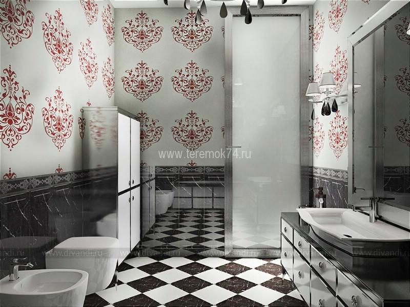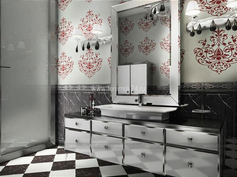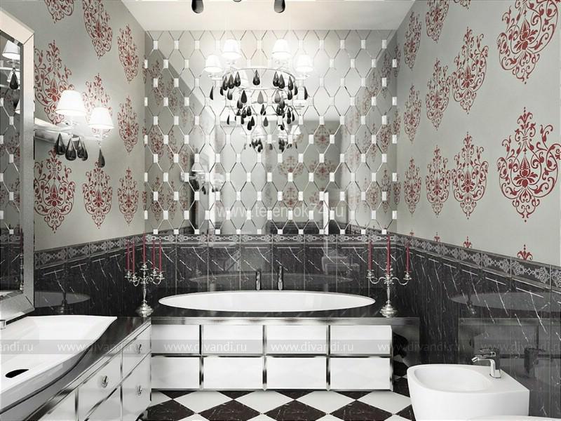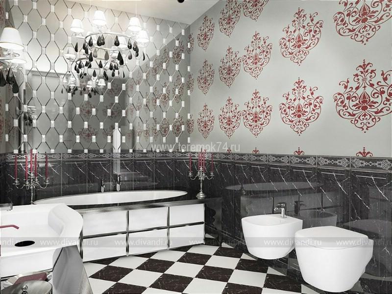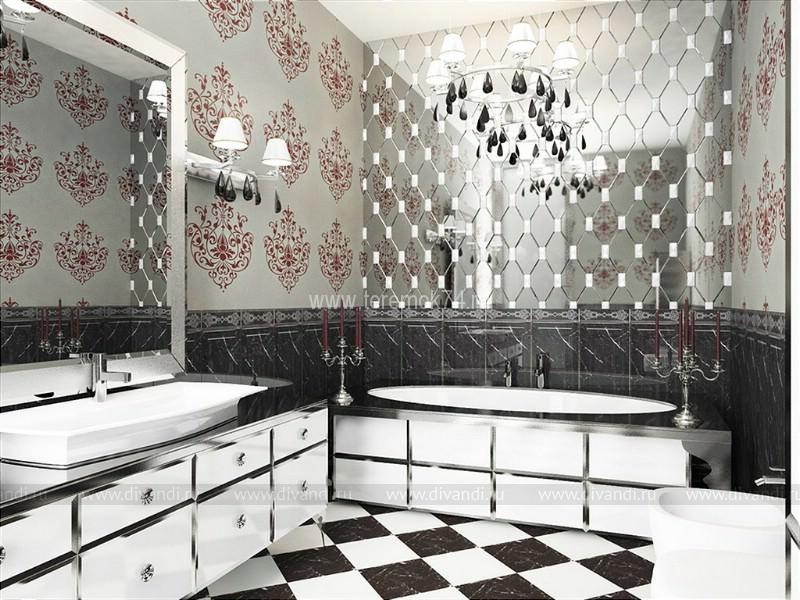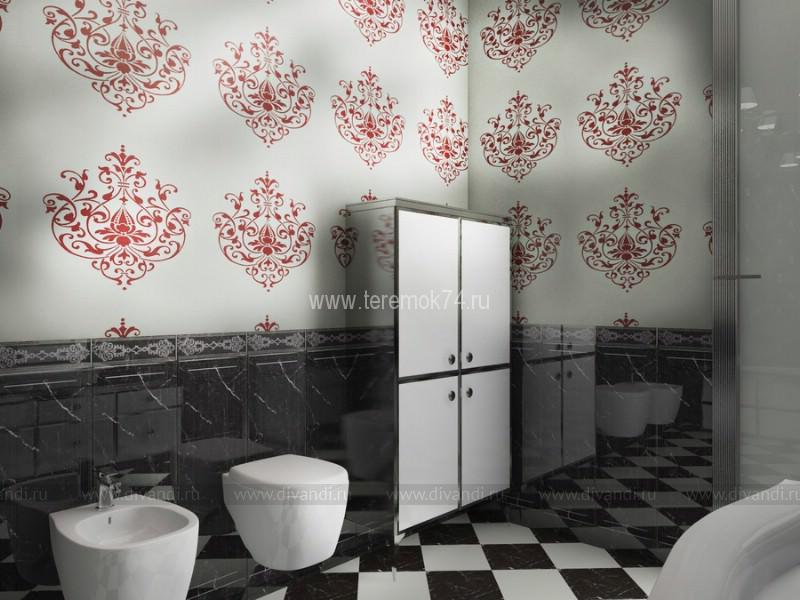 Для оформления стен санузла в этой квартире выбрана новинка 2012 года Piemme Valentino коллекция Crystal Marble. Темные оттенки мрамора и декоративные элементы этой плитки подчеркнули прямоугольную форму помещения, а настенный восточный вензель из декоративной штукатурки (по трафарету) добавили сюда красок. Как вариант, были предложены двери не стандартной высоты - около 3х метров от фабрики RES, благодаря этому интерьер приобрел величественность. Сантехника использована одна из самых наиболее шикарных и качественных на сегодняшний день - Milldue Majestic.