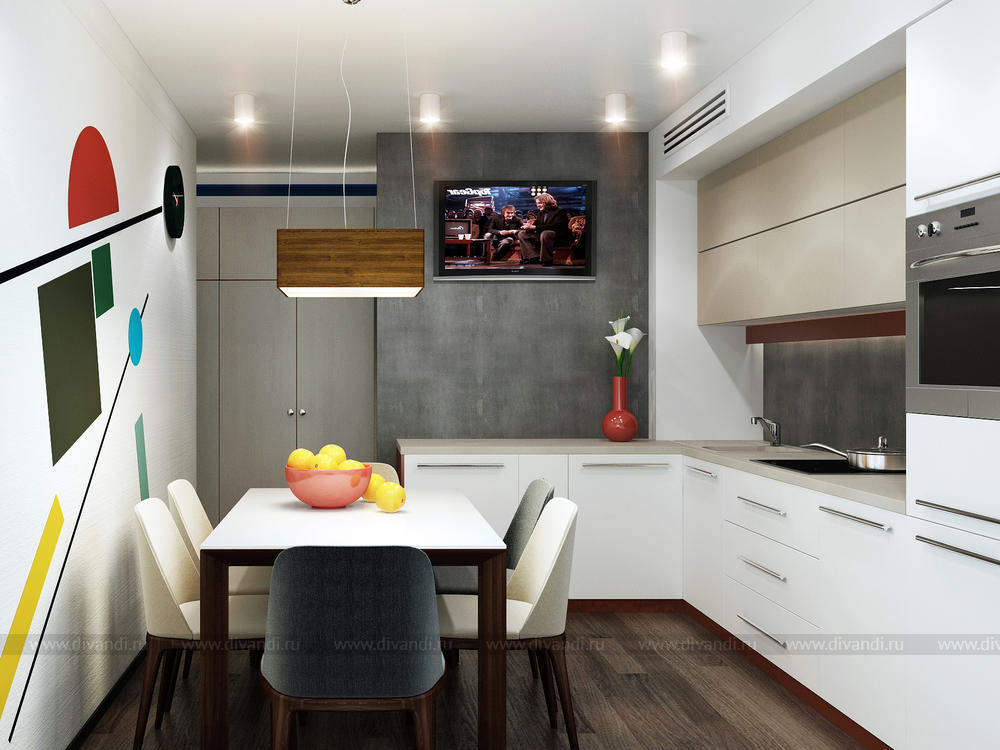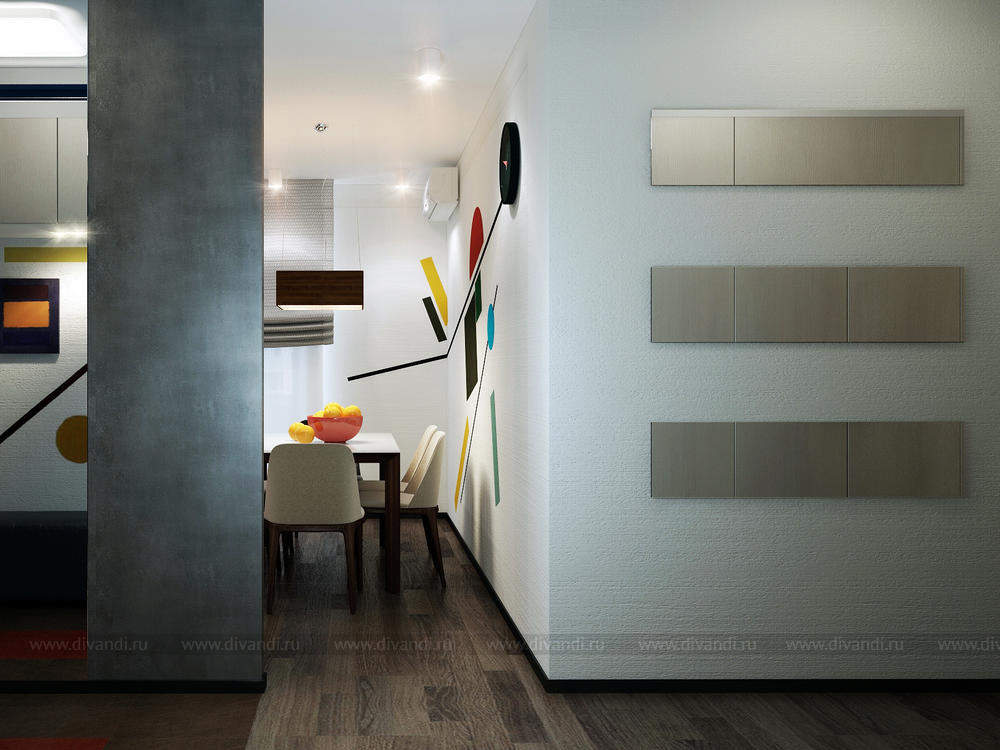 Квартира по ул. Волгоградская, выполнена в современном стиле с использованием супрематической графики в элементах мебели и декорировании в целом.