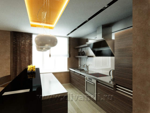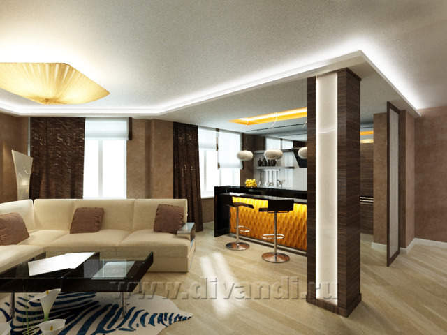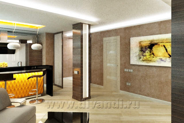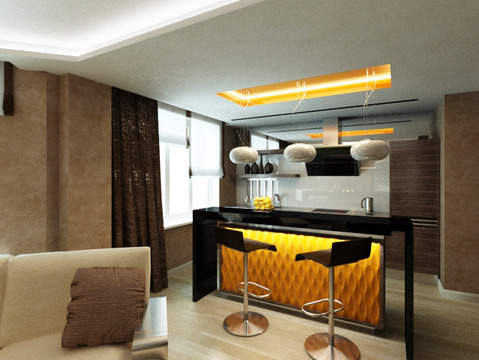 Цветовая палитра интерьера выдержана в едином стиле: стены отделаны декоративным покрытием шоколадного цвета, а пол, плинтуса и двери – светлое дерево. Кухонная мебель и мебель гостиной также выдержаны в едином стиле. Особое внимание уделено барной стойке – она стала композиционным центром помещения, притягивая к себе внимание ярким цветом и фактурой. Для декорирования фасада барной стойки была использования декоративная 3D панель фирмы ЛЕТО.